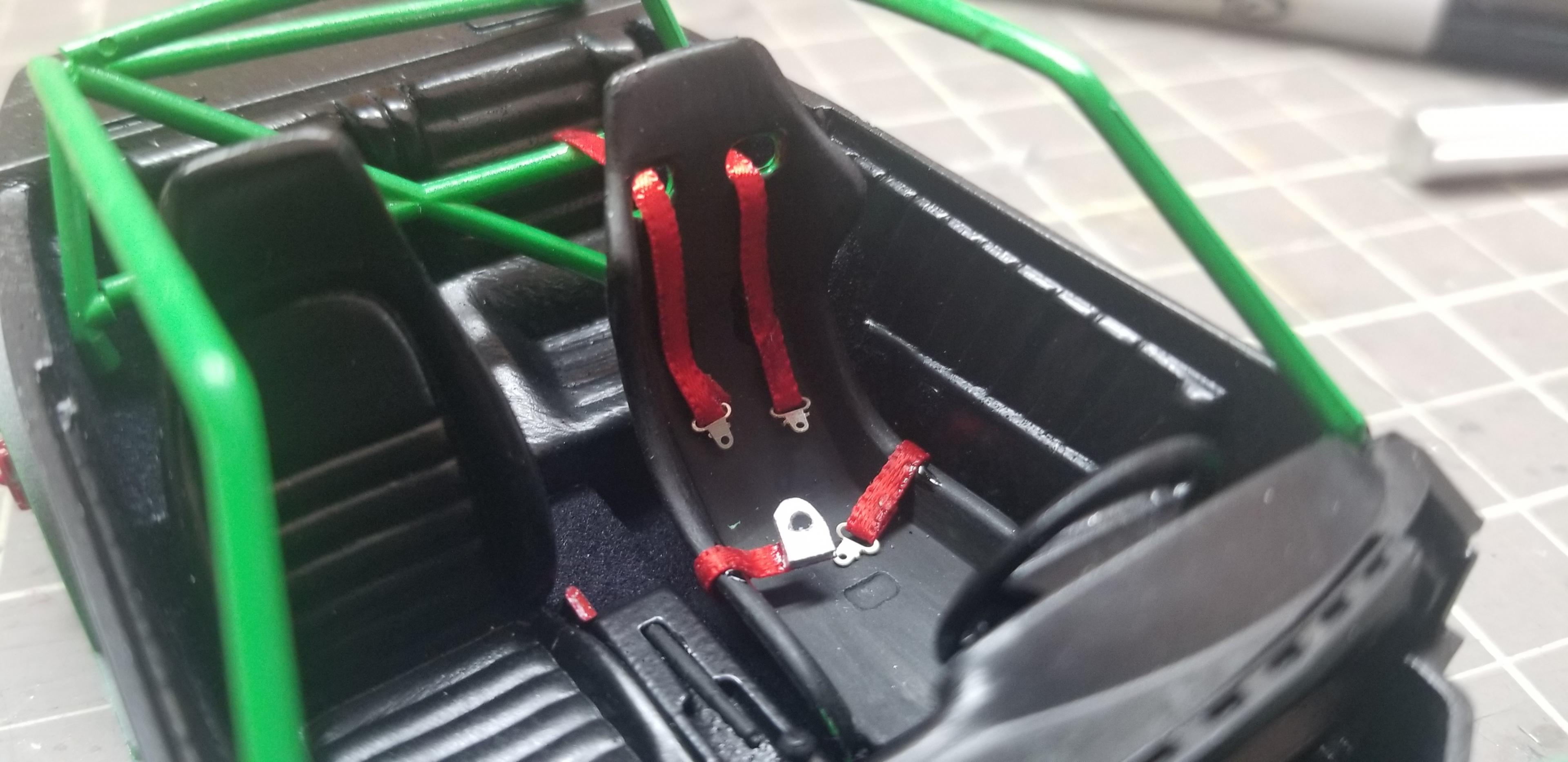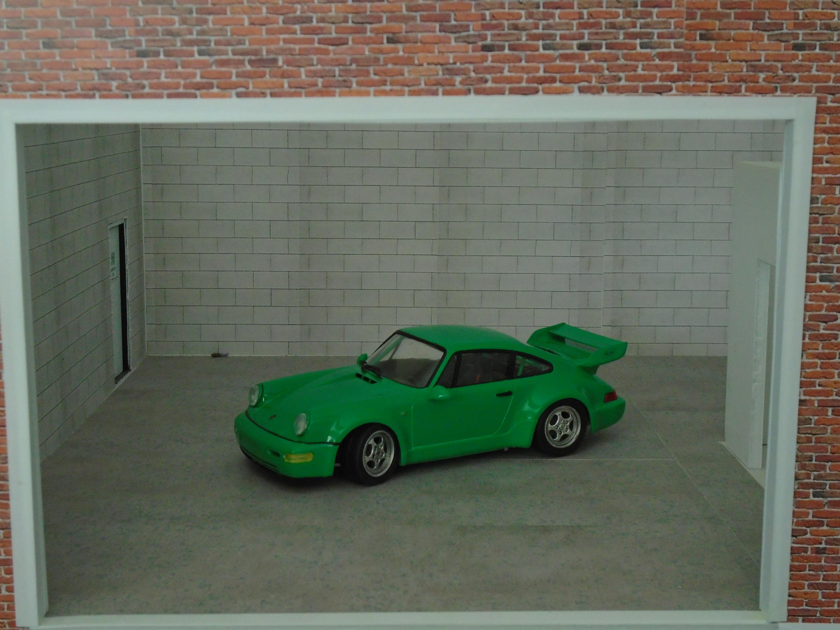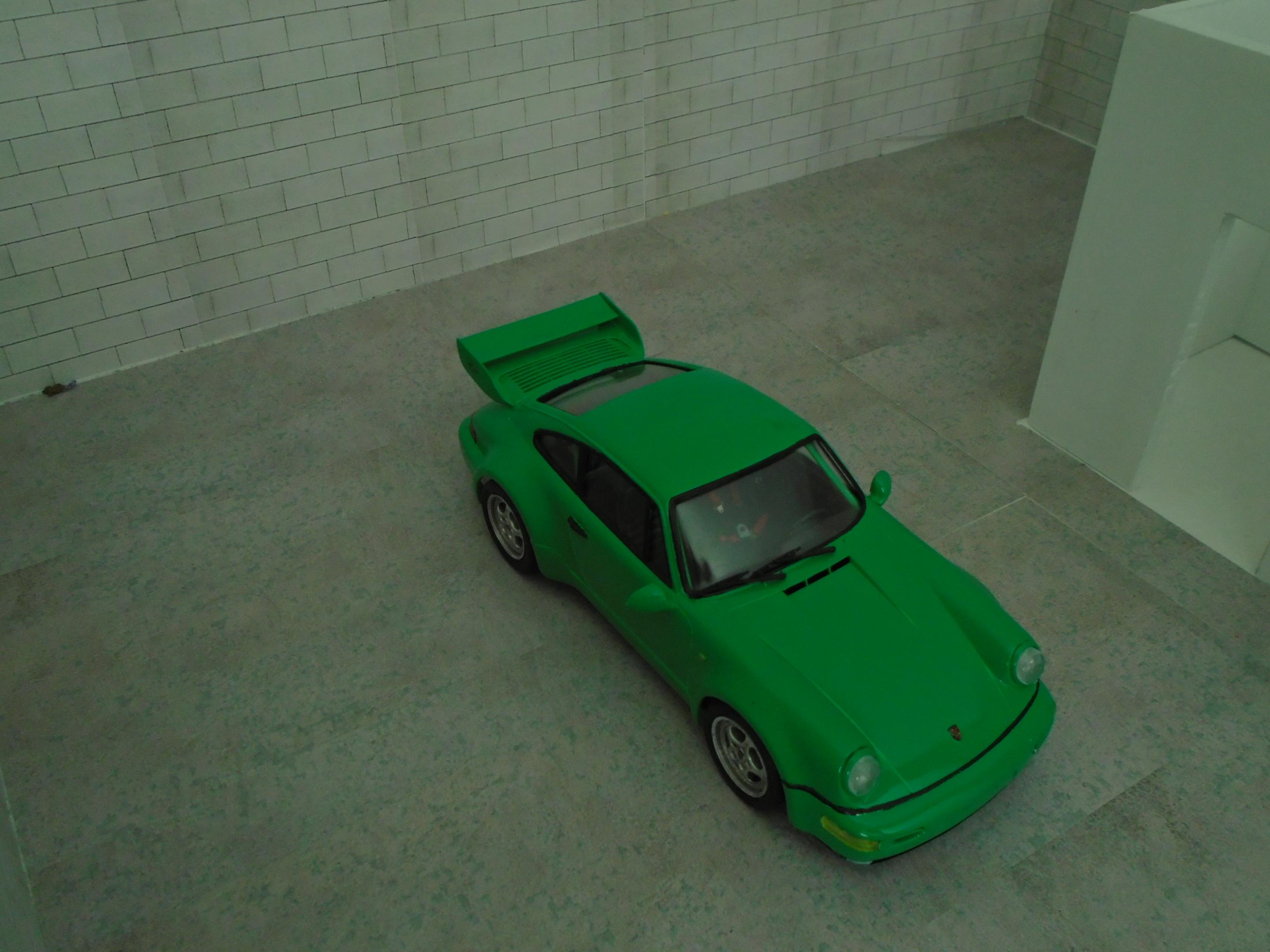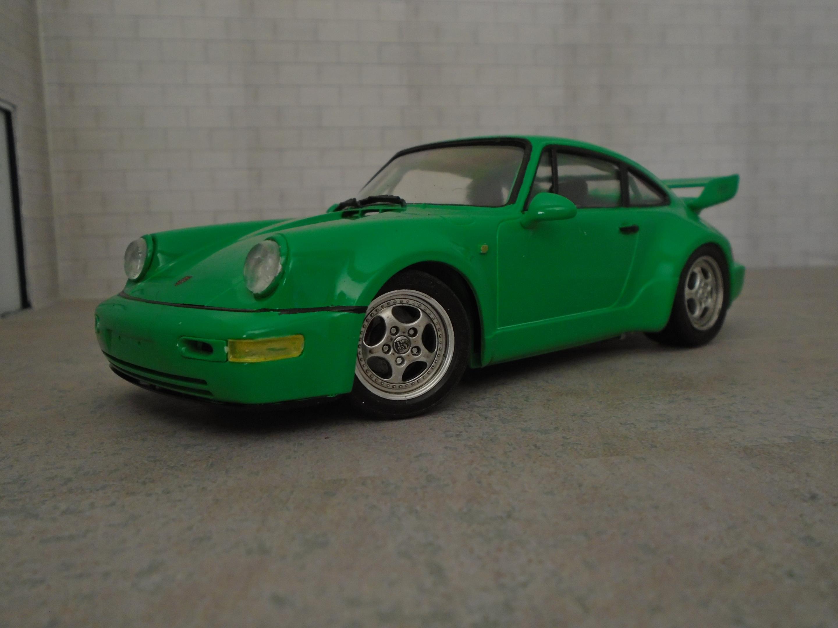 You know...I long for the days of low res cameras. These new cameras just seem to magnify things the naked eye misses. Anyway... This is Fujimi's Porsche 964 RSR kit. I avoided some of the RSR parts and did my own version of the 3.8 RS. Tamiya's TS35 Park Green does a decent job of replicating Porsche's Viper Green. Tamiya white primer, the Park Green, and Tamiya clearcoat. The interior is a semi-gloss black I had. I think it's a Duplicolor paint. The carpets are embossing powder. First time I've used that (I normally use flocking) and I like the results. I added some seatbelts too. Overall, a simple kit, looks good on the shelf. Just don't use a good camera to view it.