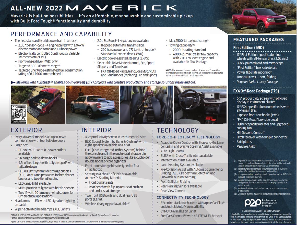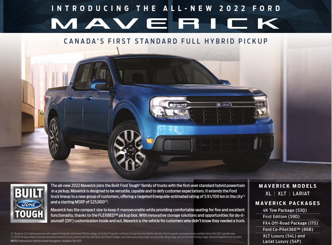 A lot of features, a hybrid engine, and a starting price of $26k CDN. Ideal for people that want a car with a big trunk. Or as Ford states, "the vehicle for customers who didn't know they needed a truck." I think Ford will sell a lot of these. And of course there's the new Hyundai Santa Cruz pickup. Same target market. Watch for others to introduce some competition over the next few years. -