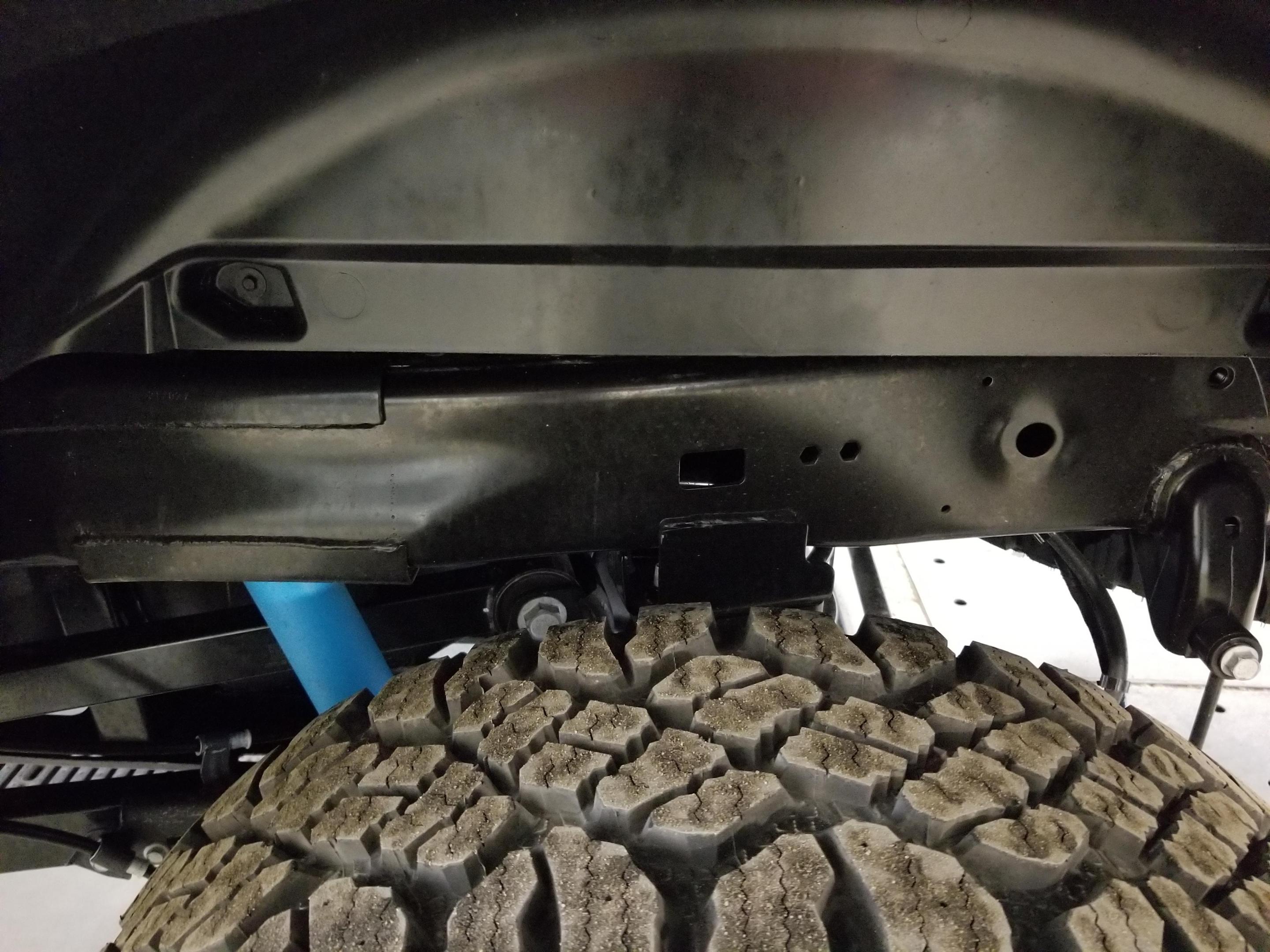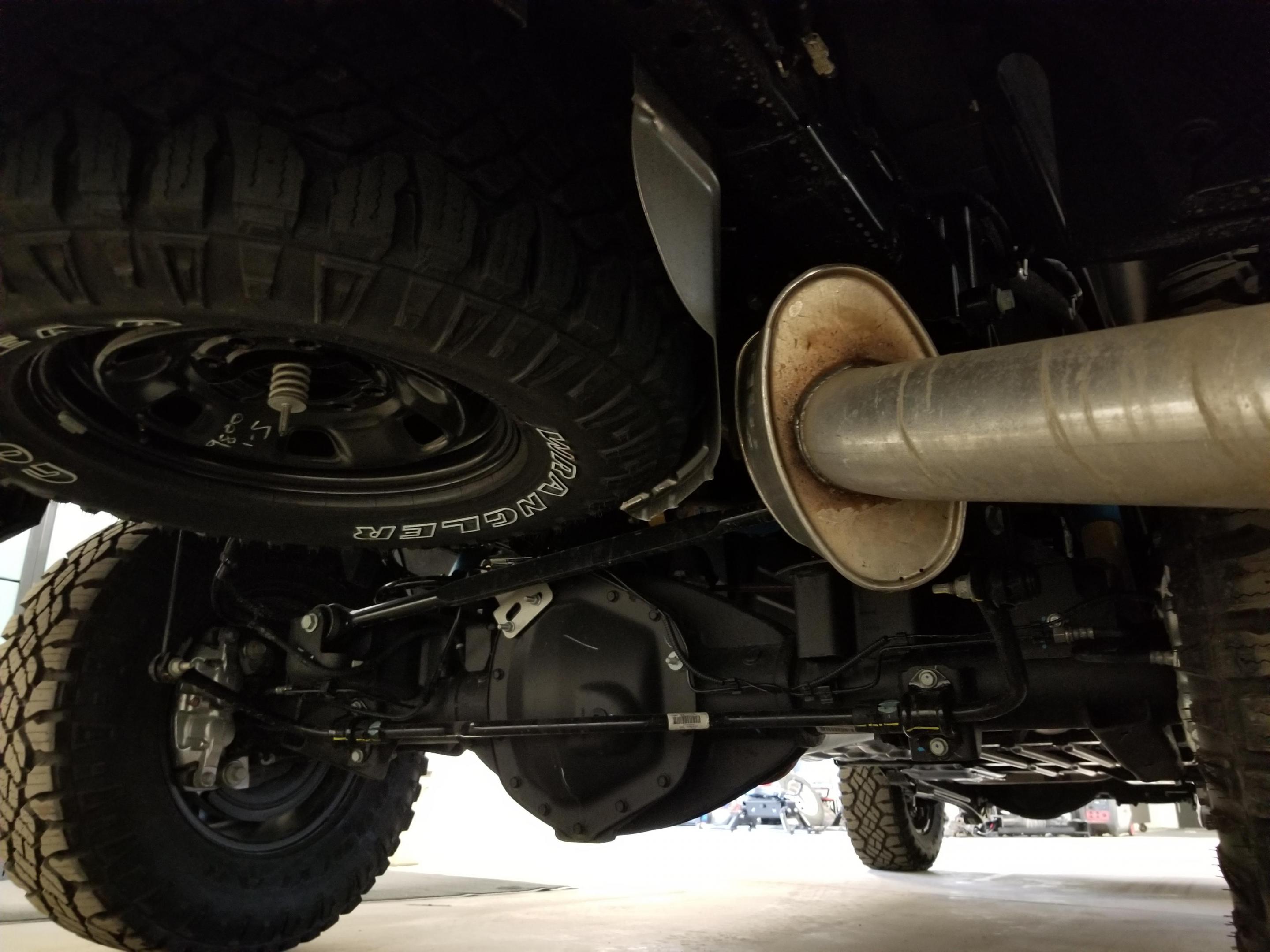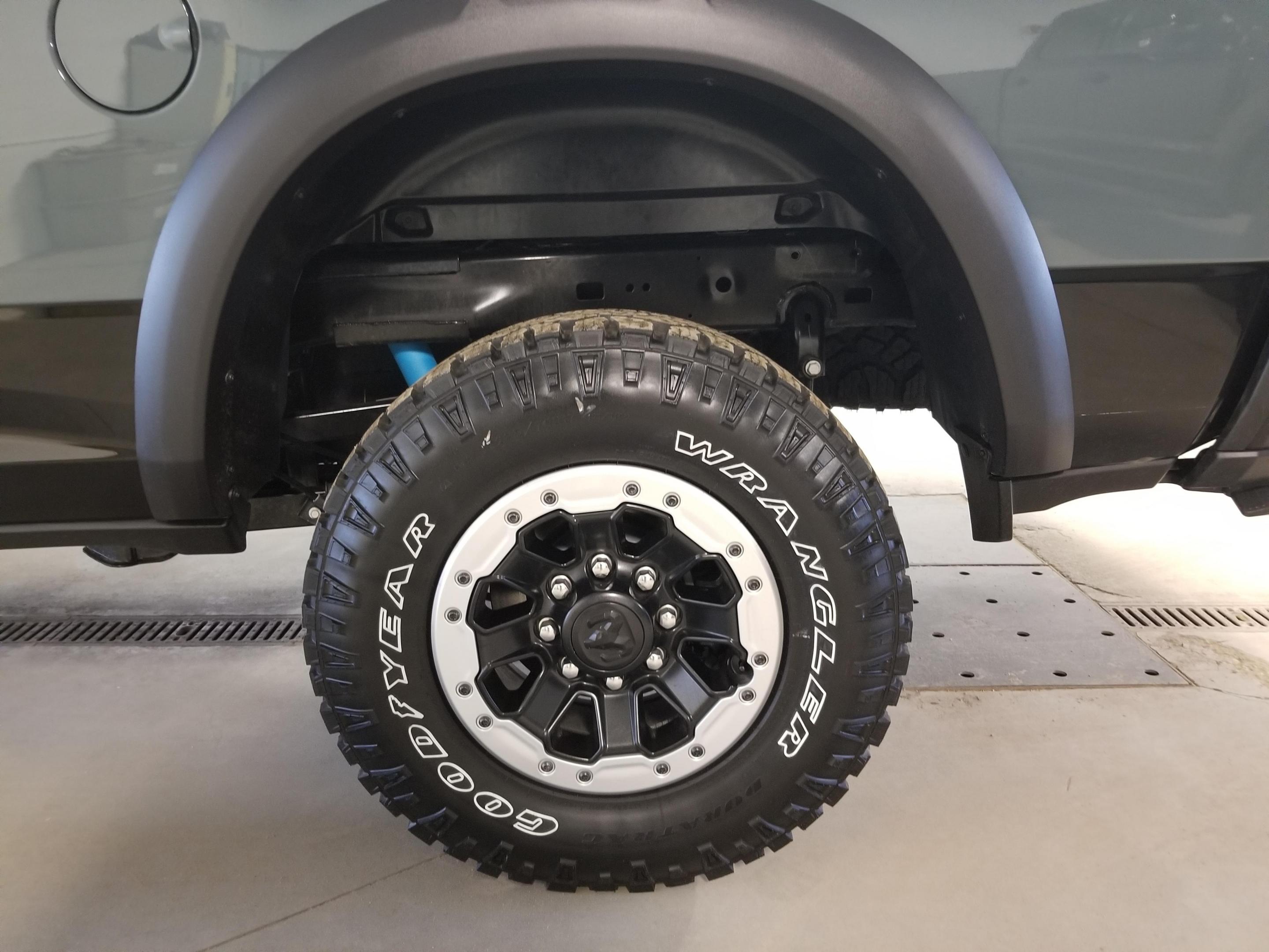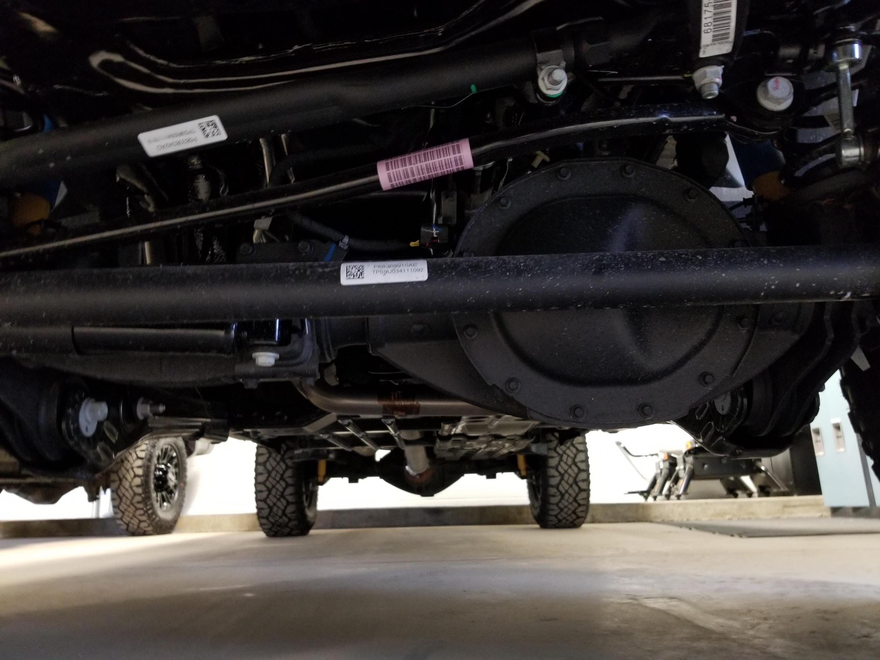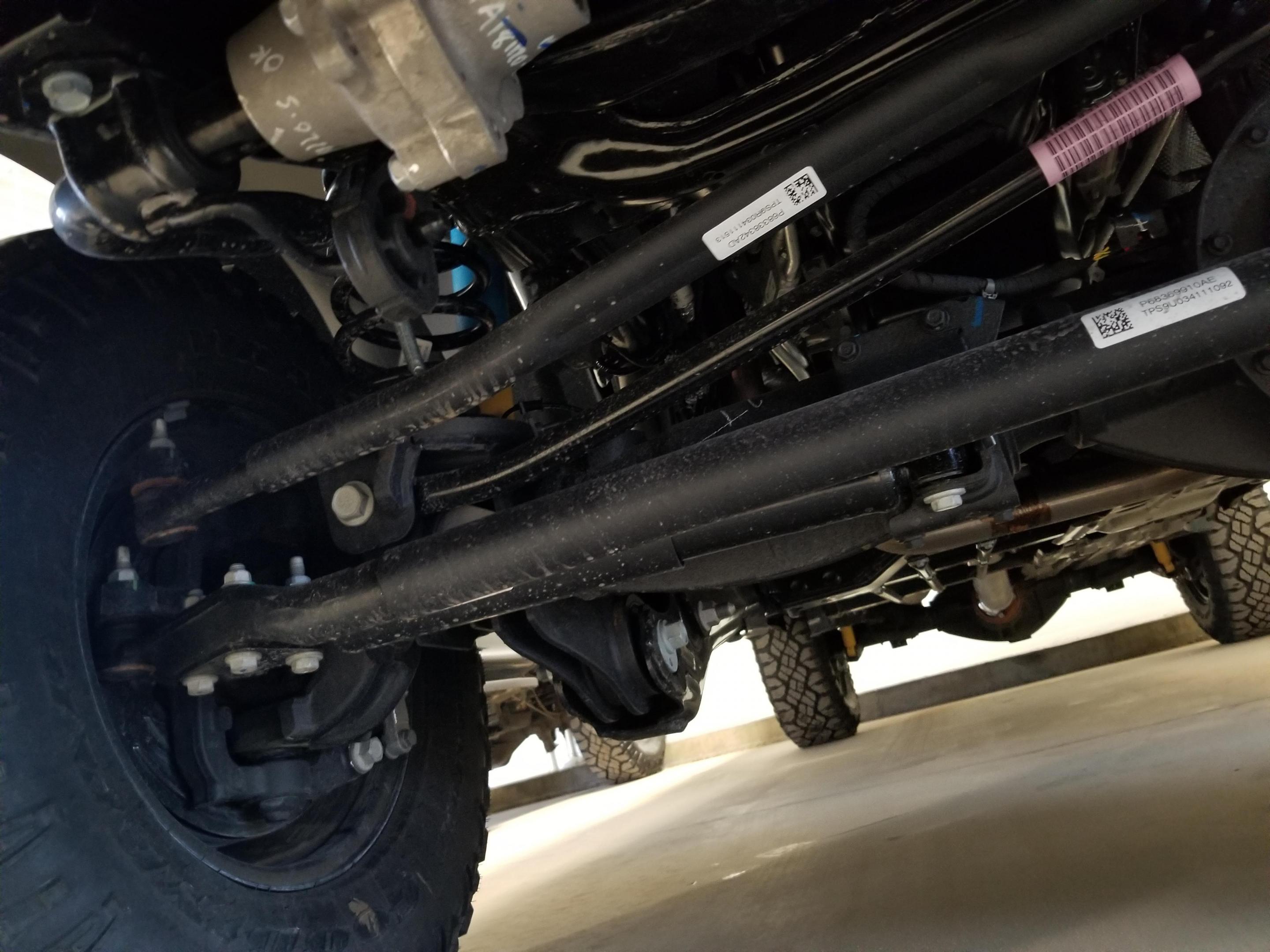 Wheels, suspension, underneath. Almost everything under this truck is either black or aluminum in colour. The shocks are Bilstein, so are the usual blue and yellow. All wheel wells have black plastic liners, so no paint is visible. Wheels on this model are new for 2021, and are beadlocks. I think the kit wheels could be easily modified to match this look if so desired. The spare is not an alloy wheel. I haven't actually checked the kit to see what it came with for a spare. Just about every bolt underneath is silver in colour. All of the parts ID stickers are white, except for the one on the front track bar (or whatever that is), which is pink. On to the pics Driver side front Driver side rear Passenger side rear Chassis pics taken from passenger side.