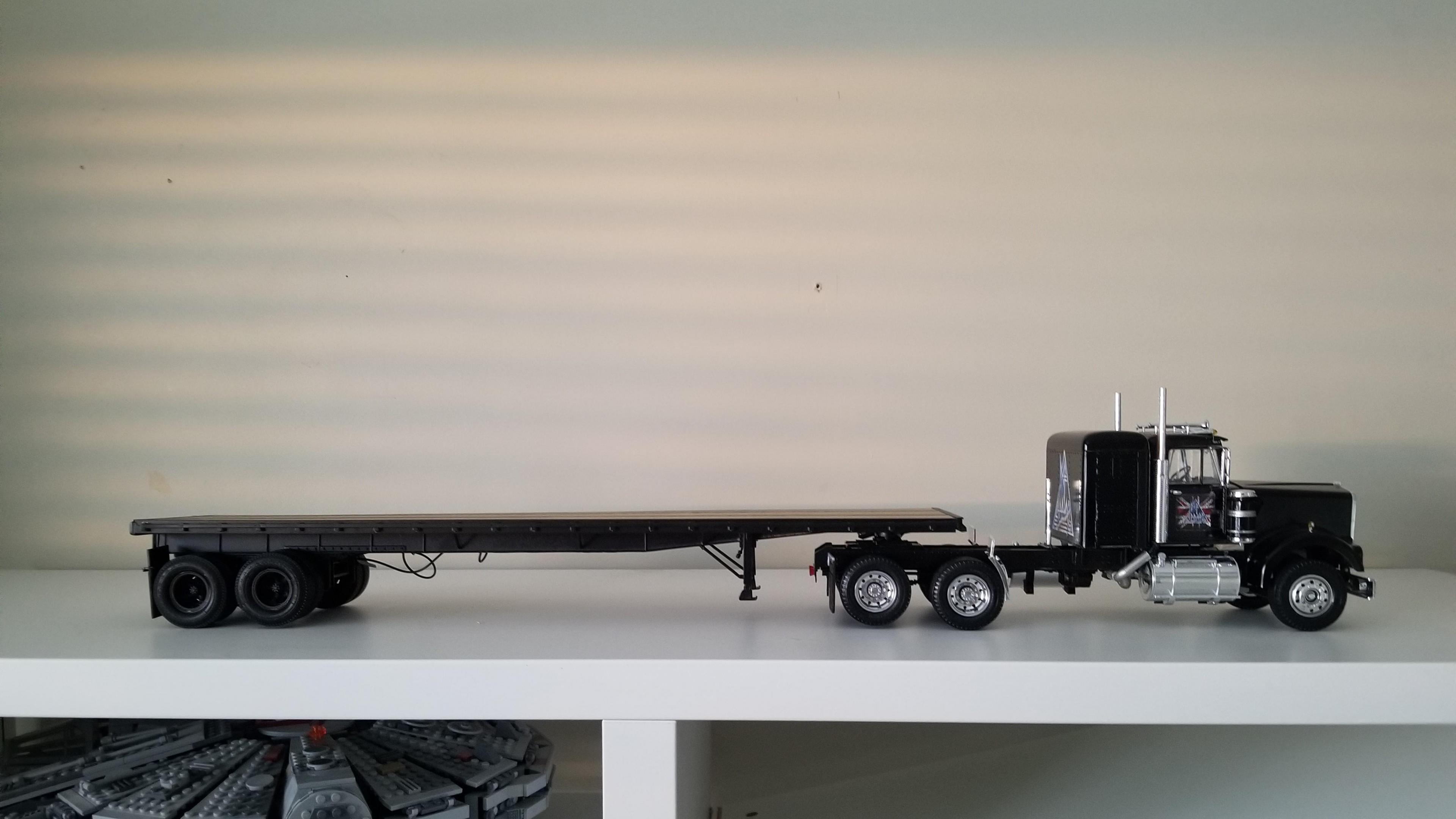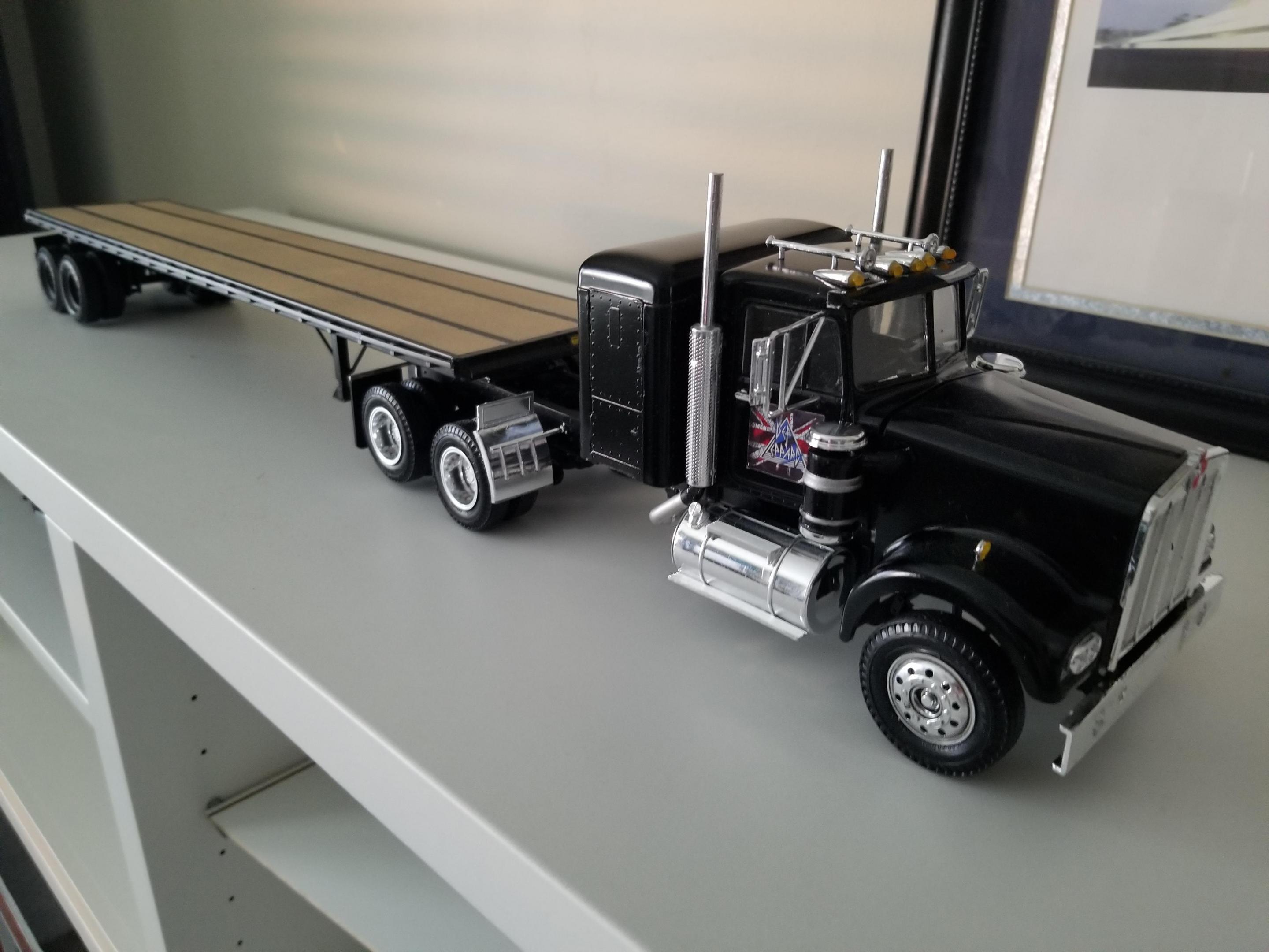 Well, my first completed build of 2021. Wish I could say that I was happy with it, but right now I'm just happy that it's done. I started this one in 2017, with an idea. Went hunting for a kit, and found this one. It's an original issue of AMT's W925 kit. The box was a little worse for wear, but the kit appeared to be complete. I said appeared to be complete, because I soon found out it was not. But it did have some extra parts from a Pete kit. Had to scrounge and trade to find some detail parts. Never did find headlight lenses, so I left them. Typical old school AMT kit. Instructions are incredibly vague and reference part numbers that don't appear anywhere on the trees. Not that it mattered, as most of the parts were no longer attached to the trees, so it was a guessing game most of the time. Especially for me, as I'm no truck expert. Anyway, apparently the original issue kits are somewhat hard to find and somewhat desirable because of the torsion bar rear end that was changed for later reissues of the kit. I've also heard that the torsion bar set up is challenging. Well my meager skills managed just fine, as the kit sits level, everything lines up, and all wheels sit on the ground evenly. I finished the wheels before I learned about the window backer rod trick. Nothing to really discuss regarding the engine. I didn't do any additional detailing on it, and there were a few pieces missing, so I pretty much just assembled it, sprayed it, and stuck it in place. Strange issue with this kit though. The hood appears to be too short. I lined everything up, installed everything, and everything seems to fits, but the hood is a few millimeters short. I double checked where the engine mounts, the cab mounts, and the hood hinge pins attach, and it is indeed a little short. Luckily, painting it black hides it, as does adding the air cleaners. I've since touched up the wipers with a Molotow chrome pen. Also added a trailer to this one. Super easy to put together, again, just wanted to get it done so I didn't go too hard with detailing. And here's the finished result. Want to guess what my soundtrack was for a lot of this build? At the end of the day, this was not a totally enjoyable build for me. The fit issues bug me, and the constant hunting for parts just sucked a lot of the fun out of it for me. Still, even the poorest of kits are fun to put together, and I learned a few things for the next one. And it looks okay on the shelf. As long as it's at the bottom, in the shadows. lolz. On to the next one...