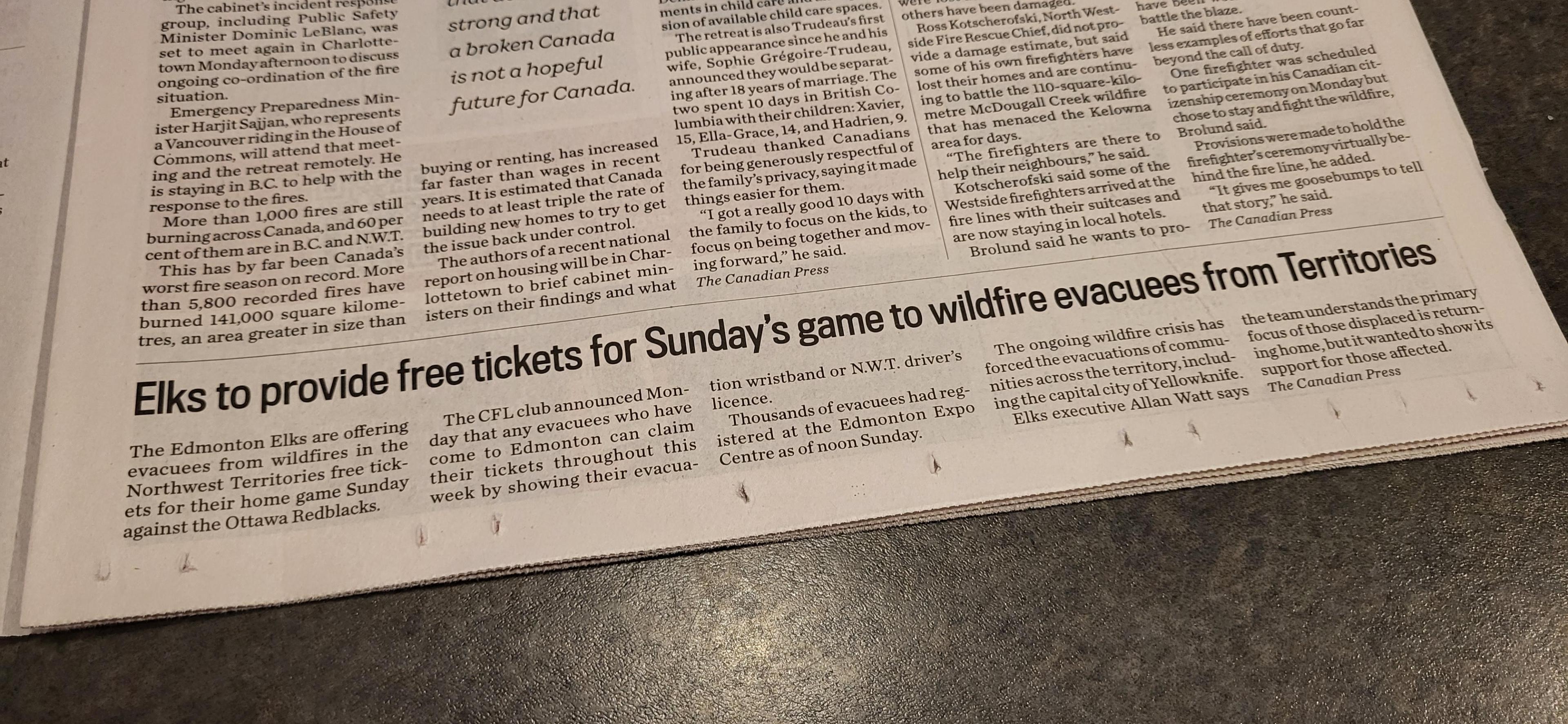 Some background. The entire city of Yellowknife in the Northwest Territories has been evacuated due to massive forest fires. It's crazy. So the evacuees are making their way here to Alberta. The Edmonton area will have thousands of these people spending some time here. Can't imagine what this would be like. Having to evacuate, not knowing if you would have a home anymore. Crazy. The Edmonton Elks are our CFL football team. They currently have the dubious honour of being the professional sports team, IN ANY SPORT EVER, with the longest at home losing streak. We haven't won a game at home since 2019. Won our first game of the season over the weekend. Season is half over right now. I don't think we won a game at all last season. Then I see this headline in today's paper, and I chuckled a little. Haven't these people suffered enough? I mean really.