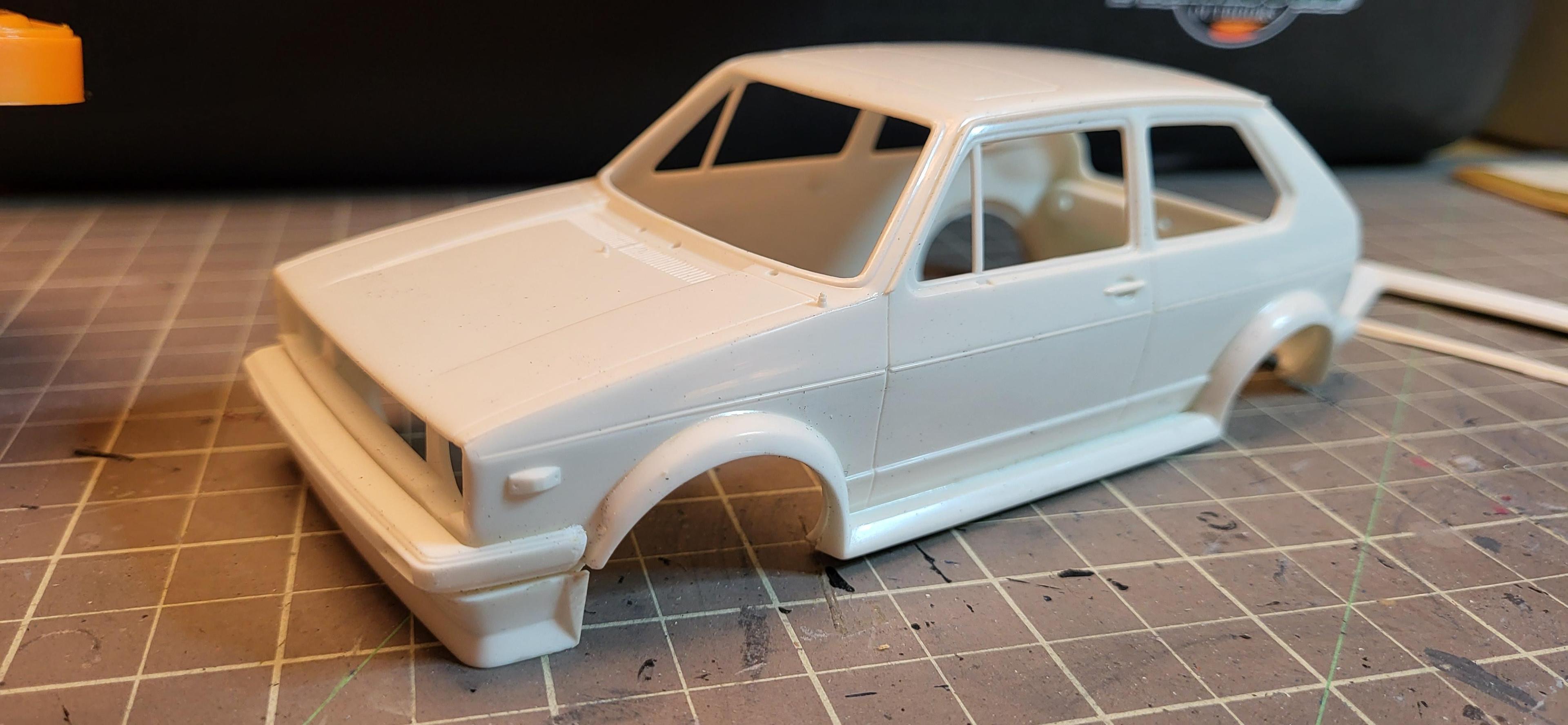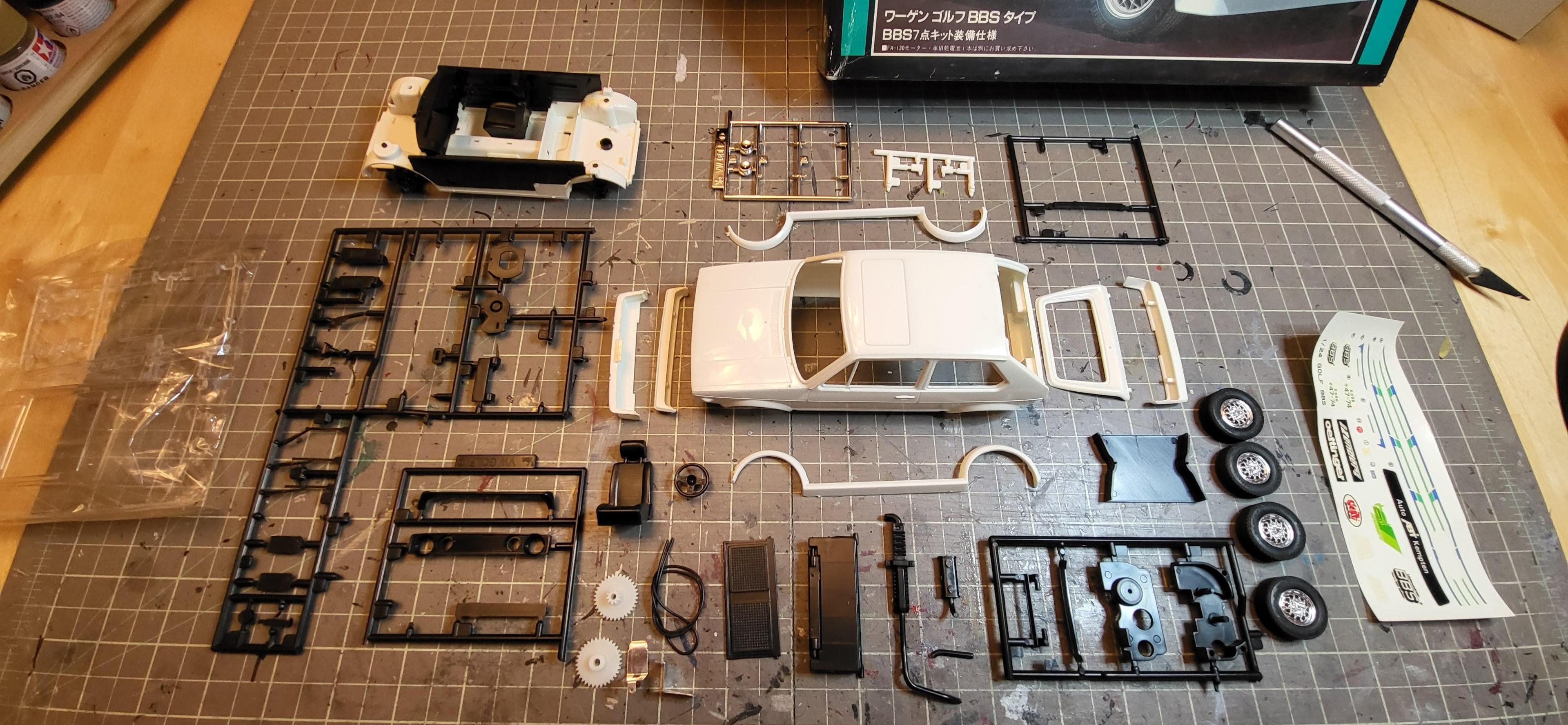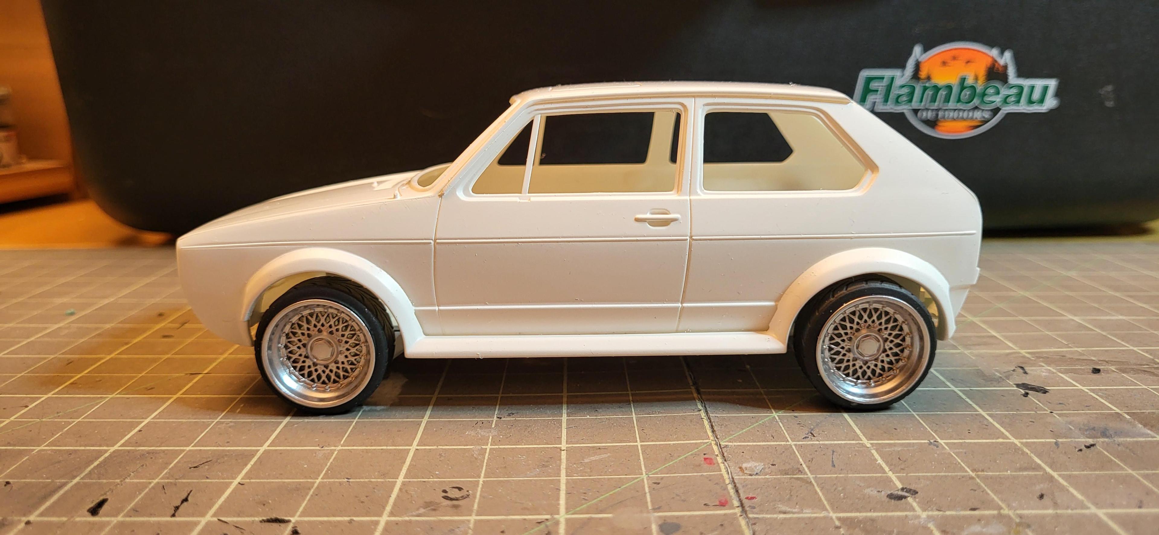I don’t do a lot of WIP threads, mainly because I usually forget to take pics. So lets see how this one goes. I’ve been a VW fan for years. Literally since I was a kid, before starting school. My fav toy when I was 4 or 5 was a green diecast Beetle. A few years later, I got a job detailing cars for a local VW/Porsche dealer. I got to drive not only new Porsches, but also new GTIs, Corrados, etc. In the years since, I’ve owned a few VWs, and will probably see another show up in my garage sooner rather than later. So when I was able to purchase a handful of VW kits from a friend who was clearing out his collection of VW merch, I jumped at the chance. This is the VW Golf BBS kit by Nitto This is an older kit, and is certainly indicative of the time. Originally issued in 1983, this is Nitto’s Golf BBS Kit Type. Odd name to be sure. This is a very simple kit and like many of the Japanese kits of the 80s, was originally designed to be motorized. It has a very basic interior, and what looks to be a well proportioned body. It also appears to be accurate, as this does look like the BBS aero kits that were available in the 80s, and are highly sought after now. I find it interesting that Nitto included ABT, Zender, and Oettinger decals. For those unaware, ABT are a VW/Audi tuning company and have been around since the 70s. What’s even more interesting is that a 1986/1987 reissue of this kit had it branded as a BBS Oettinger Golf, with Oettinger being another German tuning company. Zender where also huge into body styling on Euro cars back in the 80s. The kit is molded in white, black, and clear plastic. There is a chrome tree, but it’s just wheels and two lights. The tires are a soft rubber, and have held up well over the years. Decals are full colour and will hopefully be useable. As I received it, the kit had been started. Poorly. Luckily, no paint was used, but whoever started it used glue quite liberally, so disassembly took a bit. First, I focused on the body, sanding off mold lines and attaching the side skirts. I shaved the front marker lights too, as they looked too big in my opinion. I hit it with some Tamiya white primer, resanded, primed again, resanded, then shot the Tamiya Gloss White paint.