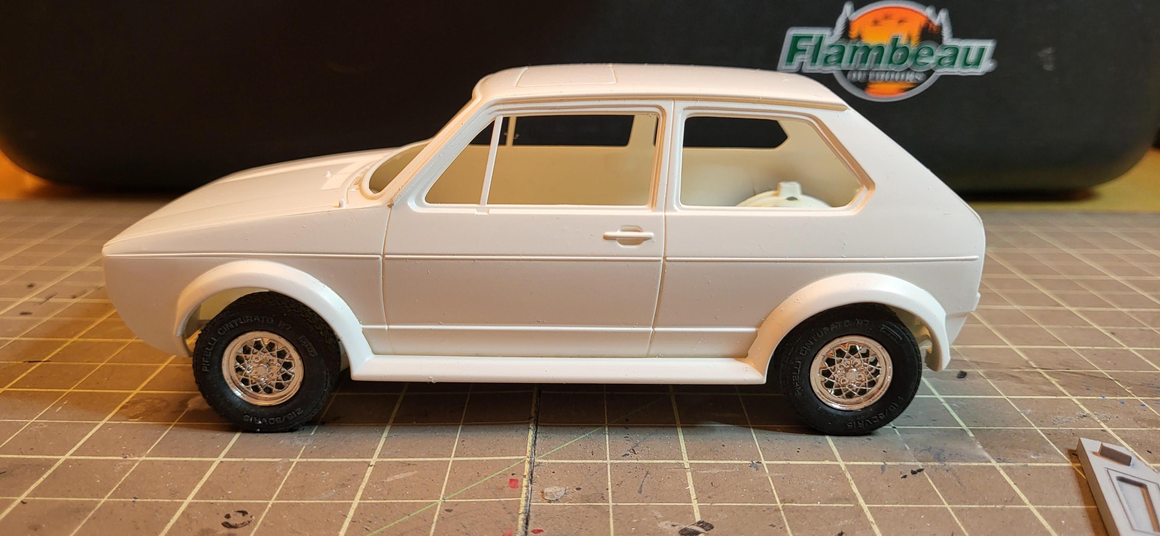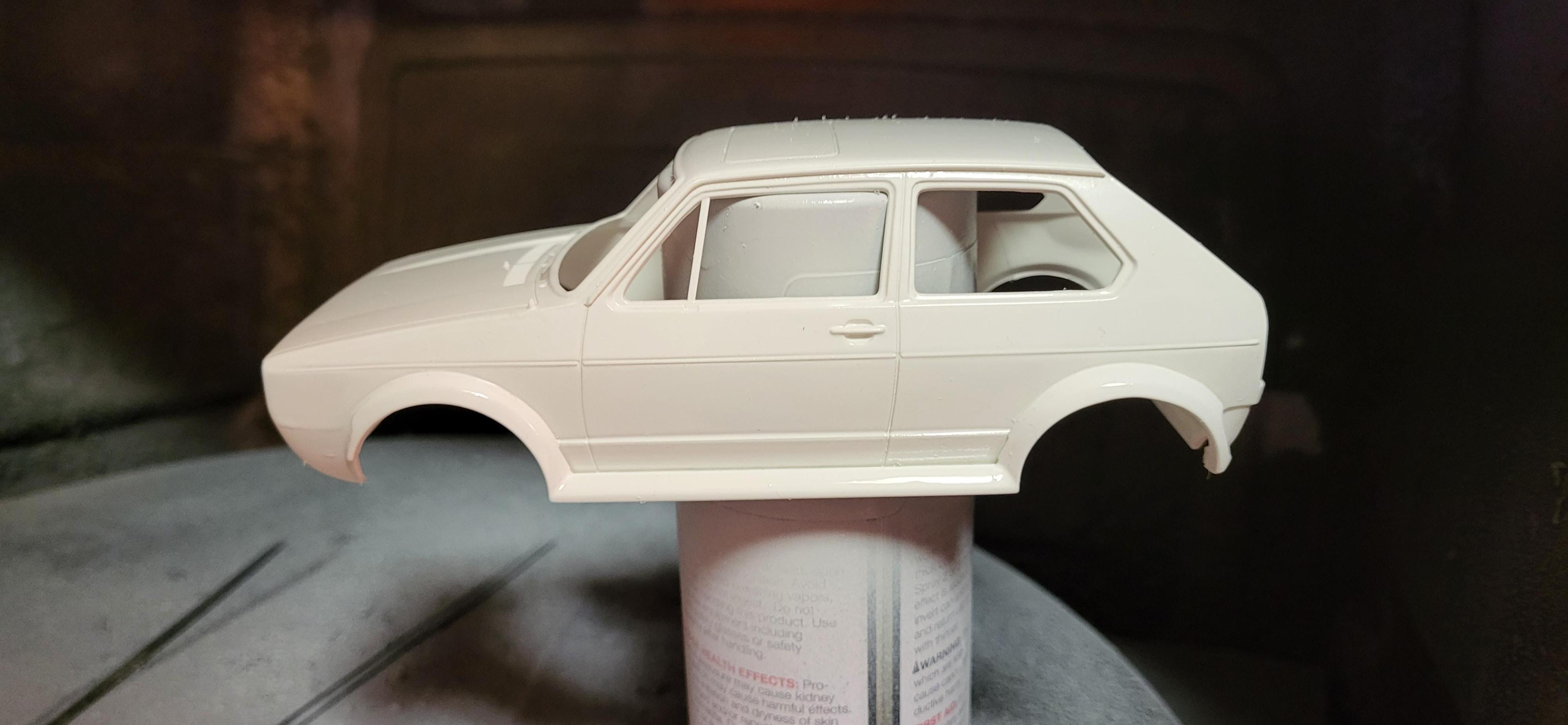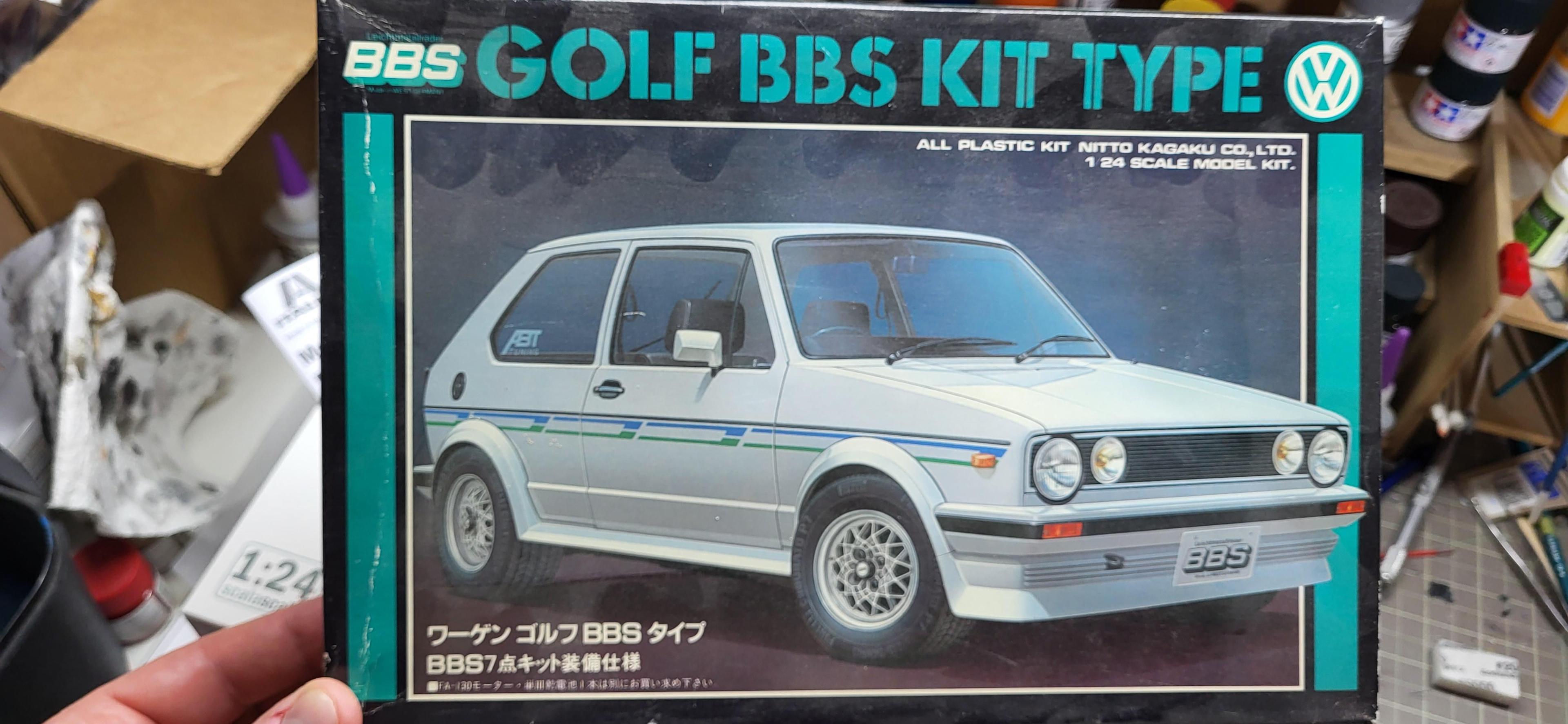 I don’t do a lot of WIP threads, mainly because I usually forget to take pics. So lets see how this one goes. I’ve been a VW fan for years. Literally since I was a kid, before starting school. My fav toy when I was 4 or 5 was a green diecast Beetle. A few years later, I got a job detailing cars for a local VW/Porsche dealer. I got to drive not only new Porsches, but also new GTIs, Corrados, etc. In the years since, I’ve owned a few VWs, and will probably see another show up in my garage sooner rather than later. So when I was able to purchase a handful of VW kits from a friend who was clearing out his collection of VW merch, I jumped at the chance. This is the VW Golf BBS kit by Nitto This is an older kit, and is certainly indicative of the time. Originally issued in 1983, this is Nitto’s Golf BBS Kit Type. Odd name to be sure. This is a very simple kit and like many of the Japanese kits of the 80s, was originally designed to be motorized. It has a very basic interior, and what looks to be a well proportioned body. It also appears to be accurate, as this does look like the BBS aero kits that were available in the 80s, and are highly sought after now. I find it interesting that Nitto included ABT, Zender, and Oettinger decals. For those unaware, ABT are a VW/Audi tuning company and have been around since the 70s. What’s even more interesting is that a 1986/1987 reissue of this kit had it branded as a BBS Oettinger Golf, with Oettinger being another German tuning company. Zender where also huge into body styling on Euro cars back in the 80s. The kit is molded in white, black, and clear plastic. There is a chrome tree, but it’s just wheels and two lights. The tires are a soft rubber, and have held up well over the years. Decals are full colour and will hopefully be useable. As I received it, the kit had been started. Poorly. Luckily, no paint was used, but whoever started it used glue quite liberally, so disassembly took a bit. First, I focused on the body, sanding off mold lines and attaching the side skirts. I shaved the front marker lights too, as they looked too big in my opinion. I hit it with some Tamiya white primer, resanded, primed again, resanded, then shot the Tamiya Gloss White paint.