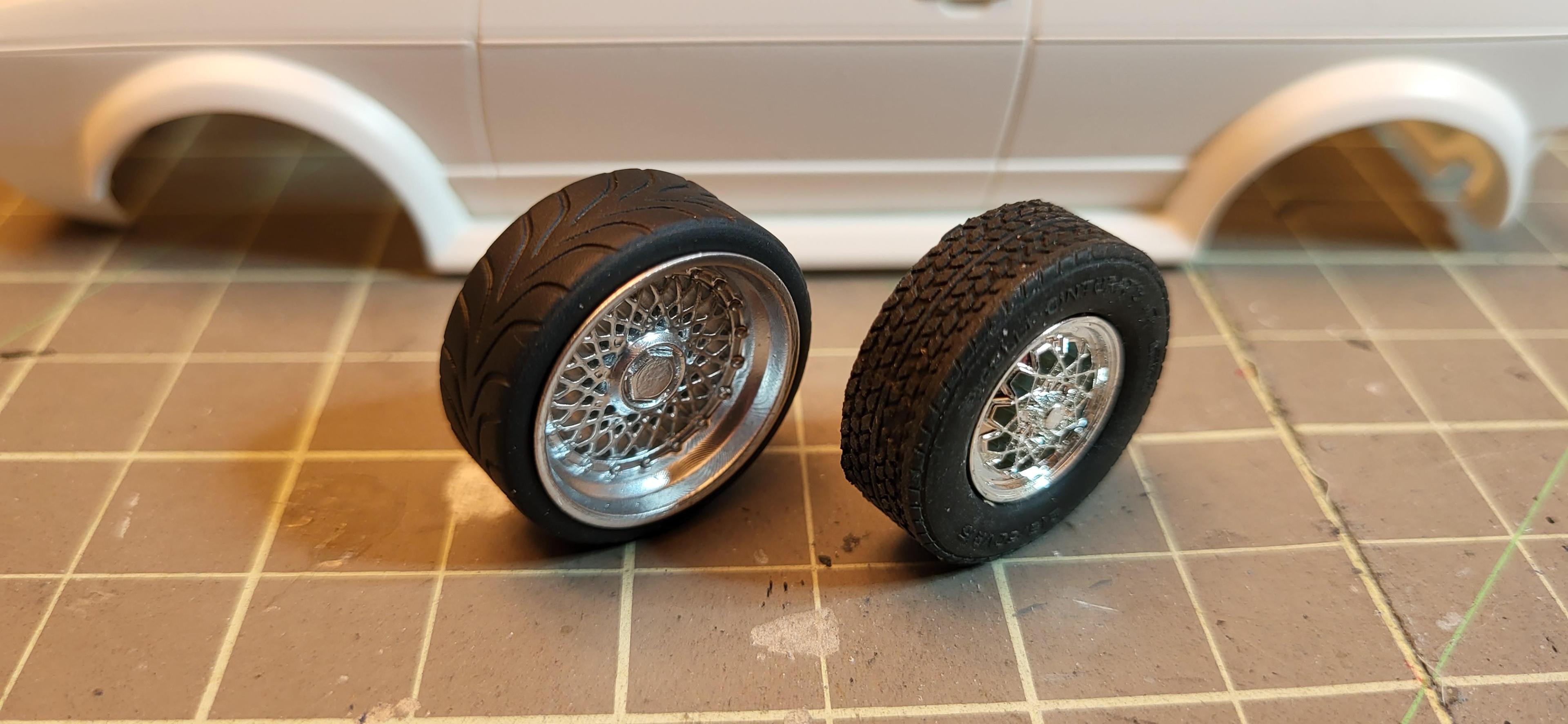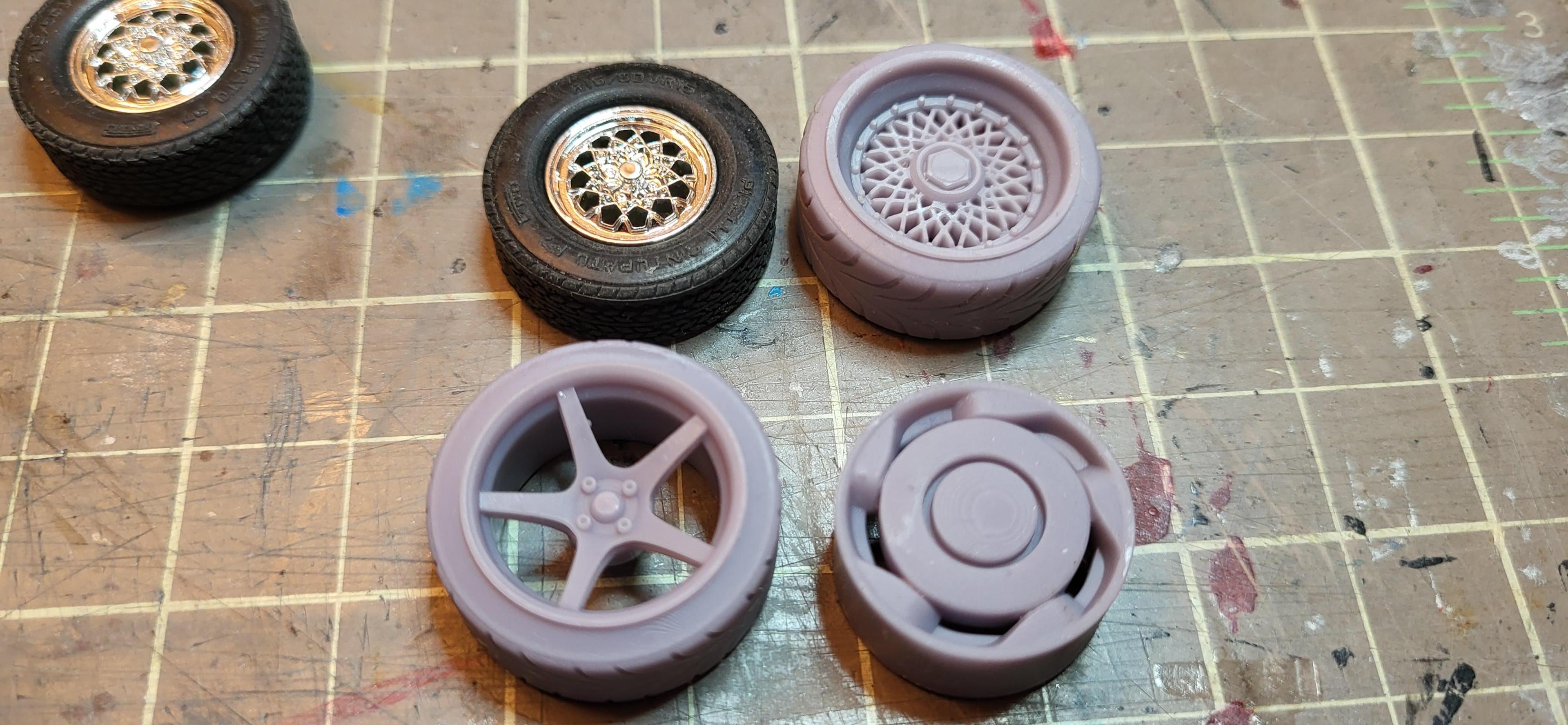 The kit wheels are horrible. Just terrible in every way. So it was off to 3D print some options. I printed a few styles to try out. First up was a 5-spoke wheel, followed by a set of BBS RS wheels. Then I tried a set of VW Orbital wheels. I thought they all looked pretty good, but as this is a “BBS Edition” car, I chose to go with the BBS wheels. My first set scaled out to be around 17” diameter. I hit them with gloss black paint, then with some Duplicolor chrome. The tires were painted with Tamiya Rubber Black. Whoa. I initially thought I’d go with a chrome lip and gold mesh, but after spraying this, all chrome was the way to go. I thought these turned out great. But then I mocked them up with the body, and they looked too big. So it was back to the computer, resized them and I'm printing a slightly smaller set, should be set closer to 16” diameter. I'll refinish them in the same way. Then I'll compare and see which size works best.