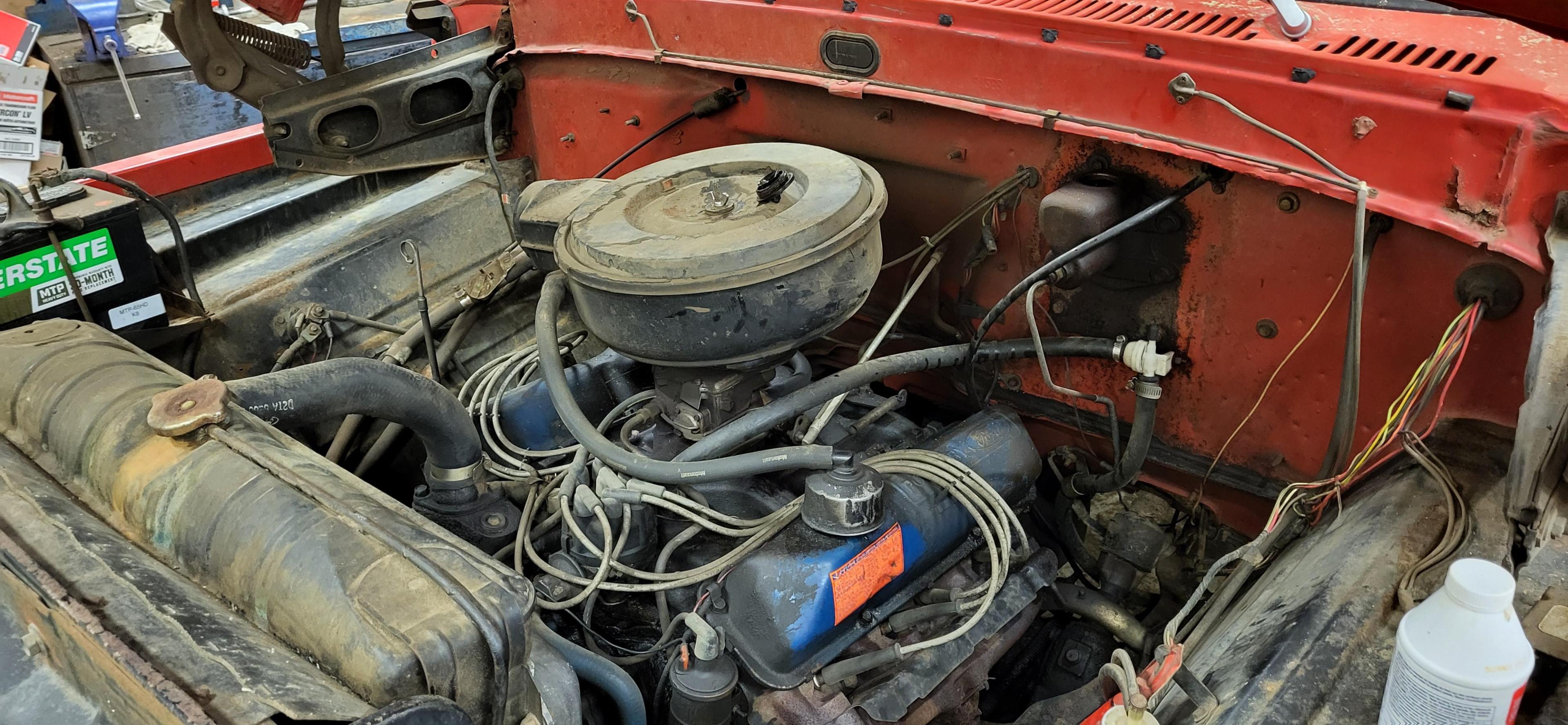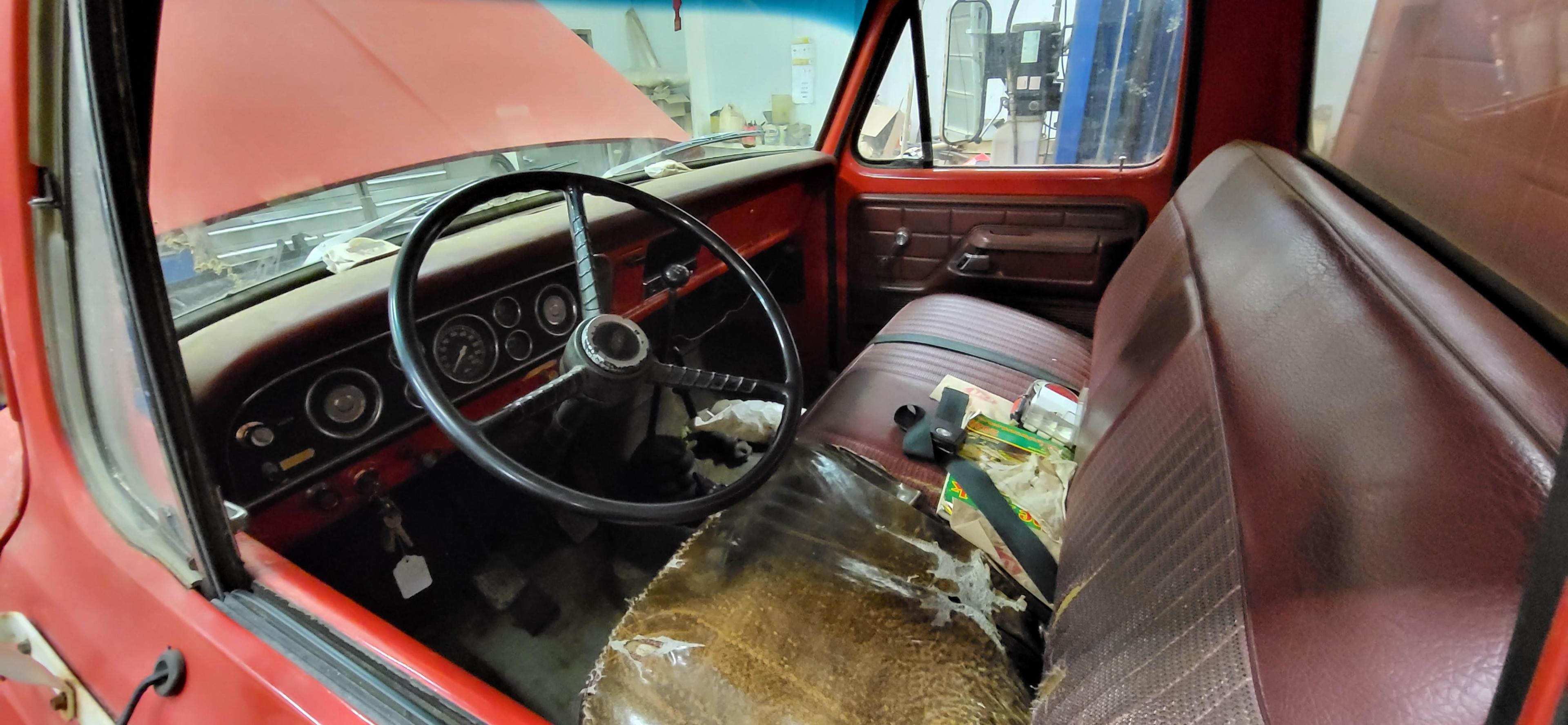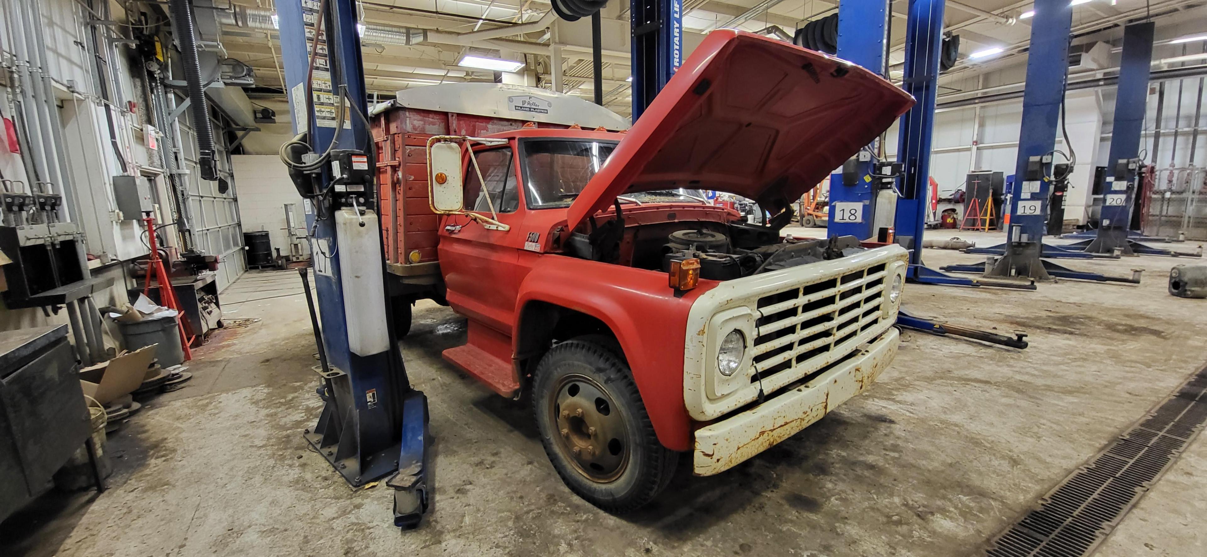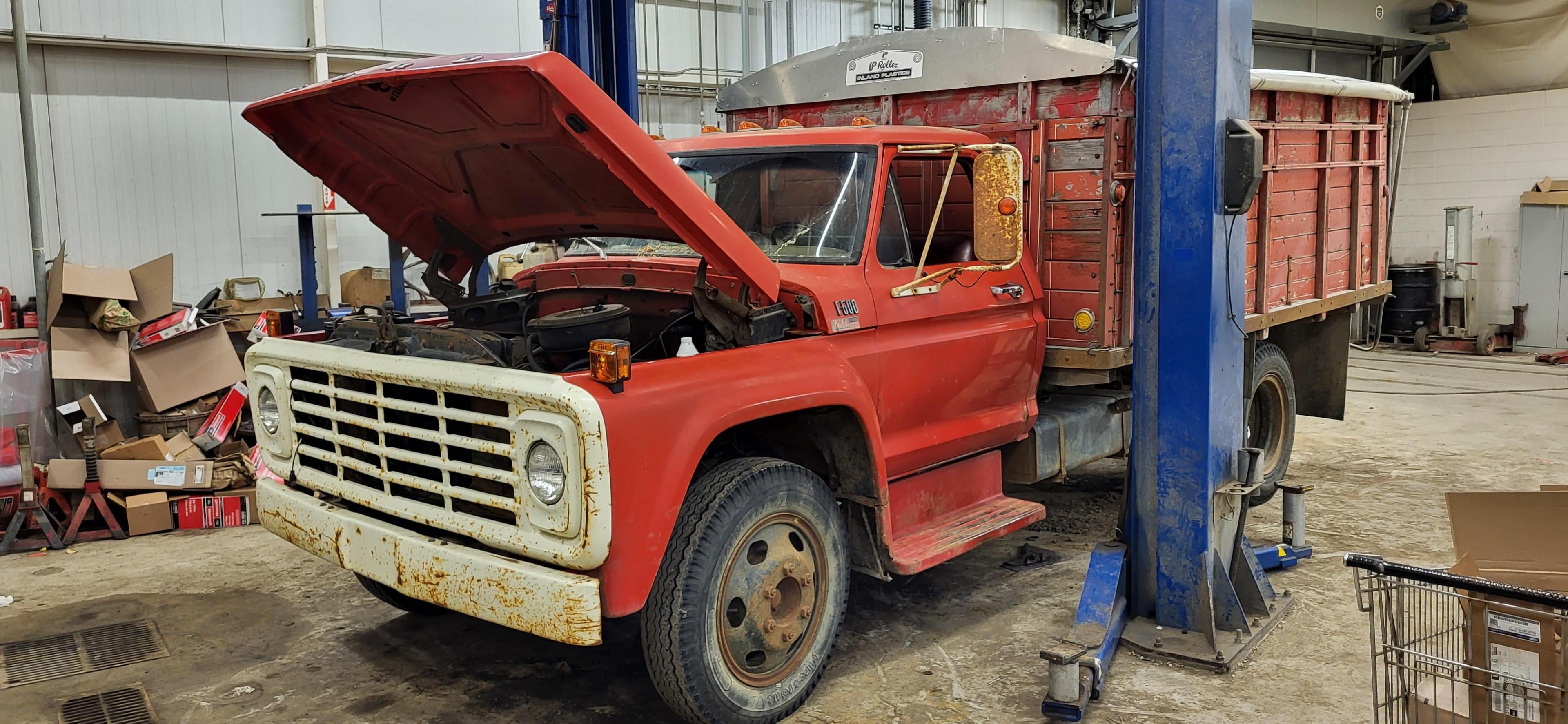 This old beast rolled into the shop today. F600. I'm guessing early 70s? In decent shape, all things considered. I like these old trucks. ]