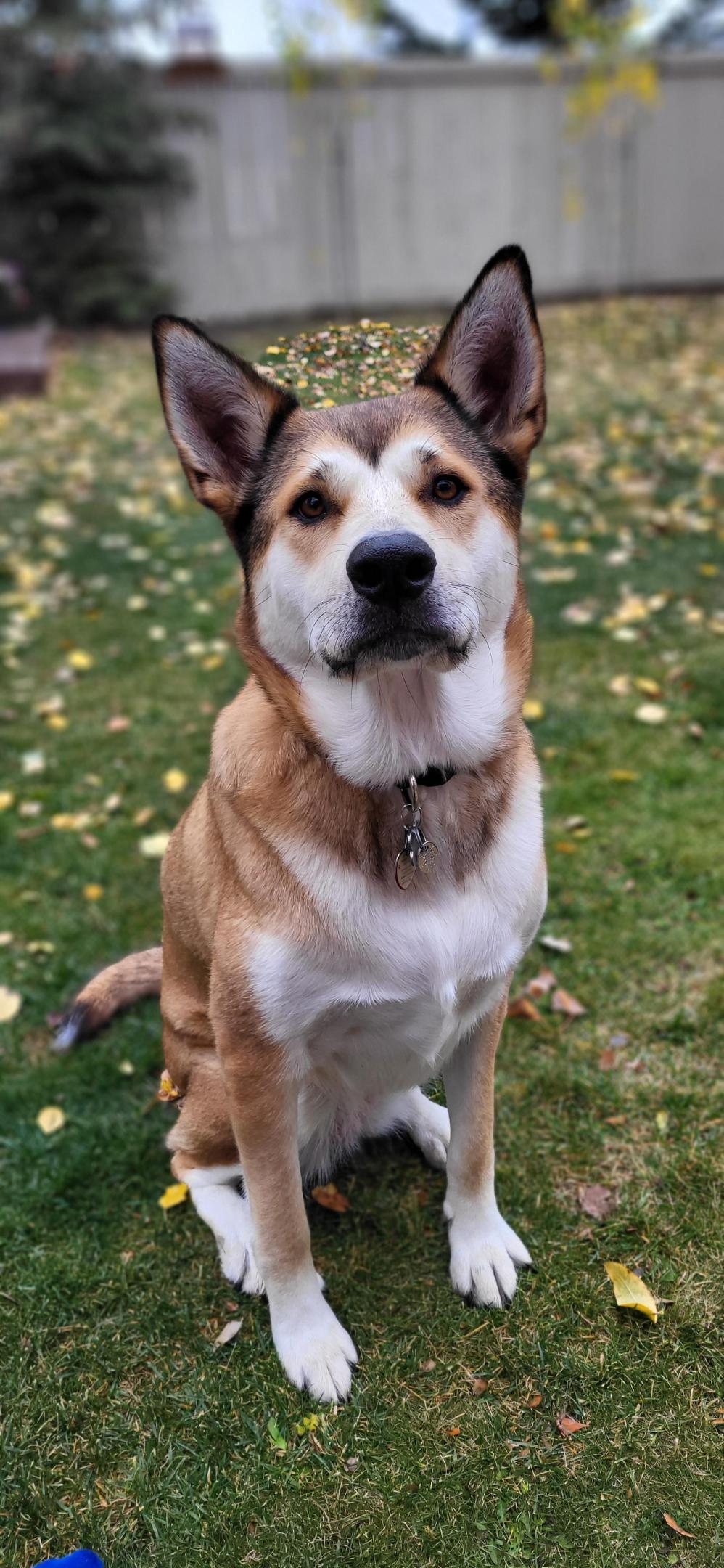 Luna, just sitting outside enjoying fall, and hoping I have treats. And showing off her glow in the dark Halloween collar.