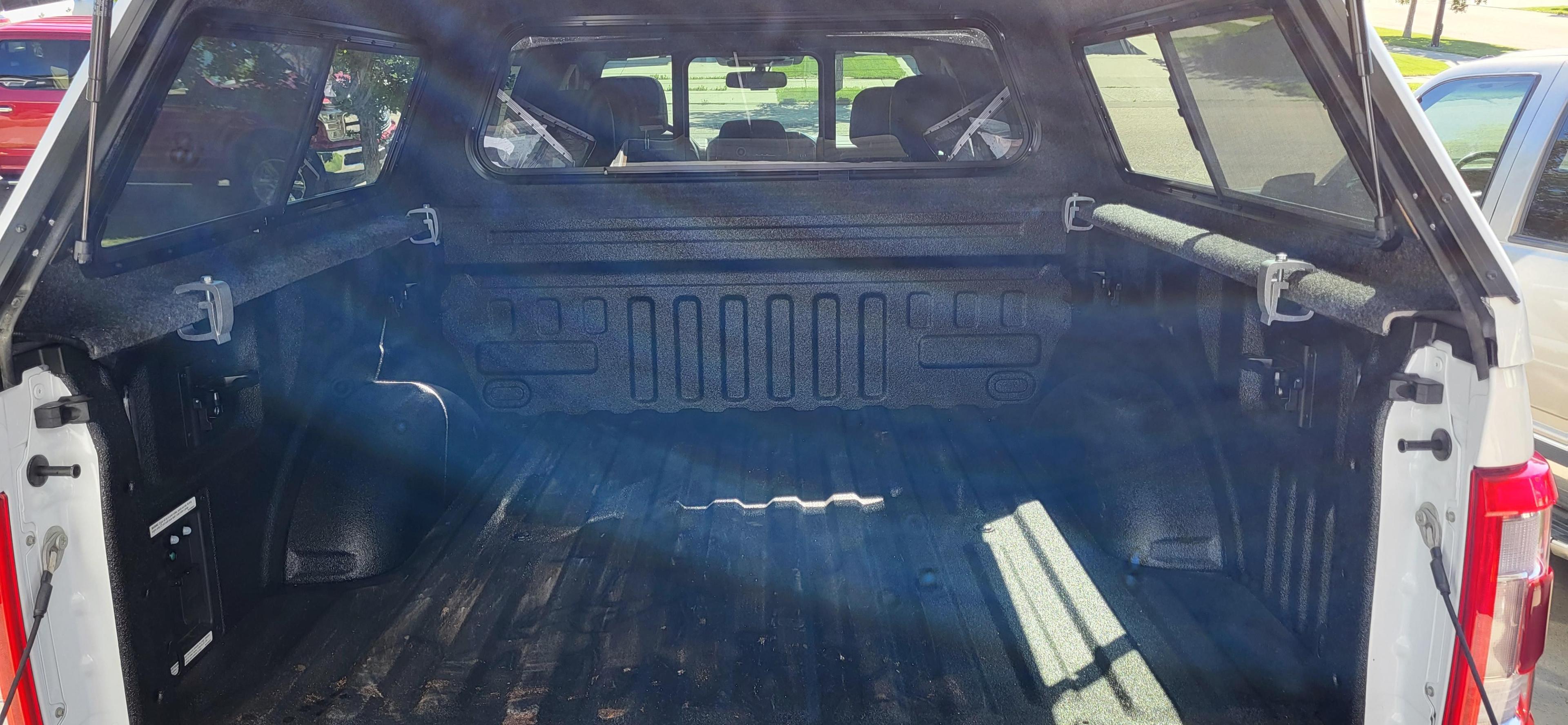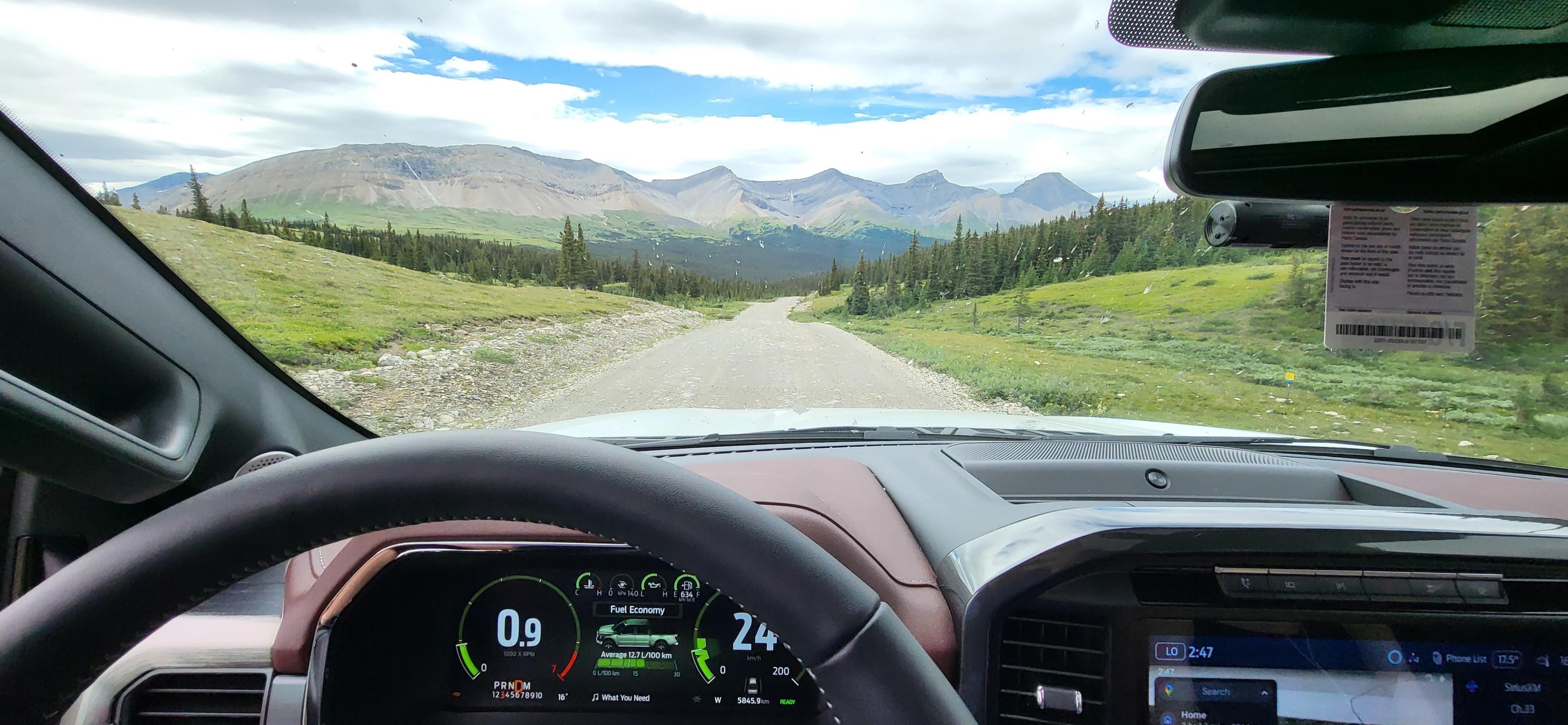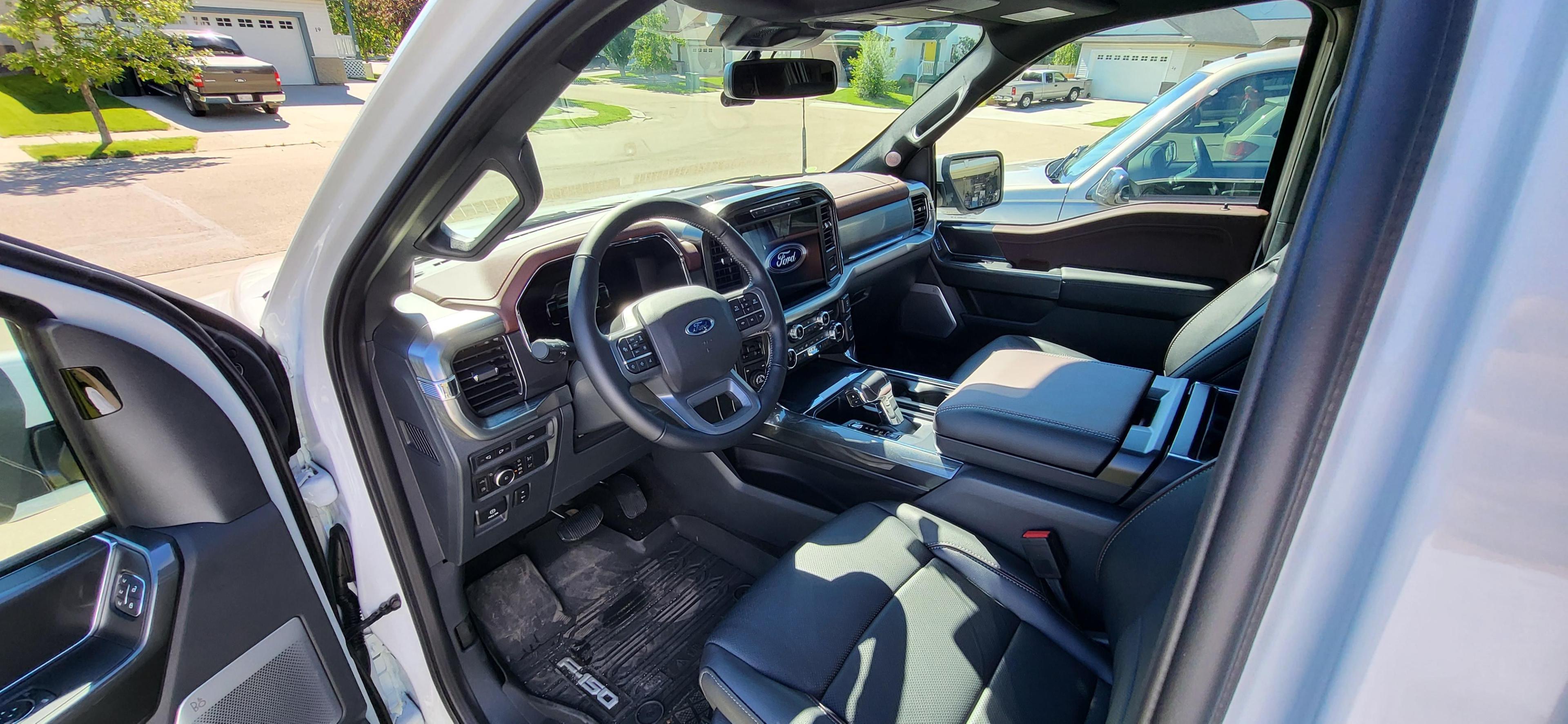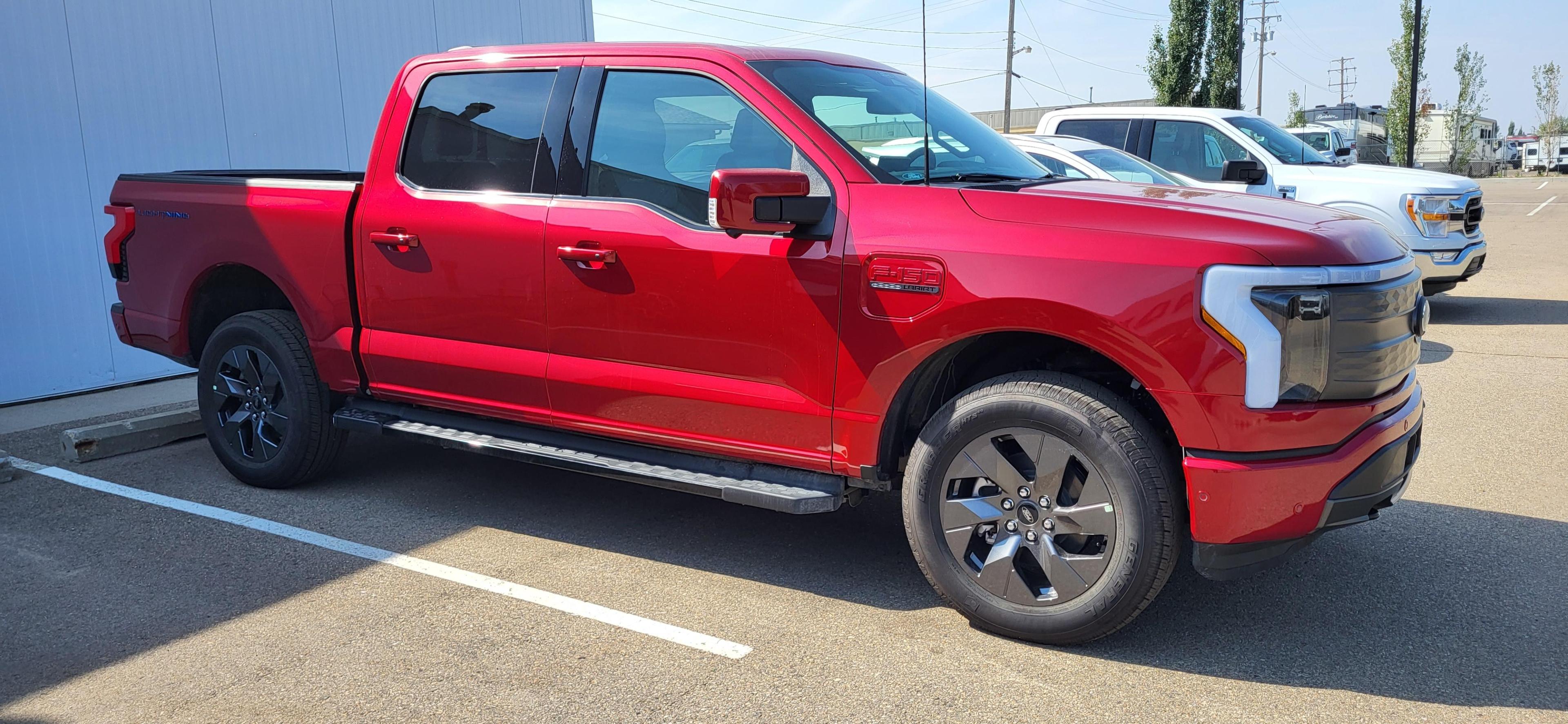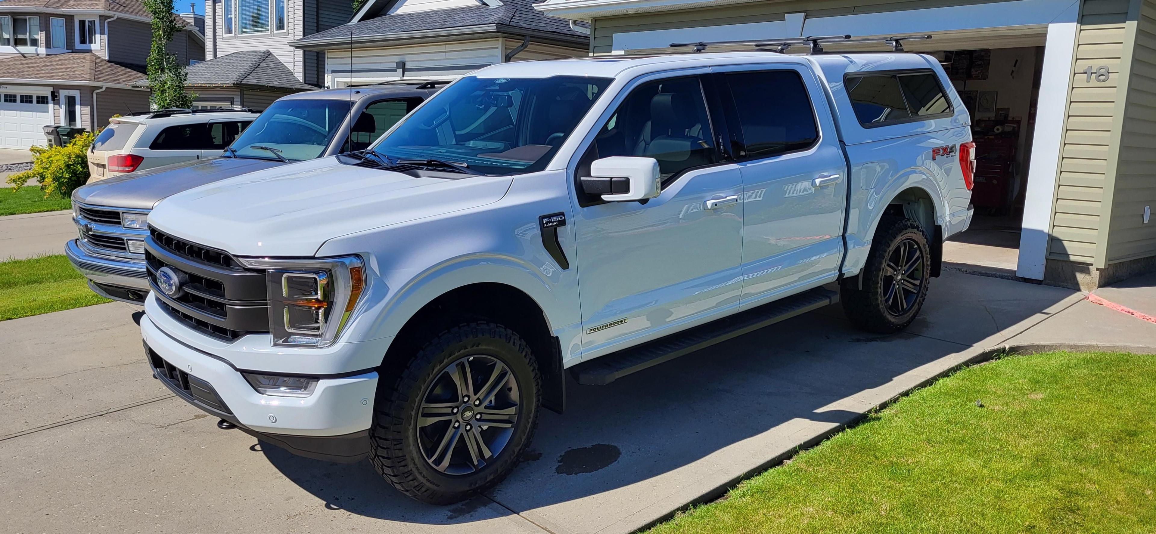 Got some decent pics of the new truck. 2022 F150 Lariat with the3.5L PowerBoost hybrid engine. Spec'd it out with most of the good stuff, including the big stereo, big sunroof, and the onboard generator. And I went with the CO-Pilot 360 Active 2.0 option, which includes Blue Cruise hands-free driving. Added a 2.5" lift kit and some Goodyear Duratrac tires, lined canopy, full clear stoneguard wrap on the front end, and a dashcam. I've had it since July 9 and now have almost 8000km on it, which is roughly 5000 miles. Hybrid engine has been great. You don't see much improvement in economy on the highway, but driving around town is huge. The truck does around 900-950km (590 miles roughly) per tank, and of that about 200km (125miles) are in pure electric mode. And the hybrid comes with a smaller gas tank that the other models. 98L (26 gallon) as opposed to 136L (36 gallon.) So I'm pretty happy with this. The generator works great. Have used it camping to keep phones and cameras fully charged, plus our electric cooler. Saves having to keep picking up bags of ice to keep everything cold. Have also used it to charge our weed whacker and lawnmower batteries. -