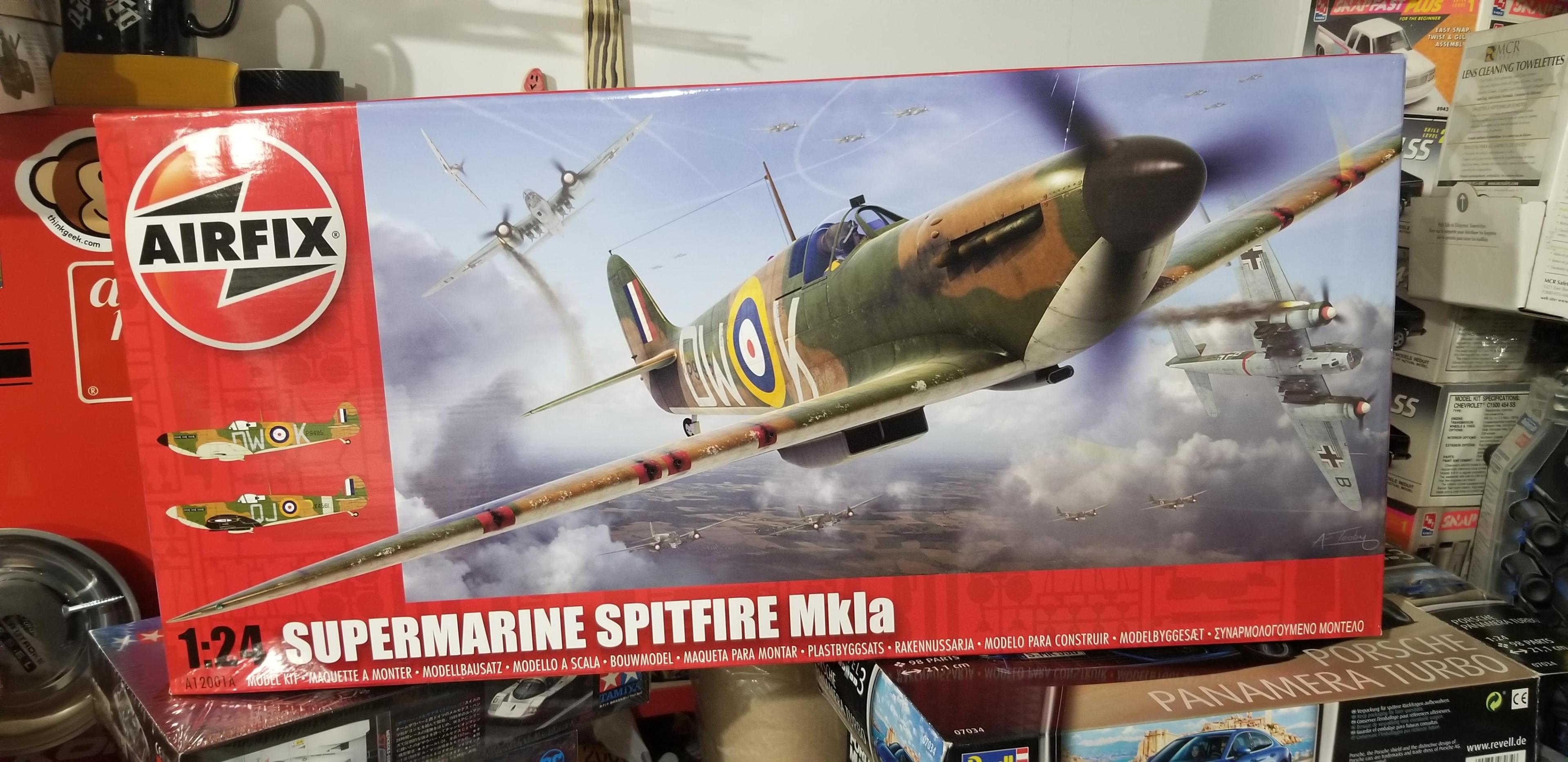 I'm not a plane guy. Haven't built a plane since junior high school. But it looks like I'm branching out. A few years ago, I picked up a Revell 747 and some aftermarket decals to build Iron Maiden's Ed Force One. Still haven't started that one. Then we found a box full of plane kits in my late father in law's garage. So I have a handful of planes there. Then I have my late dad's stash of 50 or so plane kits. But I've still never been too excited about building planes. Having said that, I've always loved the Spitfire. Just such a beautiful and elegant plane, with a fantastic history. So when I found a new, unopened 1/24 version for sale, for 1/4 of what they retail for, I couldn't turn it down. -