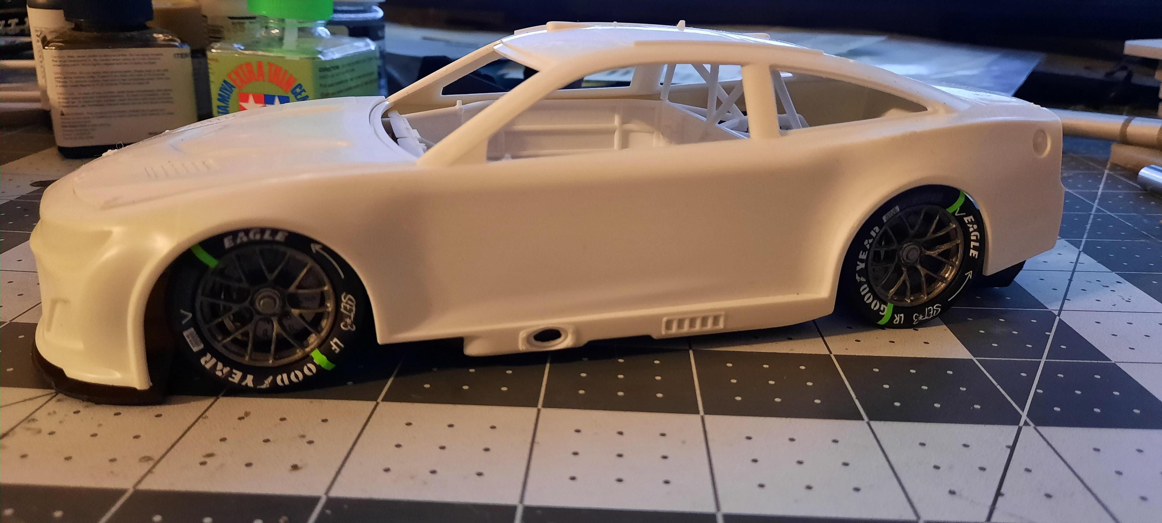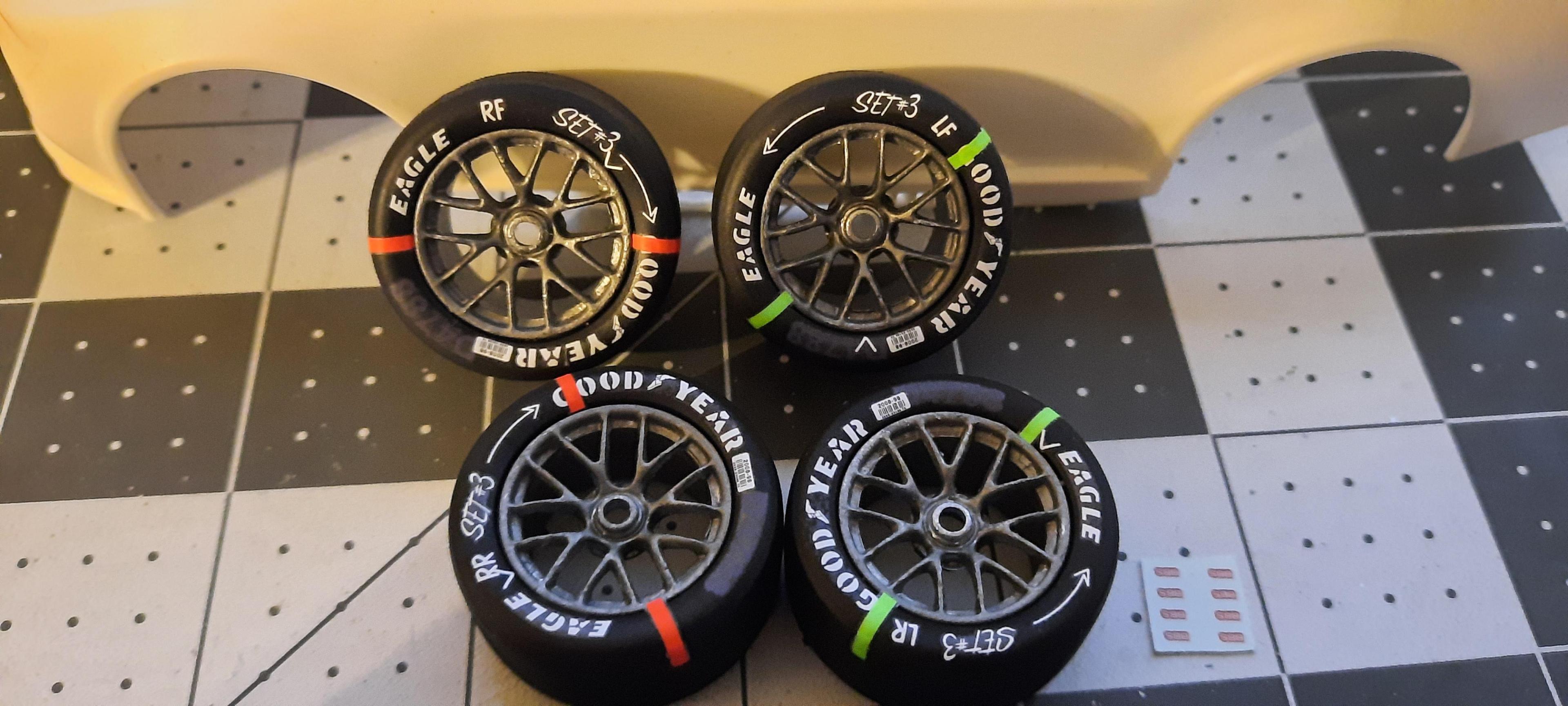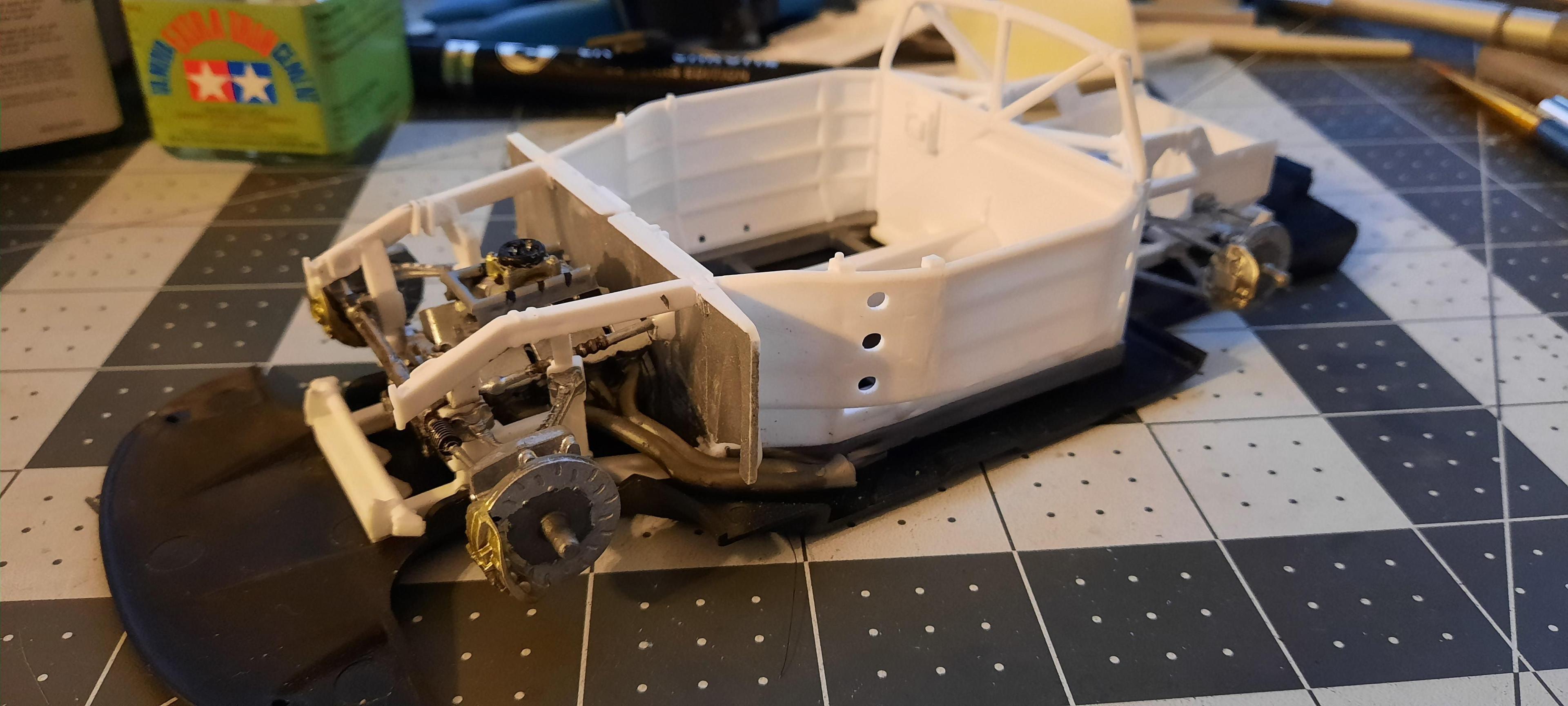 Update...finally.... Chassis is mostly done. I decided not to paint the chassis as this one will be displayed with the body on and hood on. Being a Coke Zero drinker this is a favourite livery of mine so it'll be shown all buttoned up. Also, since moving I don't have a paint booth right now, as mine was trashed in the move, so no spray painting for me likely till after the New Year when I can build a new one. Front and rear clips are attached to the main cage and the engine is installed. Engine is painted in Vallejo acrylics with Tamiya LP 61 for the exhaust. I also washed most of the parts that were hand painted with Tamiya panel wash. The valve covers will be sprayed in black and a ECR decal from Powerslide added down the road. I still need to do some touch up painting and detailing but I can't find any of my nice fine brushes, they're packed away safely in a box....one of many still left to open. I will spray the fuel cell top red once I get back to spray painting, as well as painting the rear deck in black, so those items are not attached yet, otherwise the chassis is almost done. I still have some bars on the interior to add but I'll get to those once I get the fire bottles painted. The suspension is also done, and it too needs some clean up painting, as well as the exhaust. The floor that's currently under the chassis is from a different kit, cause the one from this kit is pretty badly warped and I just can't get it straightened out enough to be happy, so I'll use this one for now, but it is not fixed yet. I got the tires done tonight and decaled up with some Goodies from Powerslide and the BBS decals still need to go on the wheels. Wheels were brush painted with Tamiya's LP 61 Metallic Grey and then the decals were covered with some Vallejo matte clear. I also want to 3D print some airvalves to add in a bit more detail. And finally, some shots with the wheels and tires on the chassis/pan with the body sitting ontop to check out the ride height....I"m pretty happy will how it sits right now. That's all for tonight, time to watch a movie before bed. Thanks for checking in.