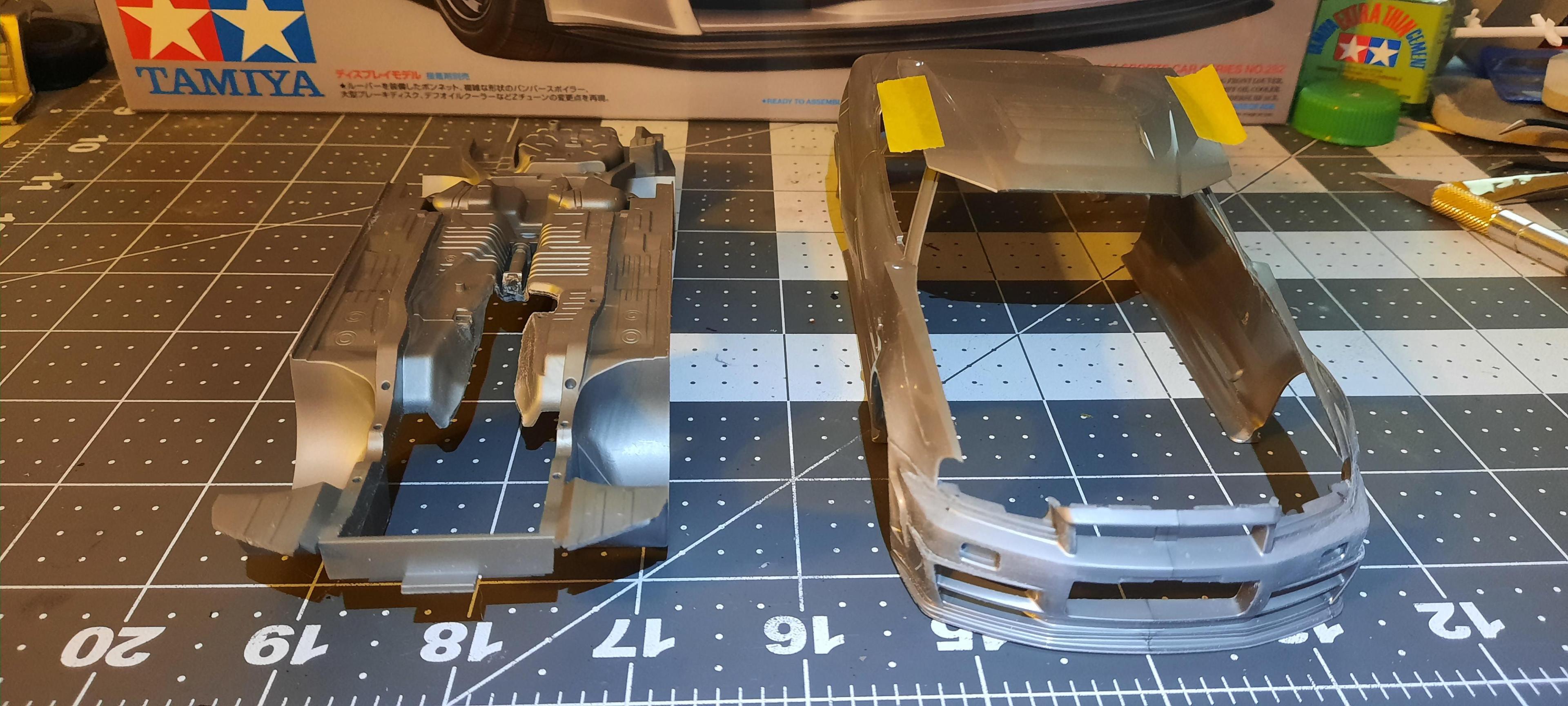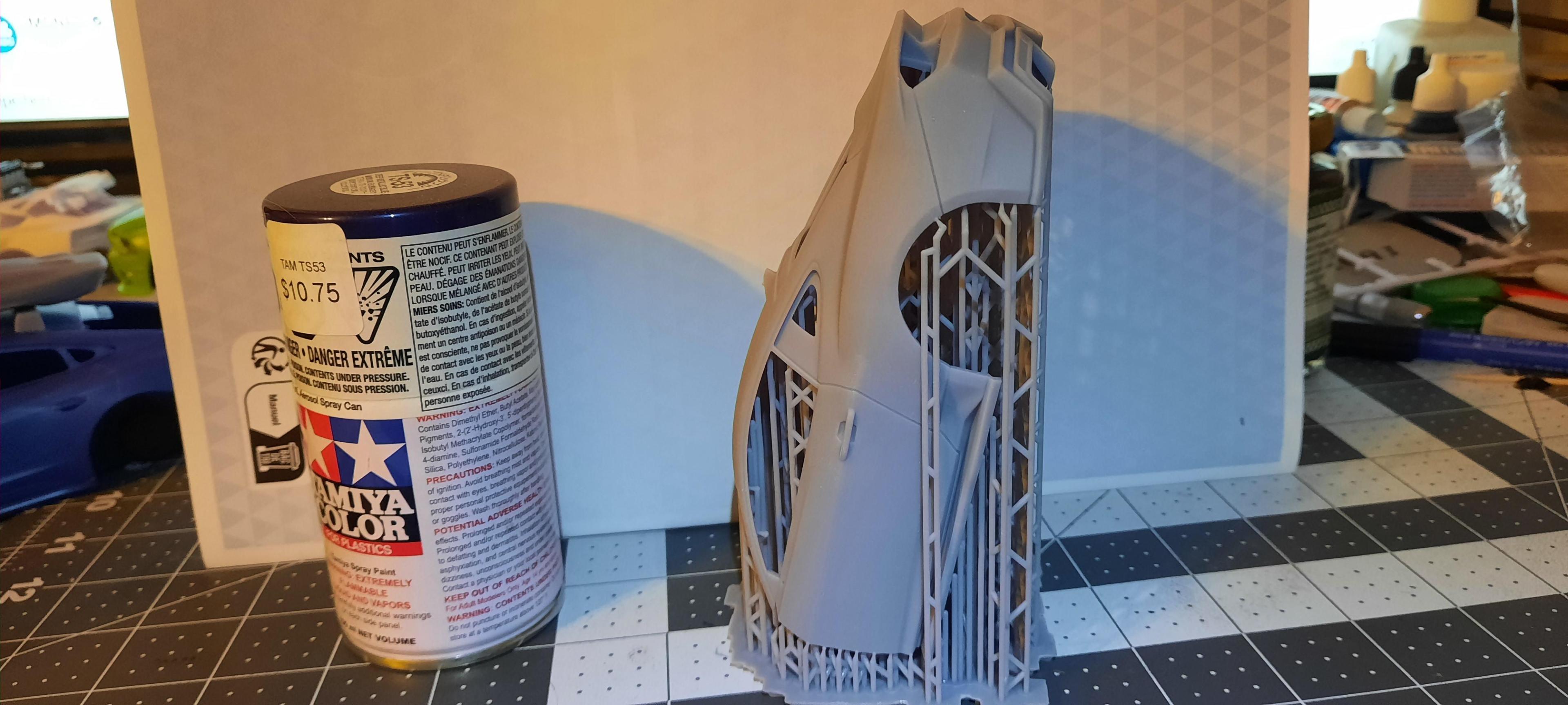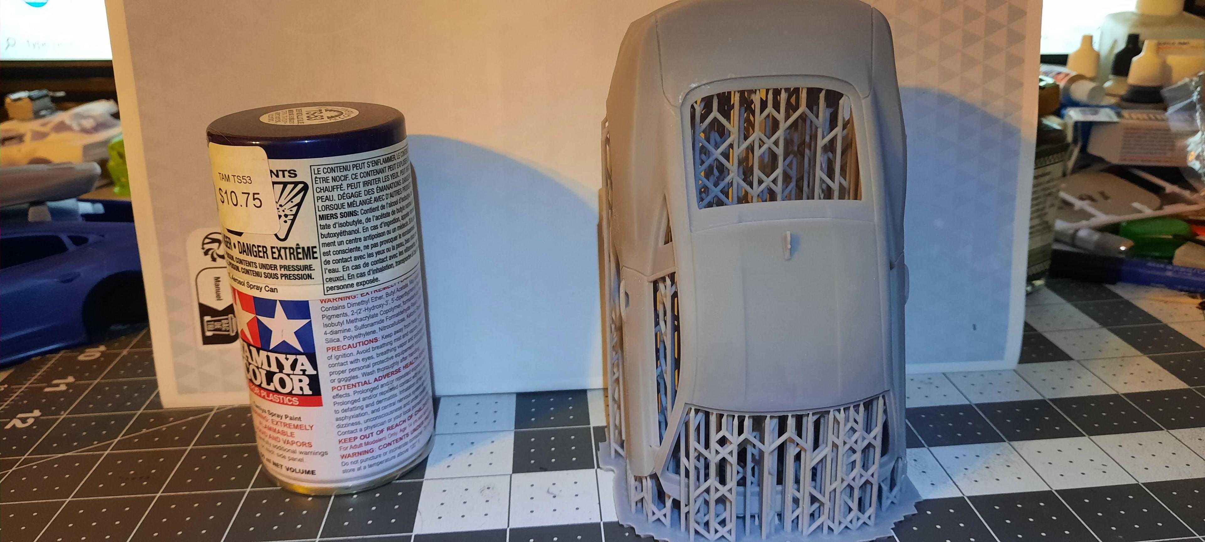 Small update: First file is printed. This is the back 3/4 of the body and I'm super happy on how well it's come out. I can't see any flaws at the moment but I wont remove the supports till I have the front clip printed and cured (it's printing now and should be done later tonight) so I can attach the two halves right away to prevent any warpage of the panels cause they're left "open". I'm not 100% sure on colour I'm going to go with yet, but I have this can of TS-53 Deep Metallic Blue I was going to use on another project (going a different route with that one now). I'm completely open to suggestions too. Now pics of the first print. Comments and criticisms always welcome.