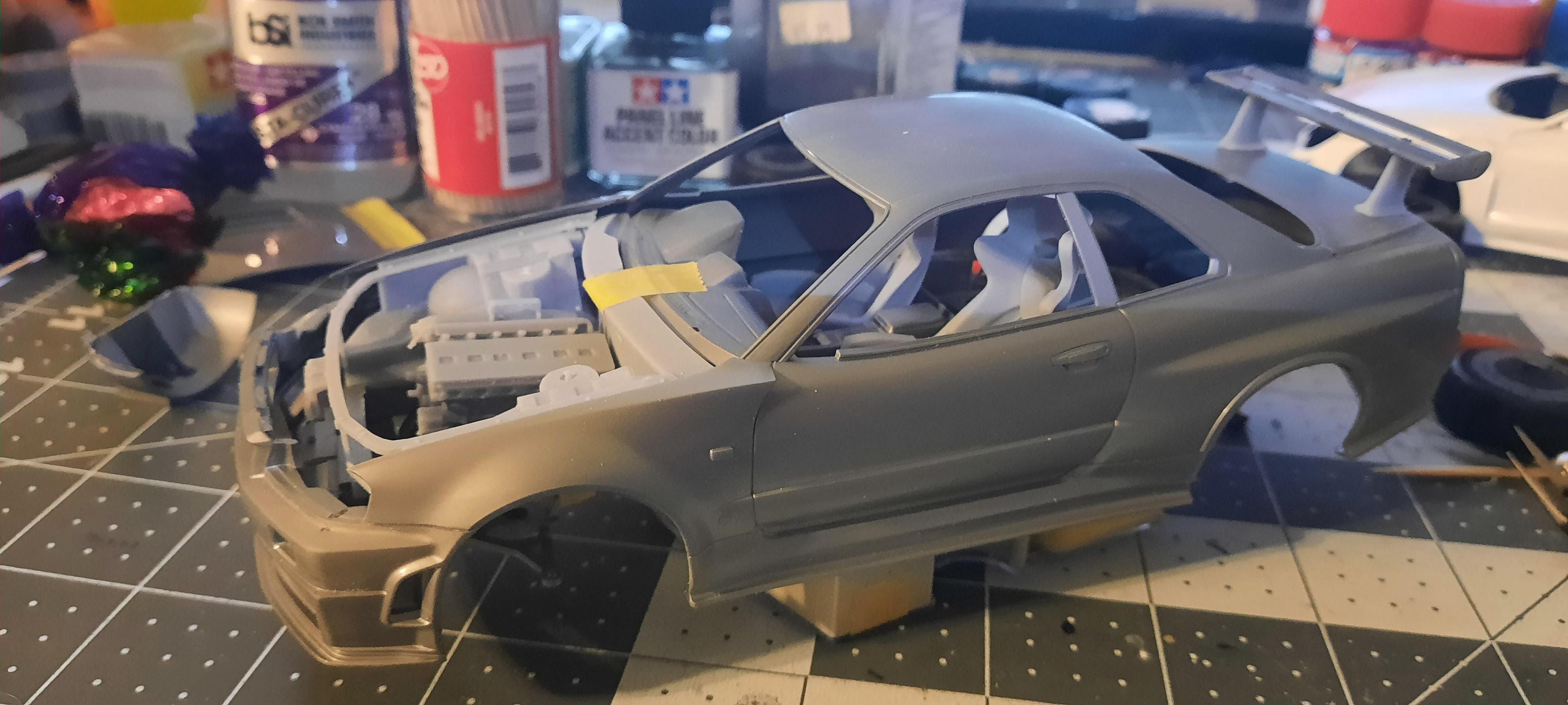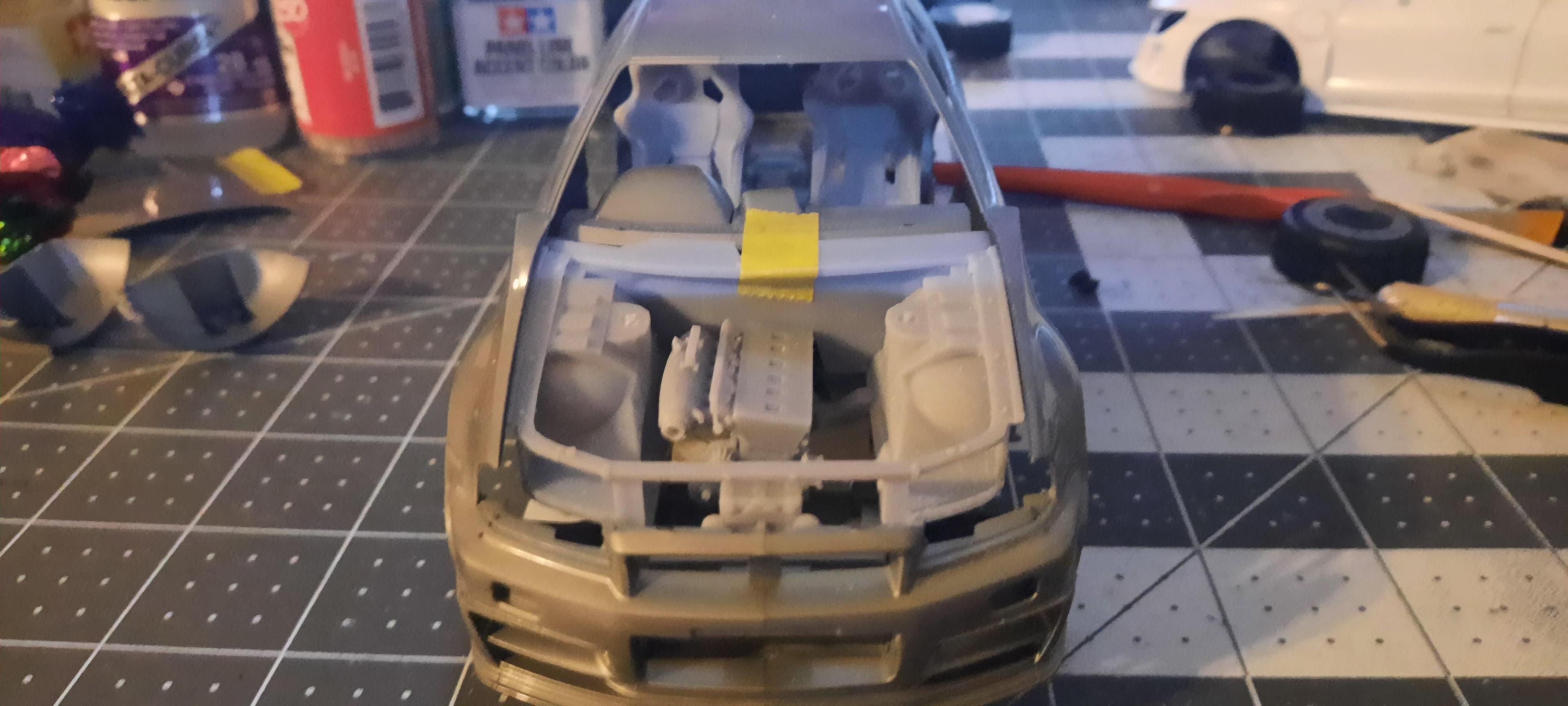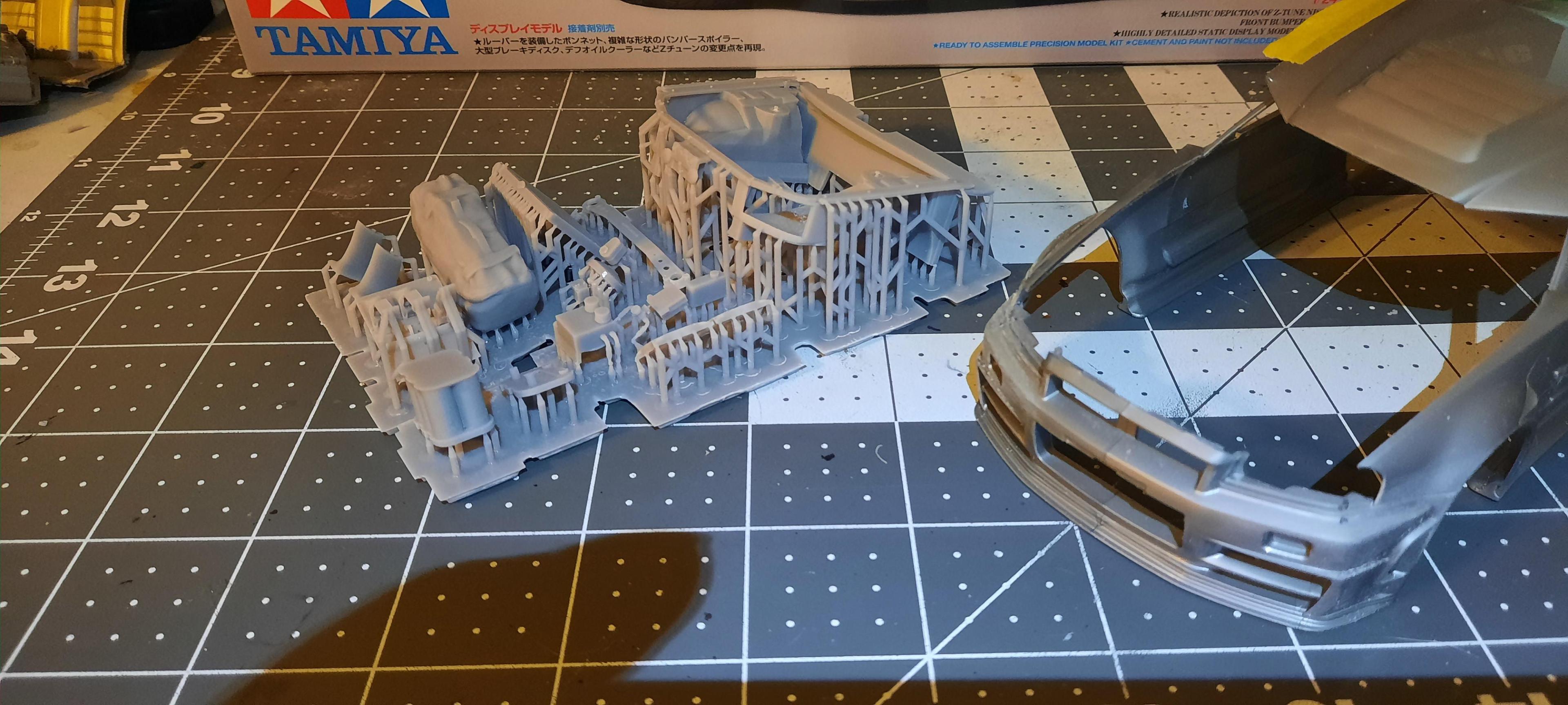 My R34 Skyline arrived a few days ago so I jumped right into the project. First up was to remove the hood, and removed the stock engine base and transmission from the chassis pan. I also decided to 3D print a bunch of parts, engine bay...and some accessories. Single turbo RB26 engine.. As well as some brakes and new seats. Engine bay is printed now, Engine and brakes files are currently printing and should all be done tonight. Files for detail parts are as follows: Brakes: https://cults3d.com/en/3d-model/various/ultimate-brake-disc-w-caliper-collection-1-24-scale-model-accessories Seats: https://cults3d.com/en/3d-model/various/recaro-pro-rms-racing-seat-in-1-24-1-43-1-18-and-1-12 RB26: https://cults3d.com/en/3d-model/various/nissan-rb26-rb30-hks-single-turbo-1-24 Engine Bay: https://cults3d.com/en/3d-model/various/engine-bay-nissan-skyline-r33-r34-gtr-nissan-skyline-1-24 Time to get some parts clean up. Up first is the engine bay removed from the supports then grafted to the chassis (which needs to be cut down around the wheel wells and firewall. Hoping to have that done tonight. Thanks for looking in. -