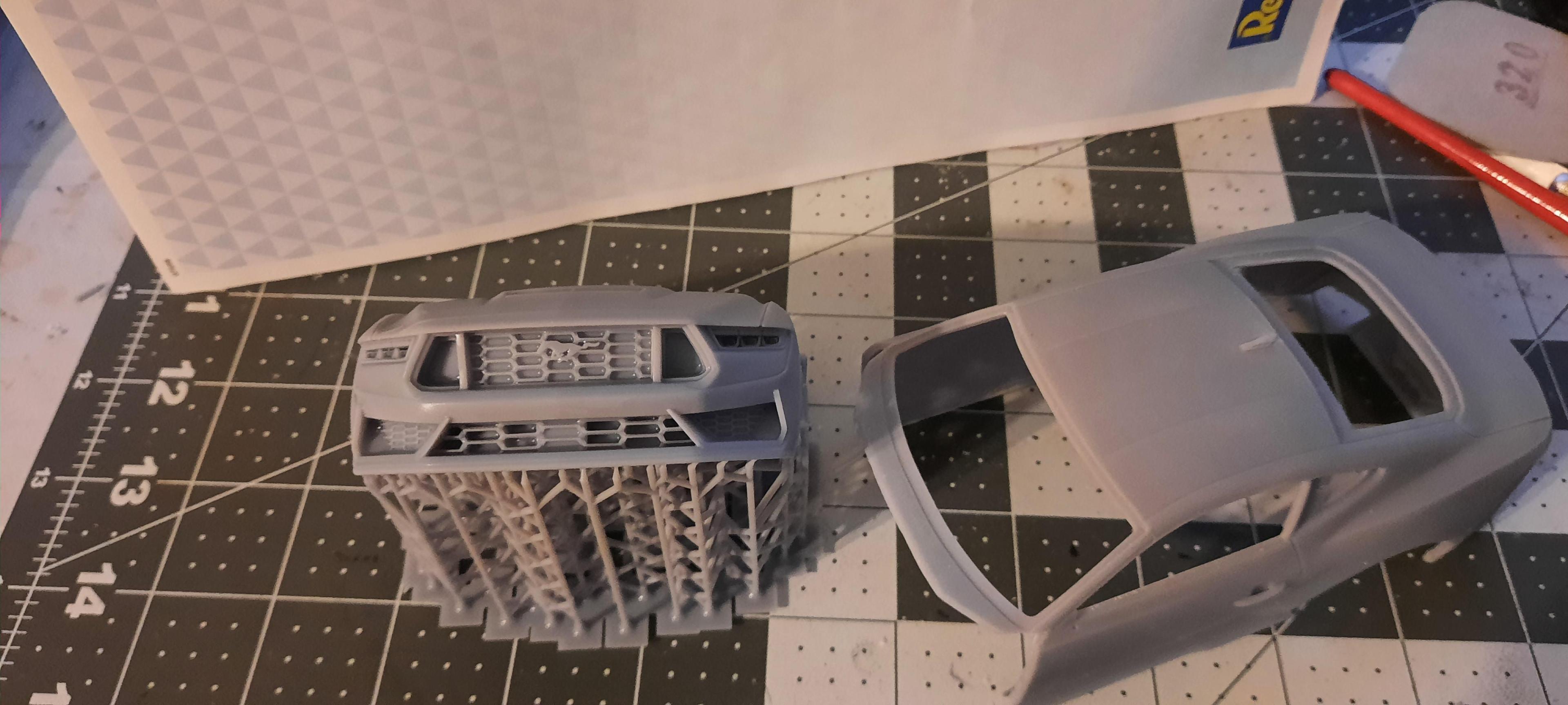 Another small update: Front clip is printed, as are the wheels and tires (forgot to take a pic of those) And a shot of the body together....please note I havent done all the body work yet, so the seam at the base on the side skirt will be gone, eventually. Chassis is printing now, will likely take till tonight to get both halves printed, cleaned and glued together, then I can start on working on the ride height, I'll be adjusting it down to sit lower and meaner looking. Still undecided on paint but leaning towards either a pearl white (Tamiya's LP 43) or Ford Viking blue. I want something light so I can contrast the darker plastics rather than have something that's completely dark.