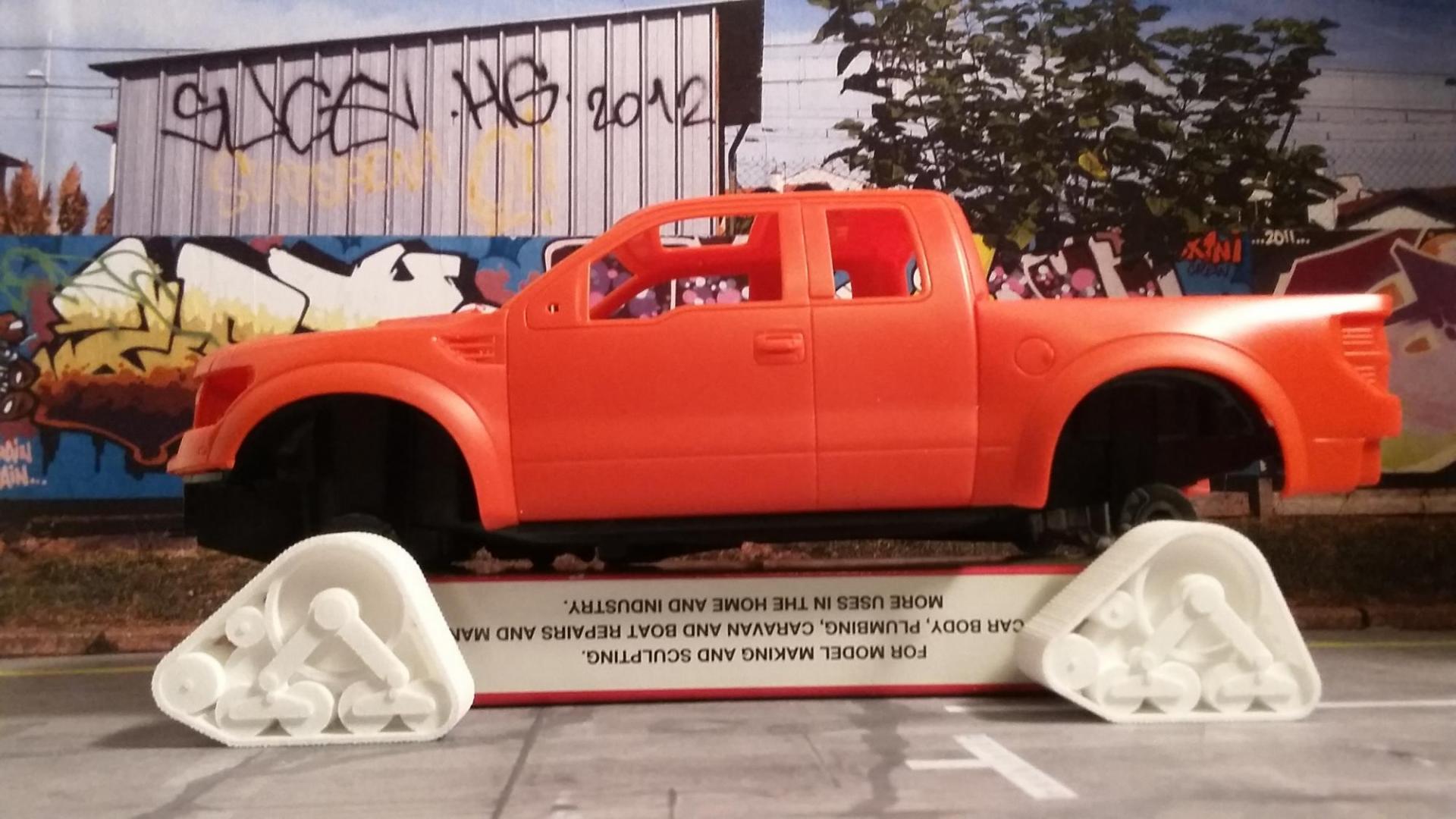 After seeing this back in 2014 I knew I had to build one. I love the Raptor and this thing is just so beastie. So onto the start... First, this is going to be a slow build as I round up parts/paint and extras for it. But I've started on it none the less so I can pick away at it as parts arrive. Starting point. Revell's lovely 2015 Raptor snap kit. Loads of detail inside and out will make for a great curbside build. Step 1, body mods. Removed the front bumper and rear roll pan, working on the tailgate now. These are the tracks by Mattracks used on the RaptorTrax And I'm in the process of having some replicas printed up from Shapeways. That's it for now, paint will likely come from Gravity Colors. Decals will be a mash up of part box leftovers and some Ken Block rally car decals from Ebay or other online vendor. More to come. Comments and criticisms always welcome. David