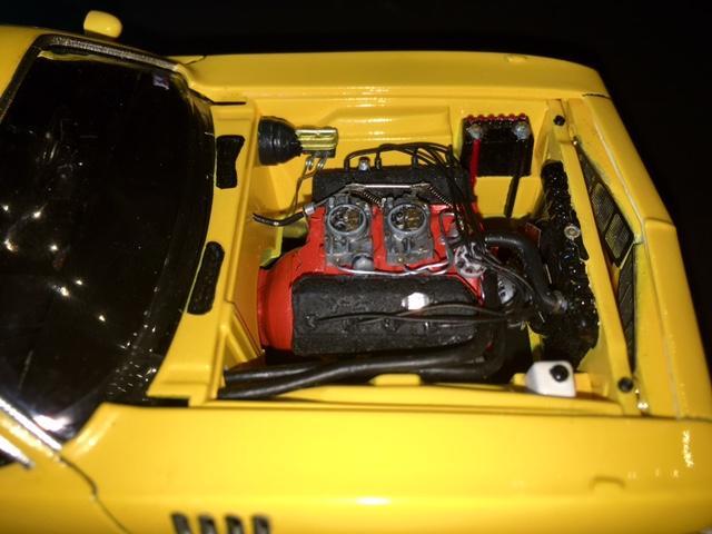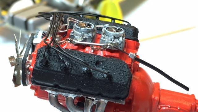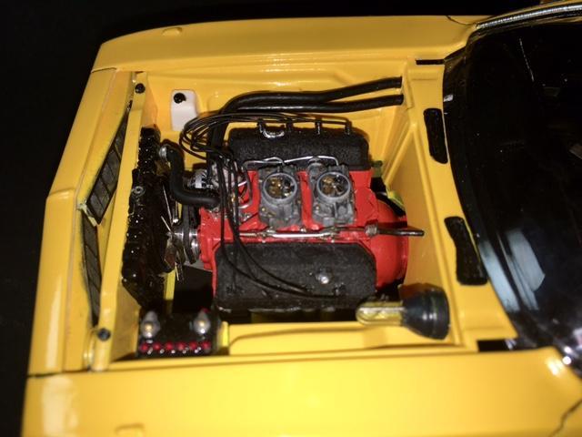 Down to front and rear bumpers, both of which need to be done with a chrome Alclad treatment, and radiator hoses. Ran into a slight problem with hood clearance due to my own lack of experience. Had to ditch the air hat base and mount the scoop in the hood, which for me is OK as I had plans to keep it removable anyway due to the detailing it covered on the engine. Also had to modify the wheels to fit a set of AMT Goodyear F60-15 tires. (Saving that view for the finished set of pics.) -