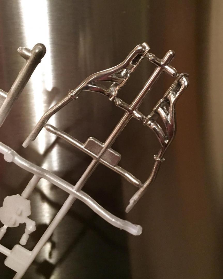 I believe I know what I'm looking for, but I was prepped for failure after talking to the HS owner, so is this the correct finish? Or should I be going after more reflection and glare qualities? Kit pieces were sanded as finely as I could. Shot with Alclad black base, left to cure for 24hrs. Then Alclad chrome sprayed with multiple fine passes with the airbrush held at a 45 degree angle to the pieces as each pass was made. Made certain to make no spot shots, and no heavy passes........which I had to think about as the color started to come out. Tried to get captures with different light intensities and comparisons with one of the pieces that will receive the paint to correct spruce damage. Is this right, or is there room for improvement?