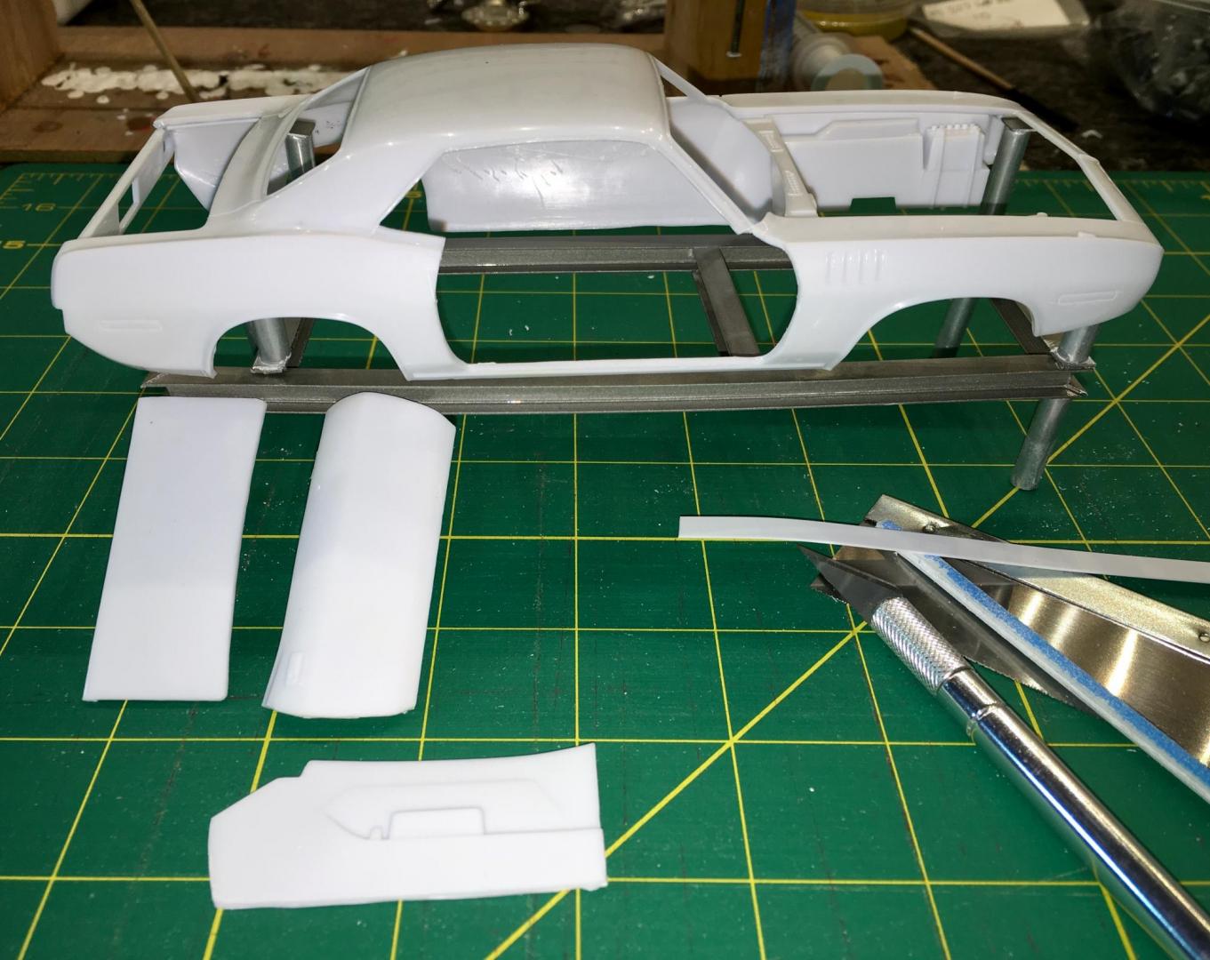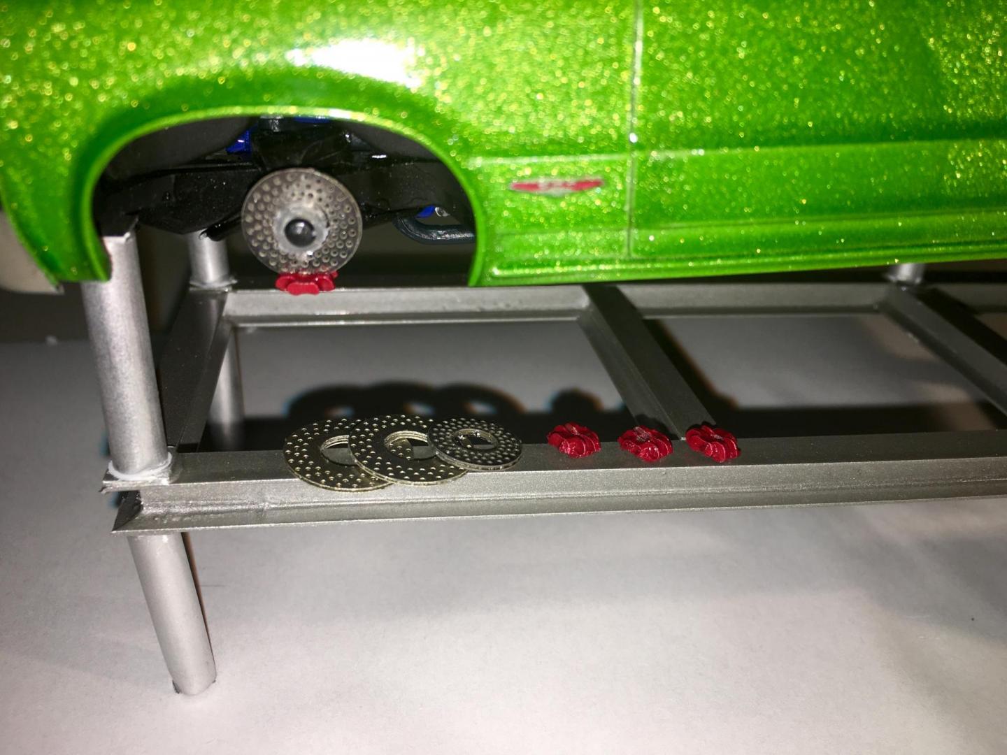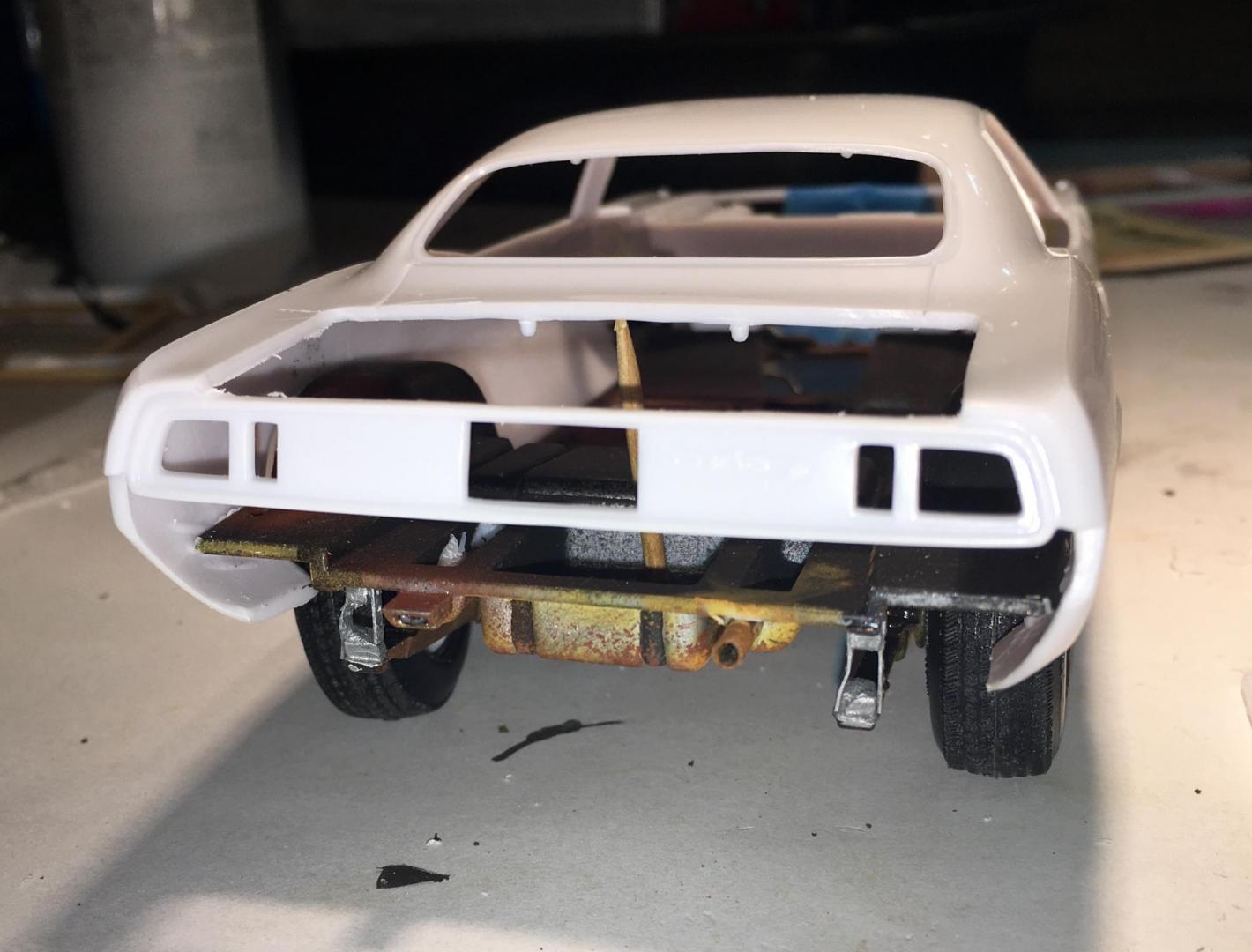 While waiting for paint to dry on a few pieces for Twisted Fish, I started on version II. This is planned to be the same car, 30 (hard) years later. It will show what happens when someone too young to have such a muscle car: accident damage, rust from lack of care, a motor that has been tinkered with and neglected, factory options replaced with whatever was available (affordable) at the time; all while still being driveable. This will be my first attempt at rusting/weathering and opening doors/trunk. Please feel free to let me know where I go wrong and/or share any thoughts about the process(es). Mocked up stance with the broken, shackle rear end lift: Shackles that are broken (on purpose), yet still keeping things together. Rear view also shows a lost exhaust tip and rust on what is left. The shackles and front leaf spring connections will get rusted in time.