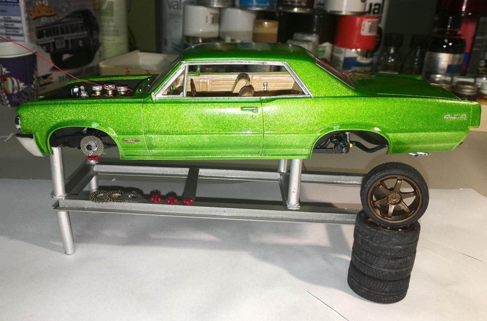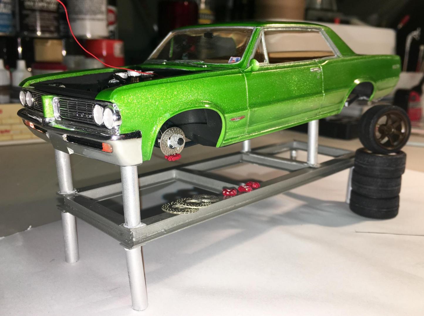 He's down to the last few turns now. Glass and interior is in. Chassis and body have been mated. Next step is getting the brakes installed. Once the GTO is sitting on all fours, he'll finish off the engine bay and get it outside for a few glamour pics.