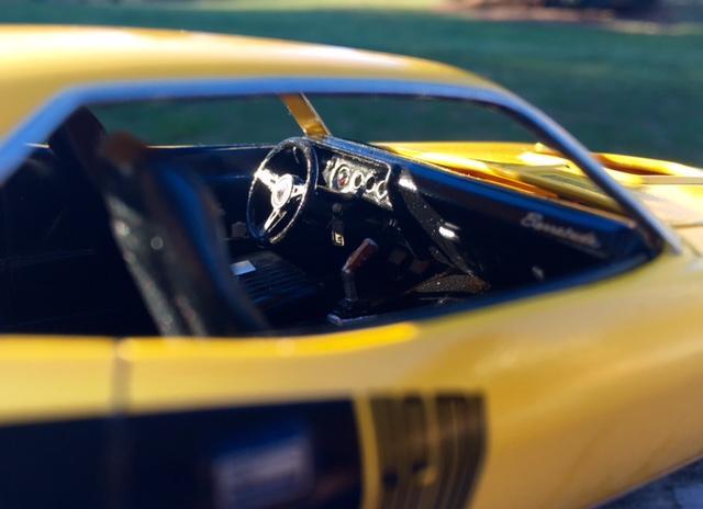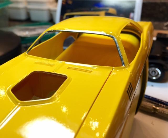 A few more steps forward. Was able to repair my "grab and destroy" dust removal mistake: : Body detailing continues, albeit slowly. Managed to remove just a smidgen too much of the billboard over one of the fender flares, so now I don't know if I want to just cut my losses or gamble to hide it and possibly make it stick out more then what it already does. I do like the effect the polished door handles have (an unexpected surprise); they blend in to the satin black of the billboard at certain angles, or reflect a high shine at others. This is the reason I removed the grill inserts a few weeks ago. I liked the idea of real metal to showcase the front end a little more (see through to radiator and radiator support area). Still needed to paint the frame interiors though: -
