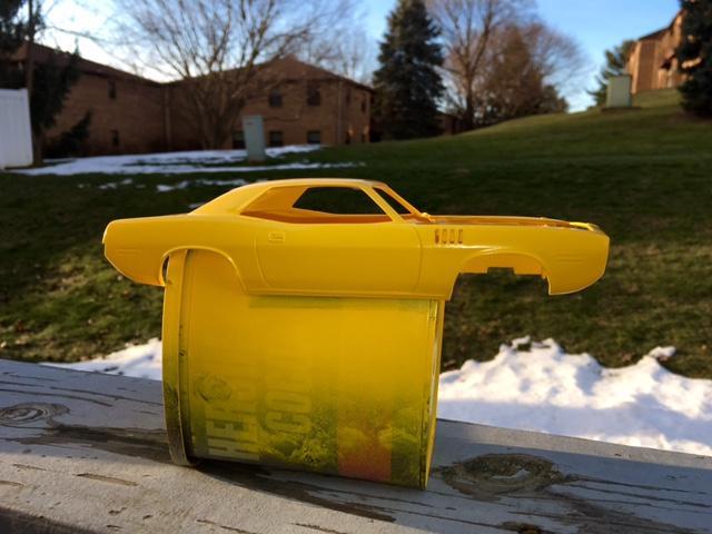 Thanks John - the valve covers (after having the chrome stripped) were scratched with a course grit (400 grain) sandpaper, then shot with an etching primer coat. Once that was dry it was covered with a flat black (heavy coat - not tack coated), then sifted baking soda over the still wet flat black coat, and then an immediate 2nd heavy coat of flat black. Scratched the finish off the areas the plug wires would go and painted a gloss black circle to simulate the hole cover/plug boot. I was torn about the headers; either using them for this version or the next one........ figured there's other issues that I've either done incorrectly or flat out missed so I'm proceeding as if this a "day 2" showing. Thanks for the motivation too!! It's a Mopar thing...............along with Statutory Grape (In Violet or Plum Crazy), Chartreuse green (Lime Light or Sublime), and a host of other "unique" colors. -