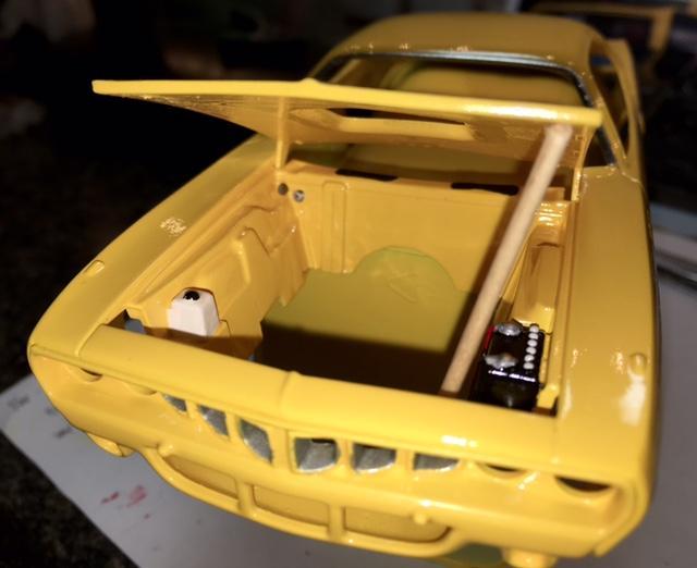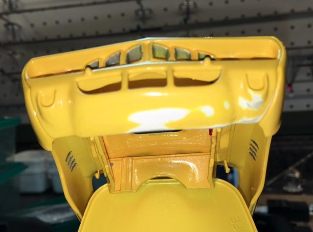 Slowly moving forward. Four coats of clear are now on; things have laid out surprising smooth which I hope will lend itself well to minimal polishing. Really not planning on doing a mile deep shine on this. Most of the smaller, molded in details (scripts, hood pins, emblems, etc) have been removed to make room for PE replacements. Glad to see the primer/paint/clear coats tightened up the panel lines as well; just enough to be consistent while not creating rubbing spots. Started on my 1st use of BMF. Not 100% crazy about the fact I can't burnish out the small ripples that I made while taking it off the backing paper. From what I've researched, this is a common problem (?) Did have a few other self-induced problems to deal with: Totally forgot I wanted to remove the molded in heater hoses before the body was painted. So, just before the clear went on, they were removed, new locations opened up for the "real" hoses, and the battery and windshield wiper container were detailed. Which brought me to this minor setback: Dust............... One. Simple. Small. Speck. I knew better.............but I thought I could just "pick it out before the clear started setting". Someday I'll start listening to that voice between my ears. -