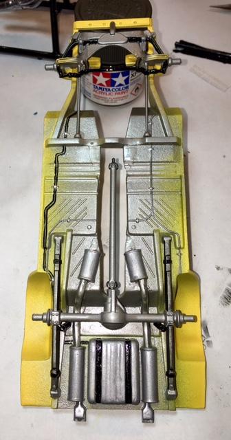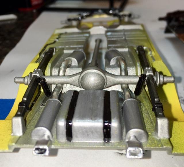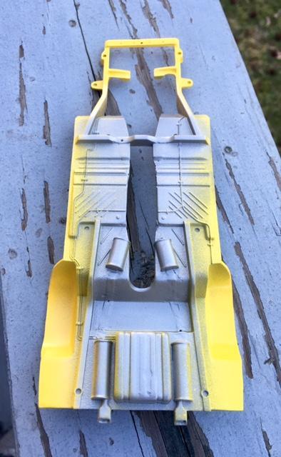 Wanted to see how things looked outside so far since the weather was nice. I'm calling the body done at this point. Bumpers will show up later as well as the front turn signals: Interior I'm also setting aside as complete: The chassis is another story completely. I pondered redoing it a few weeks back; and have been influenced by the fantastic builds I've been watching on the board. I'll use the 1st chassis in version II of this car, but for now, I've stripped another chassis and painted it a bit closer to an original. Really not 100% certain if what I'm doing is "correct" or not, but I'm hoping everything will come together properly once the body is mated with the chassis. -