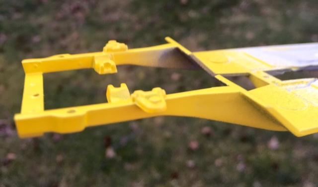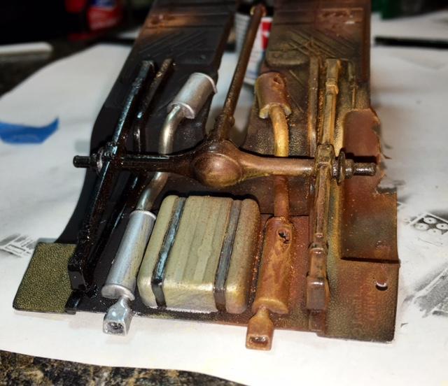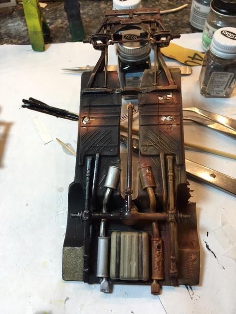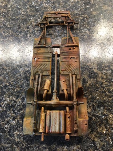 While waiting for paint to dry on a few pieces for Twisted Fish, I started on version II. This is planned to be the same car, 30 (hard) years later. It will show what happens when someone too young to have such a muscle car: accident damage, rust from lack of care, a motor that has been tinkered with and neglected, factory options replaced with whatever was available (affordable) at the time; all while still being driveable. This will be my first attempt at rusting/weathering and opening doors/trunk. Please feel free to let me know where I go wrong and/or share any thoughts about the process(es). Mocked up stance with the broken, shackle rear end lift: Shackles that are broken (on purpose), yet still keeping things together. Rear view also shows a lost exhaust tip and rust on what is left. The shackles and front leaf spring connections will get rusted in time.