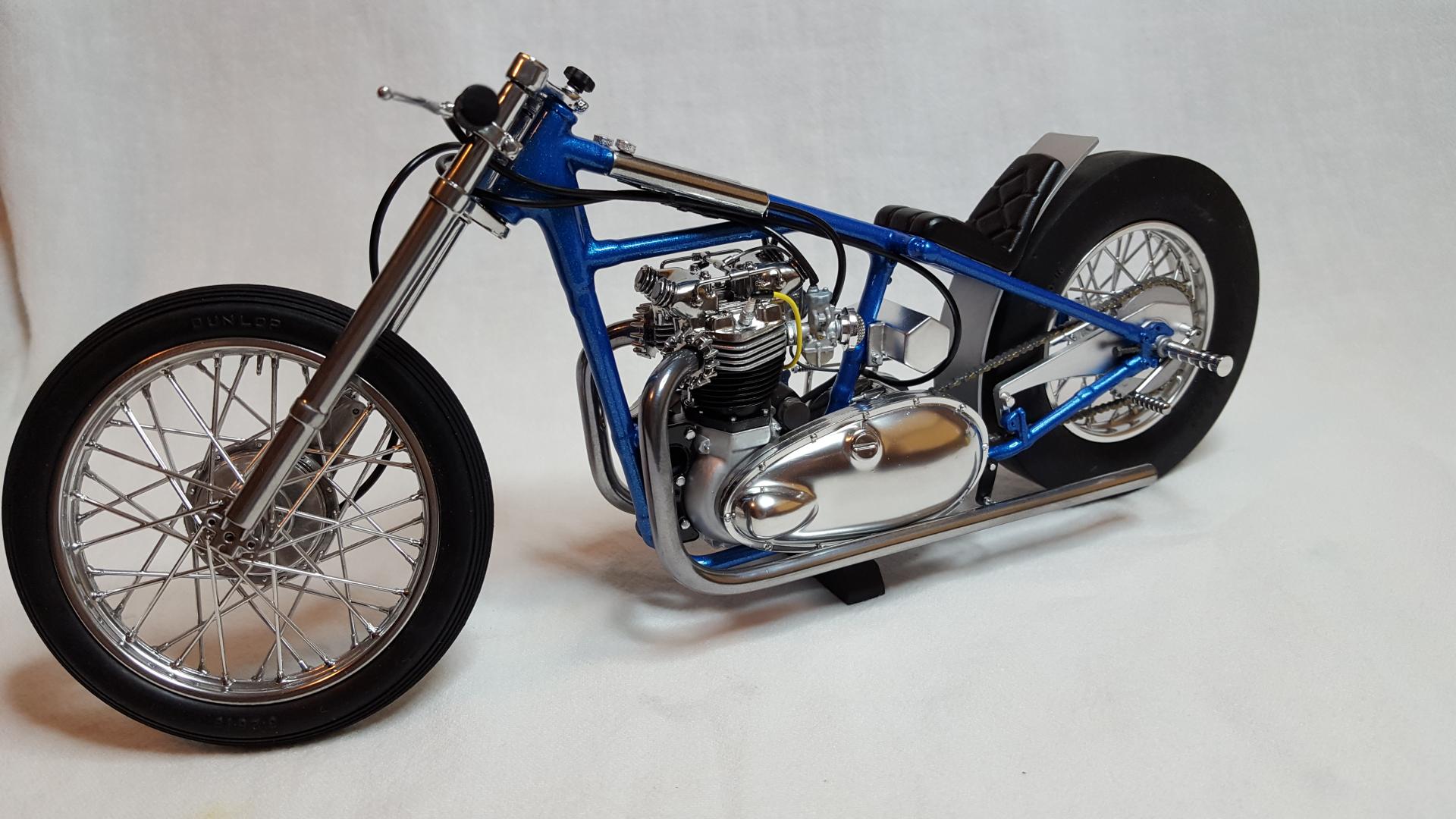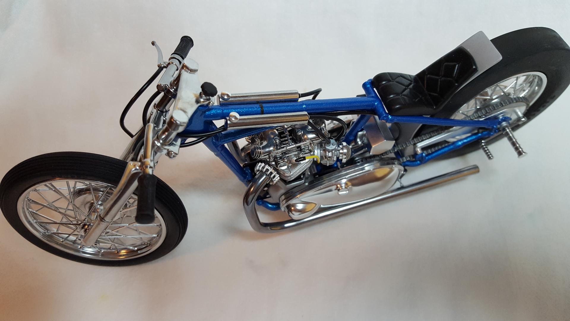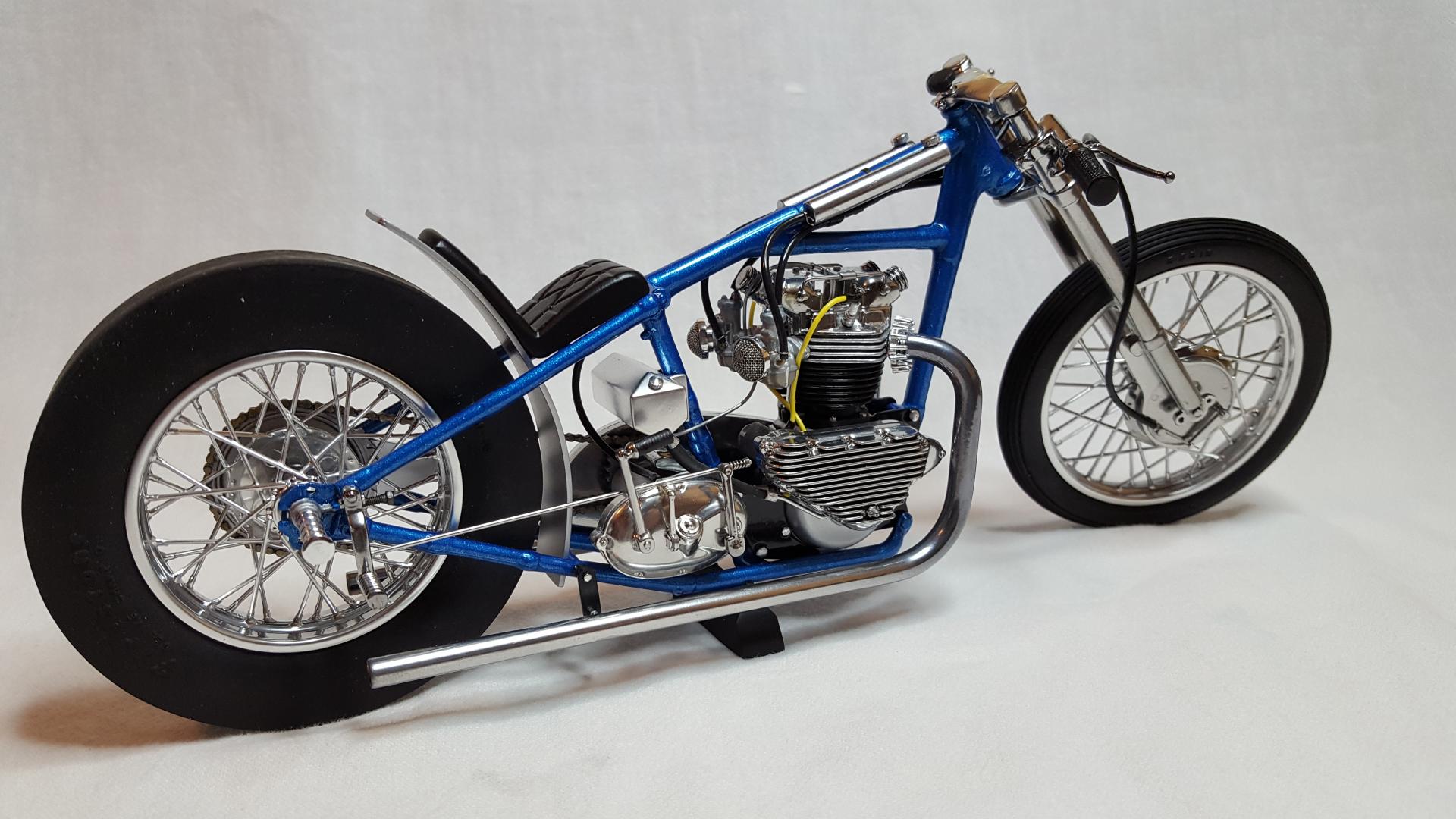Revell Triumph drag bike. I started with a custom show bike and converted it in to a drag bike, the frame was stretched. The rear tire was a ebay find. 3D printed parts oil tank & hand grip holders. Machine parts gas tanks & air cleaners. It is completely detailed right down to the compression fittings on the oil lines. All the original chome was bad and was stripped and repainted. I didn't know much about drag bikes but I do now. I was inspired by John Teresi bikes