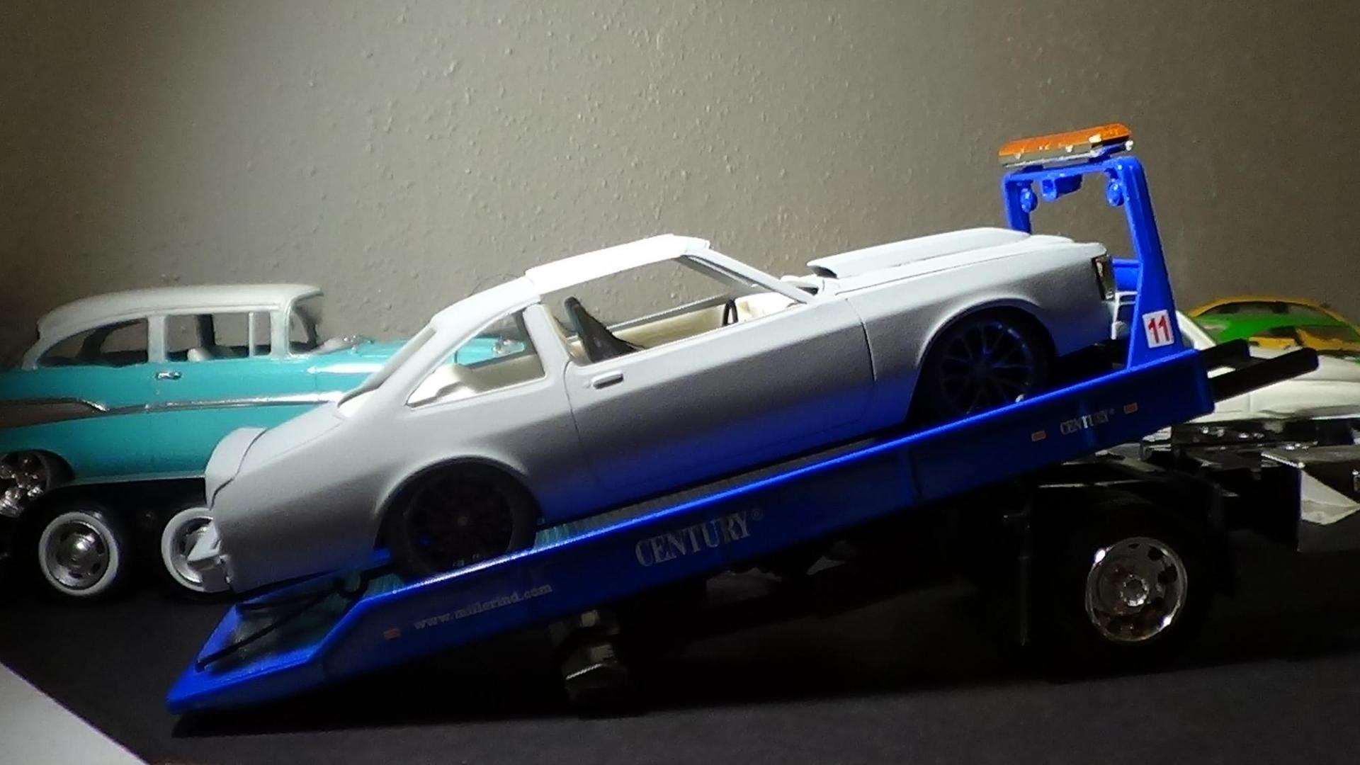 I've been working on this 1980 Plymouth Volare, from the MPC Fuzz Duster kit, for more than a month now. I though I would be just throwing it together with some cool wheels and some paint. Since I started I have decided to do new things or things I have not been 100% successful at in the past. I flip flopped for 2 weeks before I bought it, and the original intent was to make a junker. On the way out of Hobby Lobby I saw a Maisto 2013 Viper and thought the wheels would look REALLY cool on the Volare. So, with 40% off coupon in hand (or on phone) I purchased both and started this journey. I purchased the donor Viper and the Volare the following day. In between I had a slow day at work and looked up all kinds of Google images of the kit and Pro Touring Plymouth Volares. If you're part of the Facebook or youtube model car scene you MAY have seen this thing before. So, the day I purchase the kit from Hobby Lobby I sat down and tuned into Youtube and one of my favorite builders (MrMinidreams) had picked it up and had the same idea. I'd like to see what he does with his. It all started with pulling the Viper apart, and trying the wheels underneath this beast. The wheels started turning in my head and I thought of a Hellcat Volare...what would that be like. I contacted Mrminidreams and he put me on to ClearlyScale and I purchased a 6.4 liter 392 cubic inch supercharged Hemi with 6 speed gearbox. I had to notch the frame a bit to get it to sit down in the Volare, but that what you do when you want to get it in there. Once I got the headers painted I noticed they would hook up really nicely to aluminum tubing for a more realistic exhaust system. Why not? I am trying new stuff. Take a look at the pics. More to come...