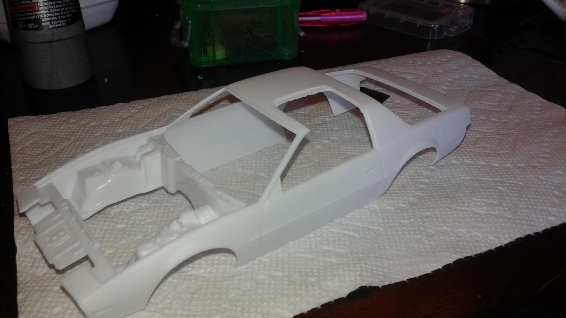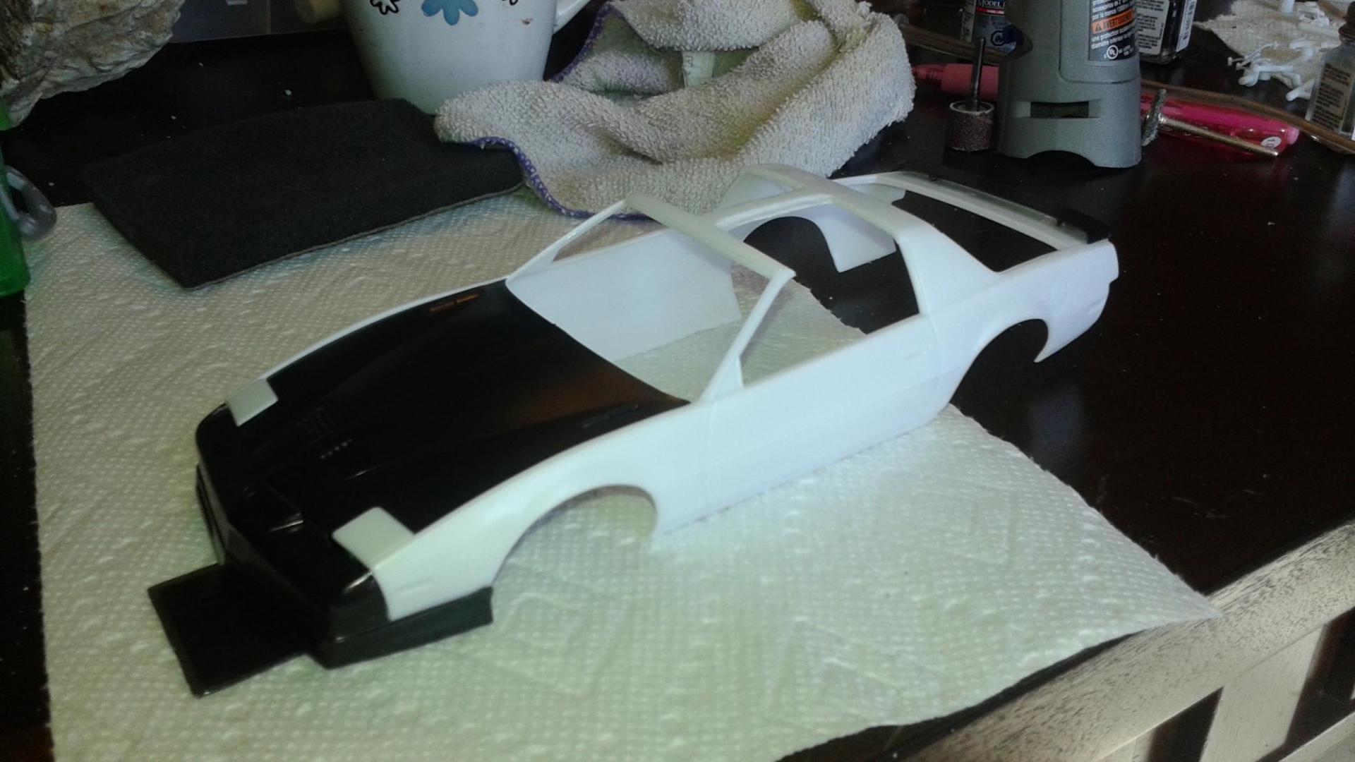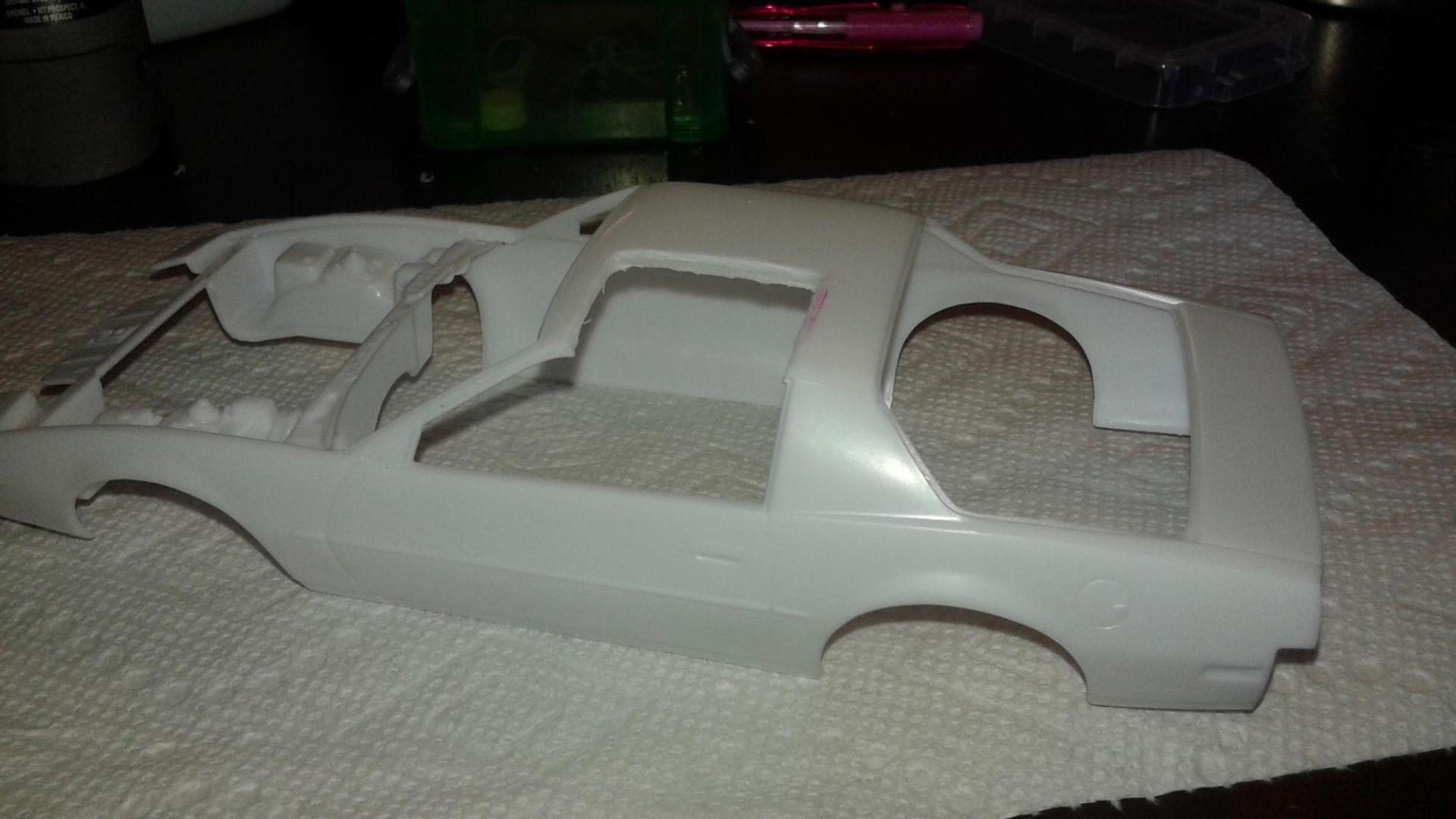 I'm using 3 kits on this build. A Monogram '92 Firebird as my main base, a Monogram '87 GTA, and a MPC 1985 Trans Am. My main problem was that I couldn't find a kit with T-tops like mine. After much back and fourth I decided to slice and dice my own out of the '92 body and use the tops from a junker Knight Rider that I bought off ebay. Under the knife... Second side... A Finished!!! All mocked up ready for paint!