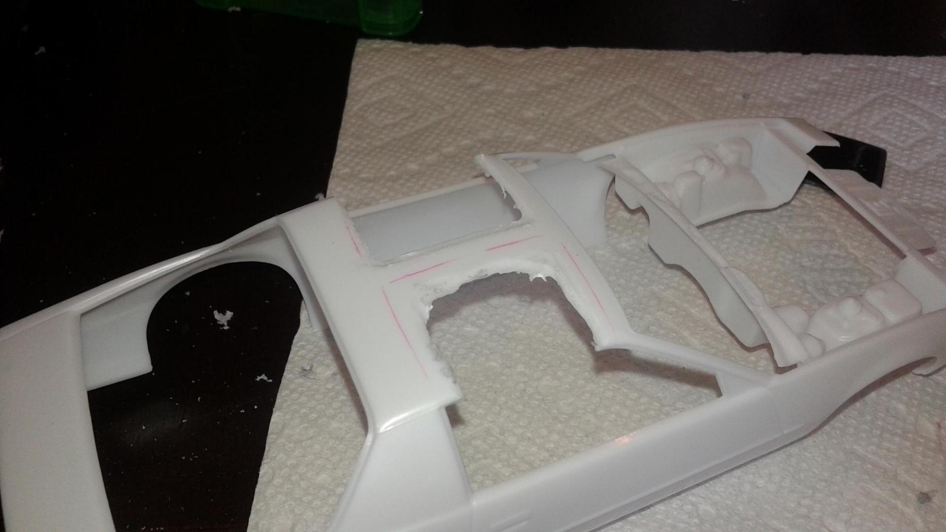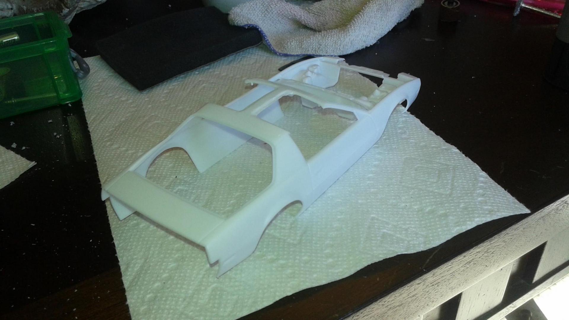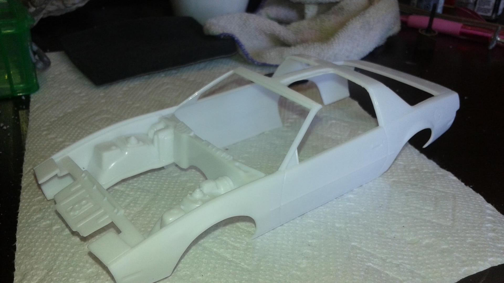 I'm using 3 kits on this build. A Monogram '92 Firebird as my main base, a Monogram '87 GTA, and a MPC 1985 Trans Am. My main problem was that I couldn't find a kit with T-tops like mine. After much back and fourth I decided to slice and dice my own out of the '92 body and use the tops from a junker Knight Rider that I bought off ebay. Under the knife... Second side... A Finished!!! All mocked up ready for paint!