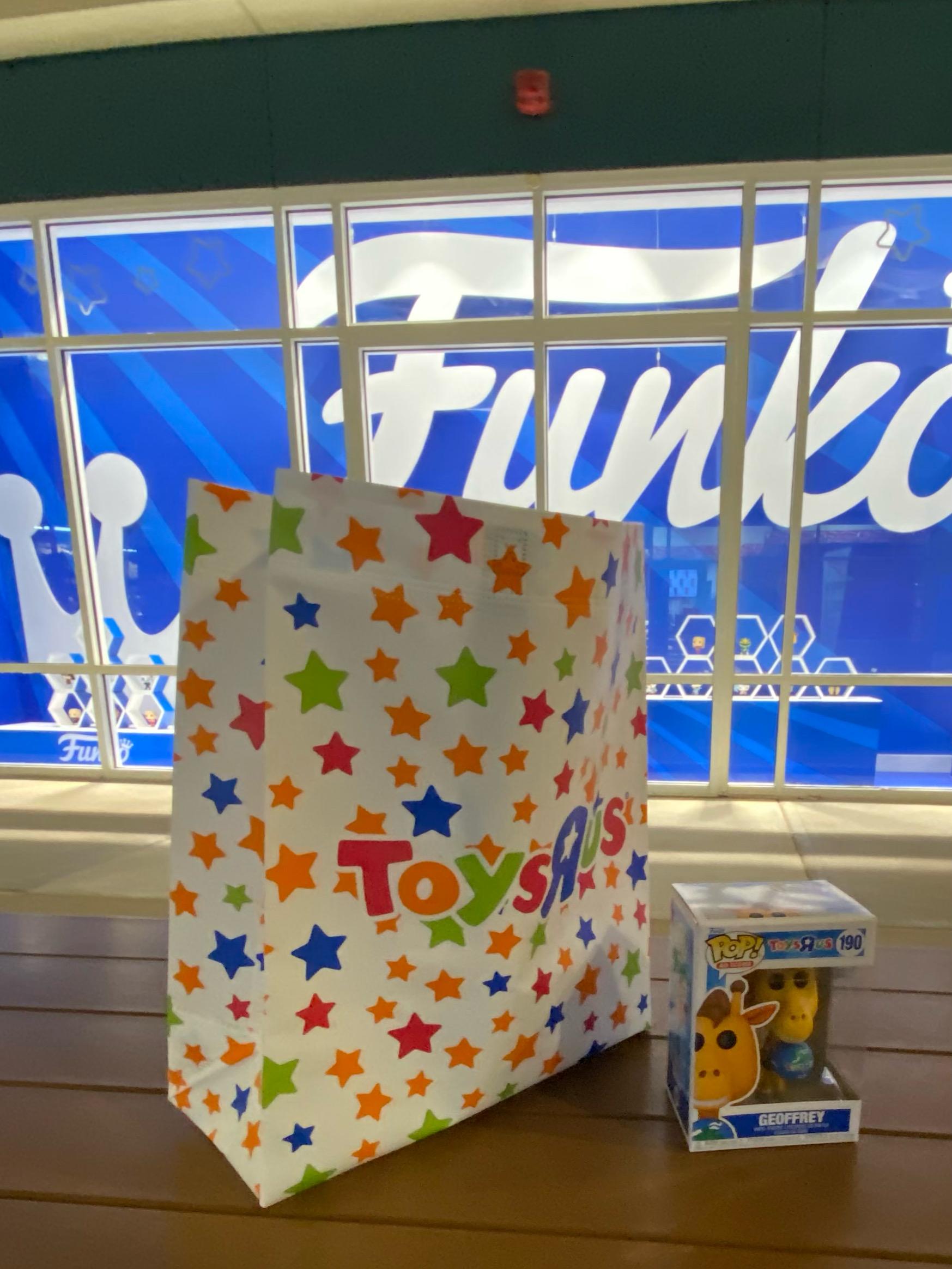 Many, MANY, moons ago I worked for a small Toys R Us for about 5 years and still miss the stores and have been pulling for their recovery as they have been trying. They just opened a new, smallish store in a “premium” outlet mall near me so we went over this past Saturday to check it out with my Dad, Sister, BiL, and Niece who was born 2 years after TRU closed all of it’s US stores. It’s not like I worked at but was neat to see. Didn’t buy anything there that day as I needed new shoes and bought a couple pairs at the nearby Nike store, but one pair wouldn’t fit, so I took that pair back tonight. Since that new TRU was between the Nike Store and where I parked, I wandered back through there and found something I was looking for before we left for home Saturday and couldn’t find………. A Geoffrey the Giraffe FunkoPOP😁 Also paid the extra buck for that bag too……. -