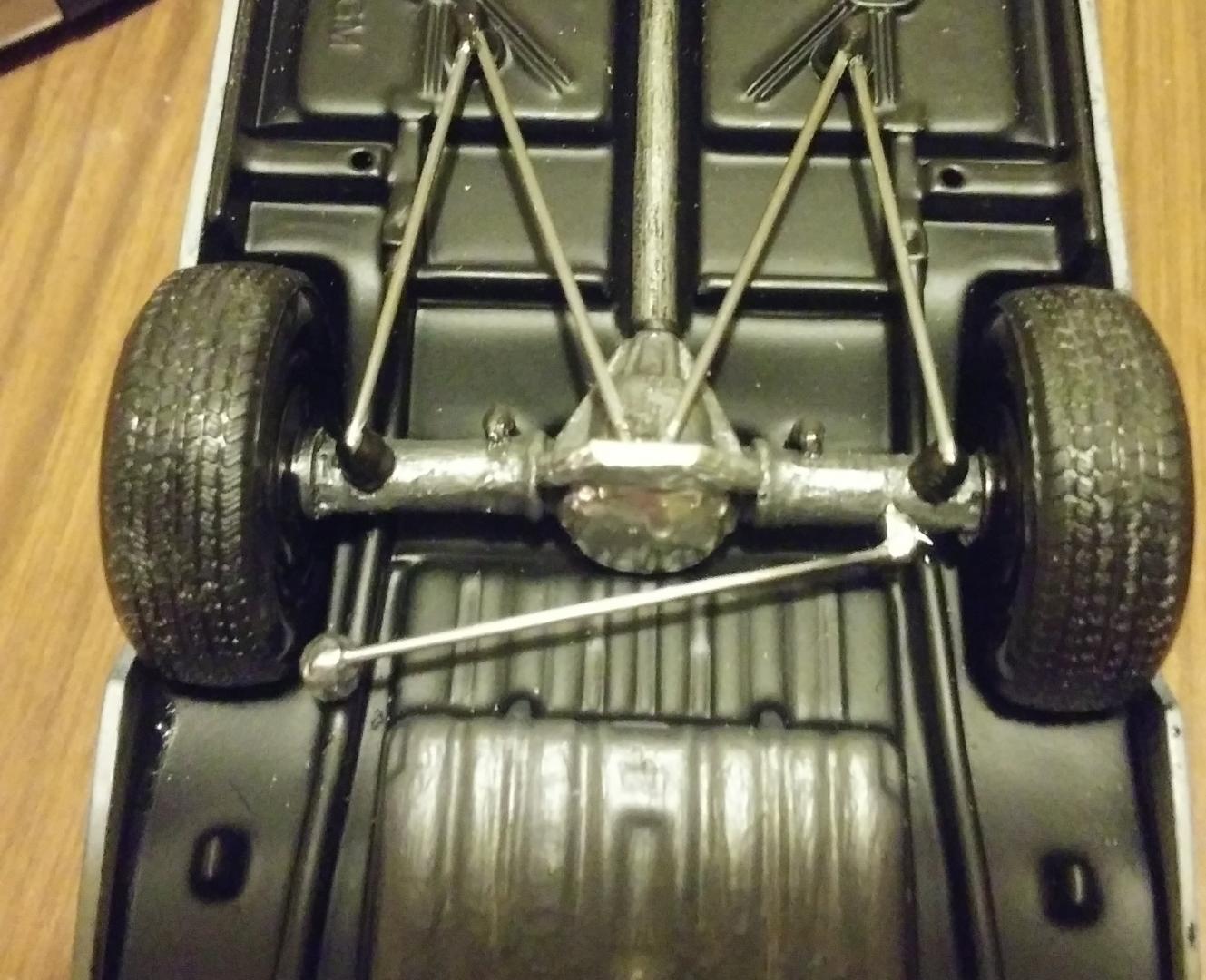 Front end shot. Thanks Johnt671. Its been fun so far. The front end components werent wanting to mate up properly so i decided to scratch build them as well. Only thing used from the kit are spindles, springs and upper a- arms. Rest will be by hand. Flipped spindles to lower the front end down like i am doing to the rear end.