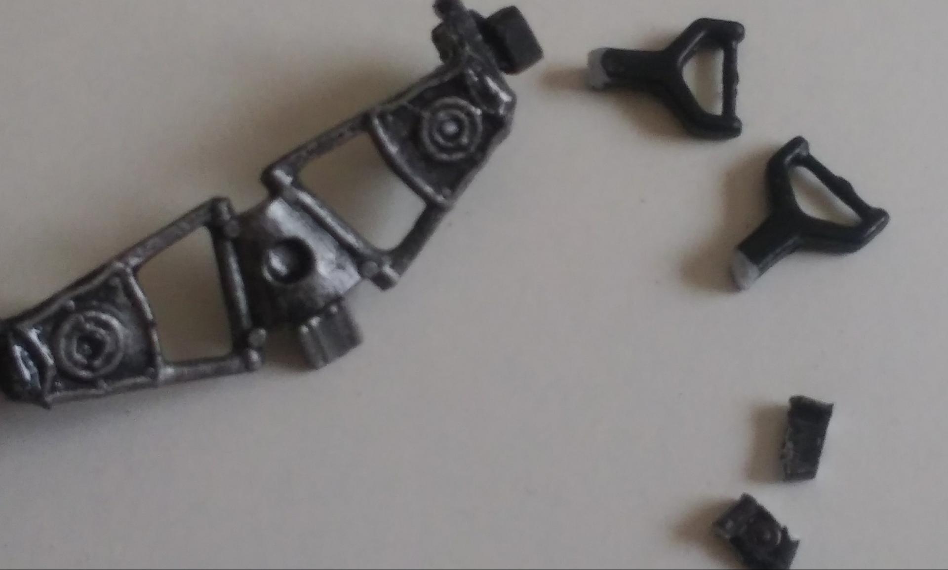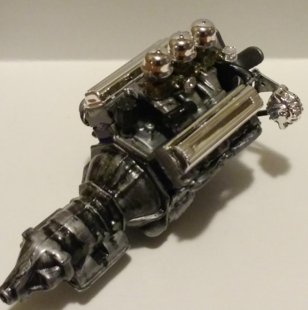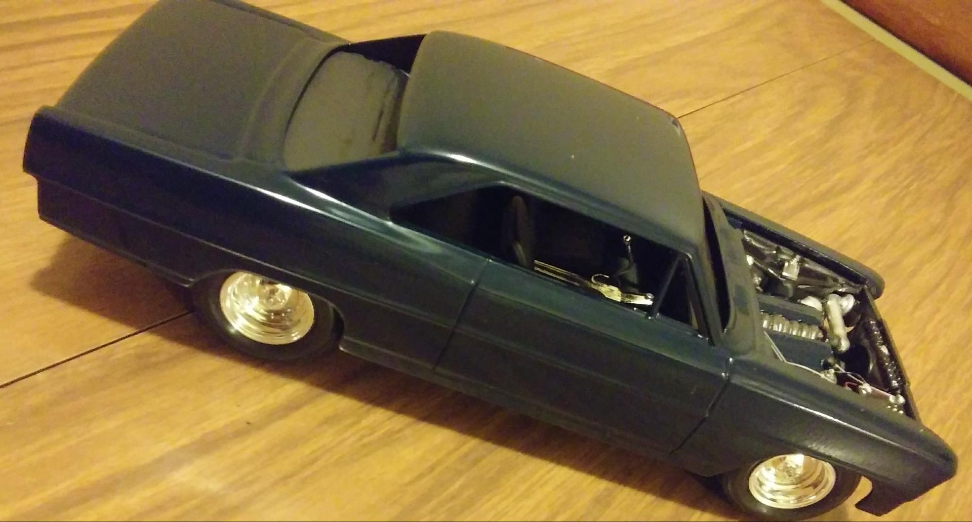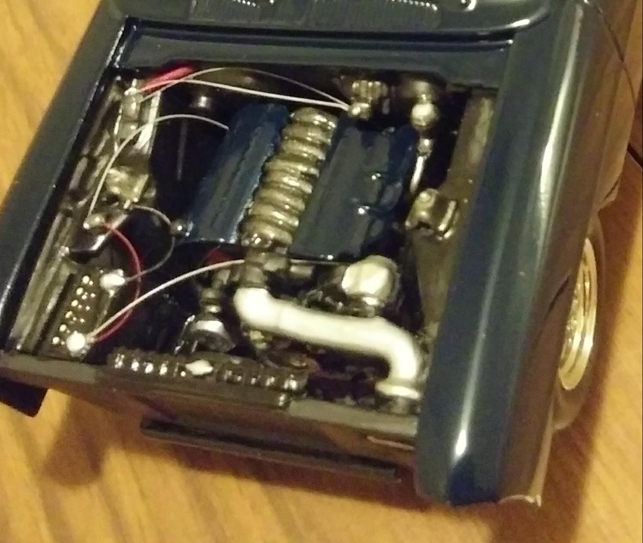 Had to make some thicker mufflers. So i used some thick spruce sections from a different model thst holds chrome parts to make them up. The original mufflers melted when i applied a bit of glue to them to fix all parts of exhsust together so i cut them off at the clamp and sanded the edges down at an angle to make these. Think they came out decent. Thinking of either painting them chrome or red like old school cherry bombs. The blacked out part is after completion and the glue had set. Chrome is when i first built them.