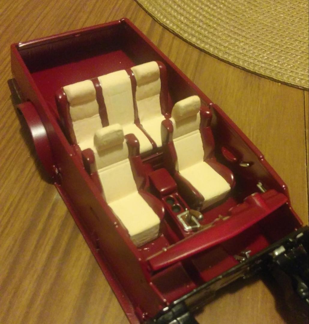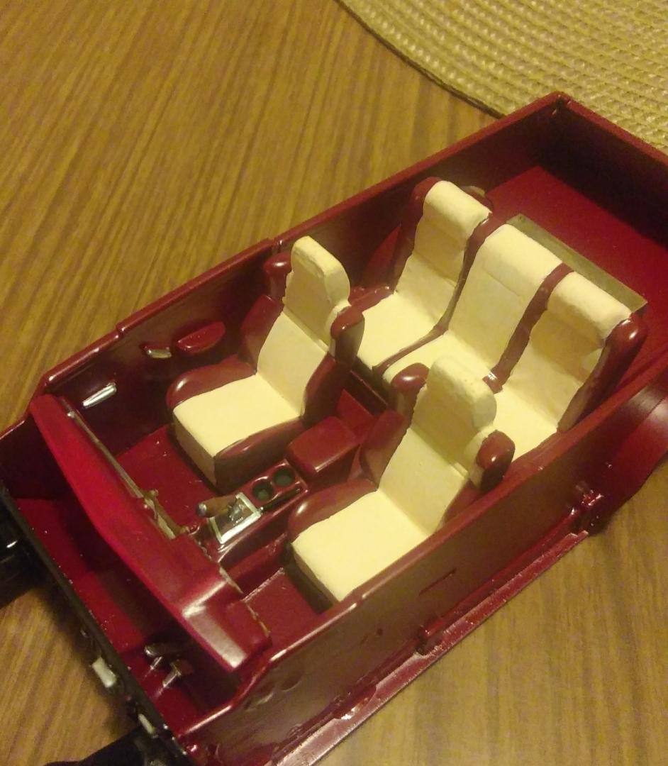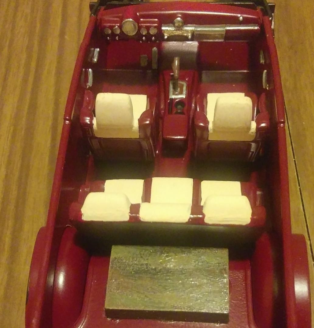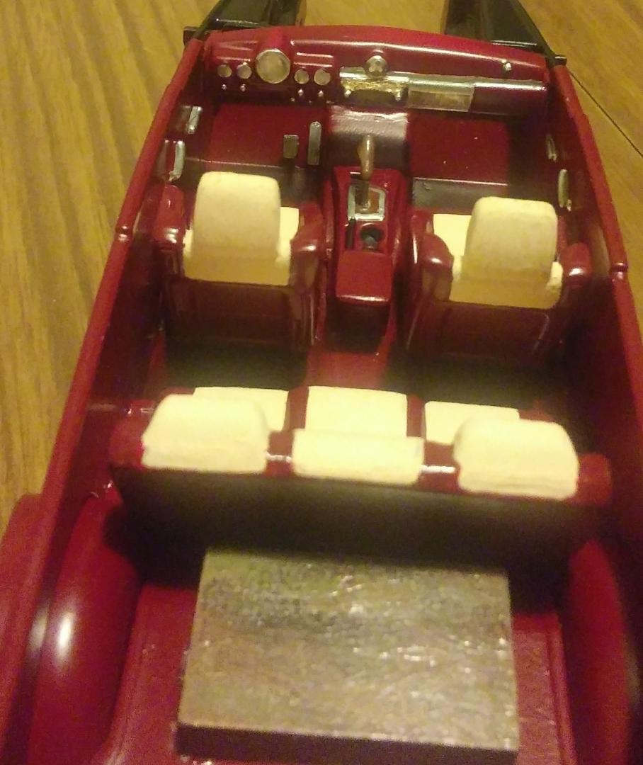Sorry yall for not posting. Been really busy recently. Here is an update. Interior is complete. Satin burgundy with a antique peach inset. I think it came out rather nice. The challenger interior parts really seem to work in the car. I recently picked up the 49 merc by revell with multiple parts. Snagging the smooth bumpers for this one and uding the ribbed bumpers on the 49 coupe.