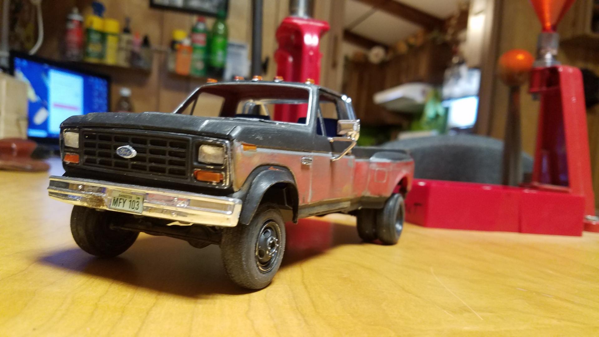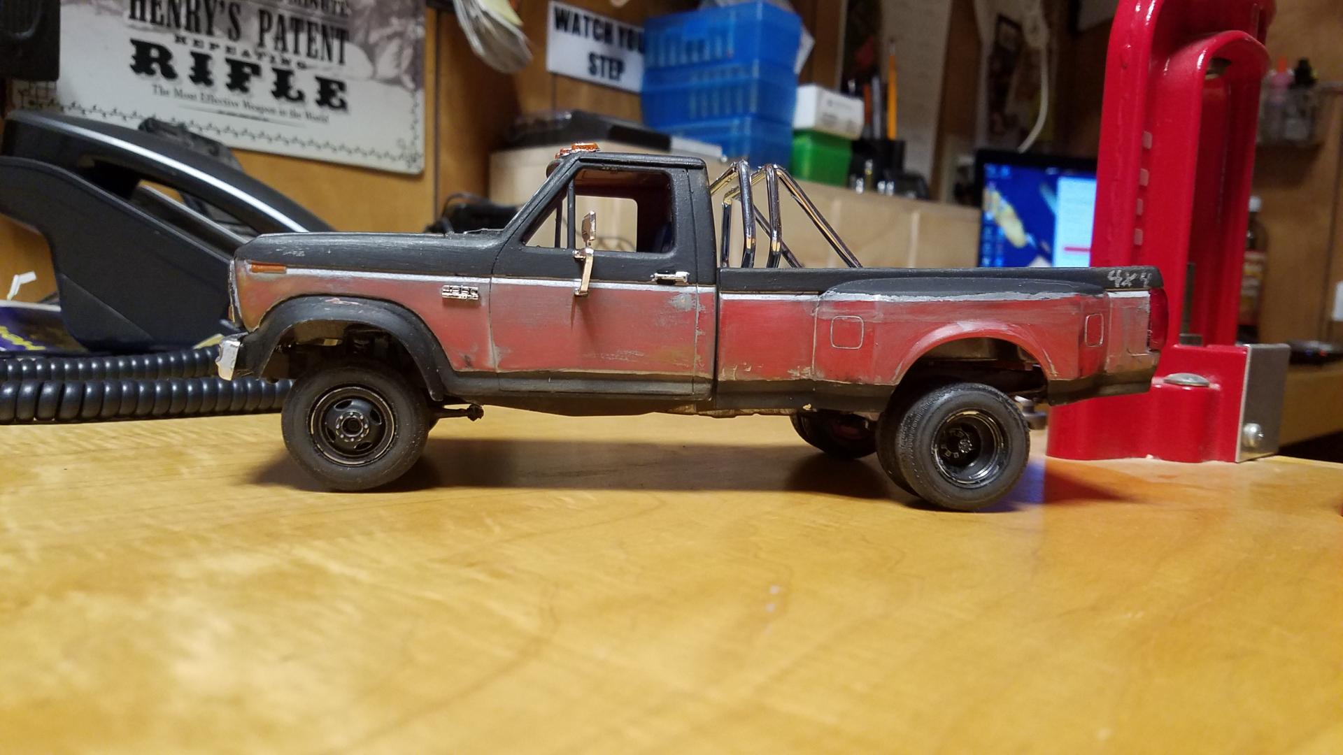 I have had a huge pile of old ford parts kicking around for awhile and got to throwing this together awhile back. It is finally at a mock up point where i can post it. It has an '80 cab and interior bucket as well as the front 4x4 axle. the bed, seat, steering wheel, roll bars, and the wheels and tires all came from two 1991 kits, the engine, transmission and and rear half of the frame came from the amt '78 kit as well as other parts from other things. Its far from done but here it is so far, i know it is far from accurate but i like the pieced together look