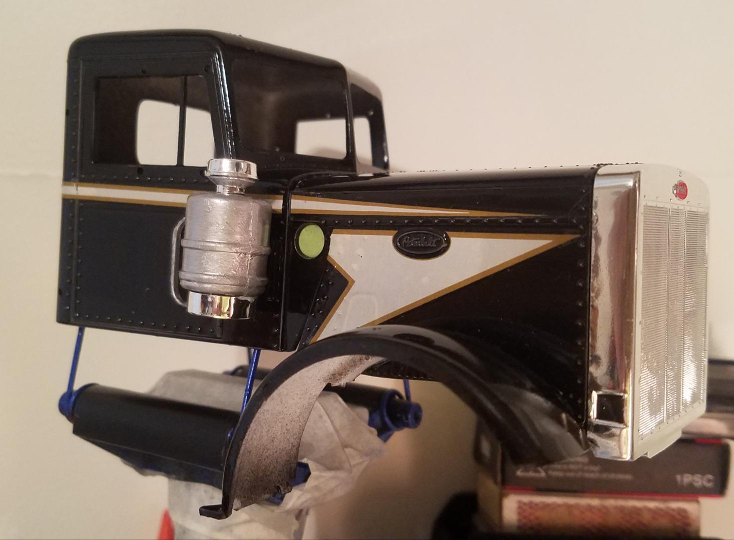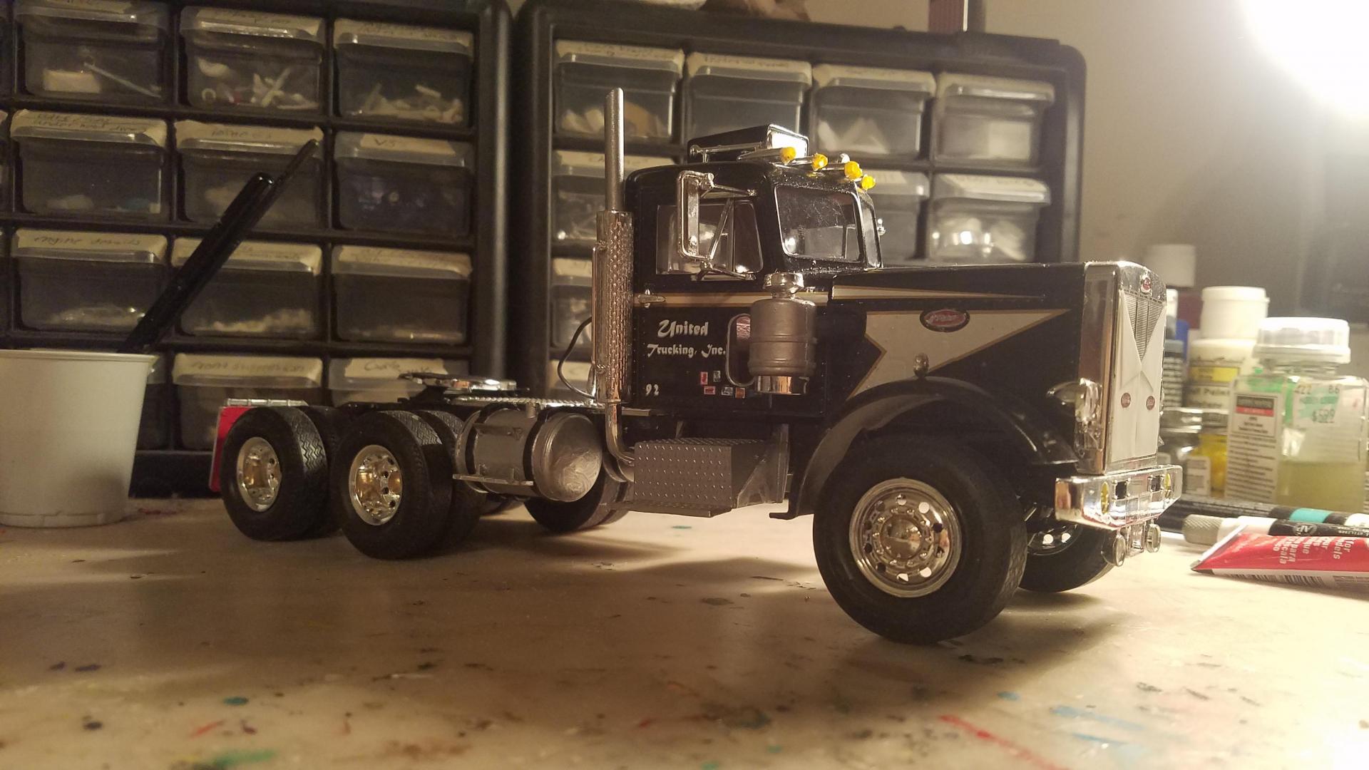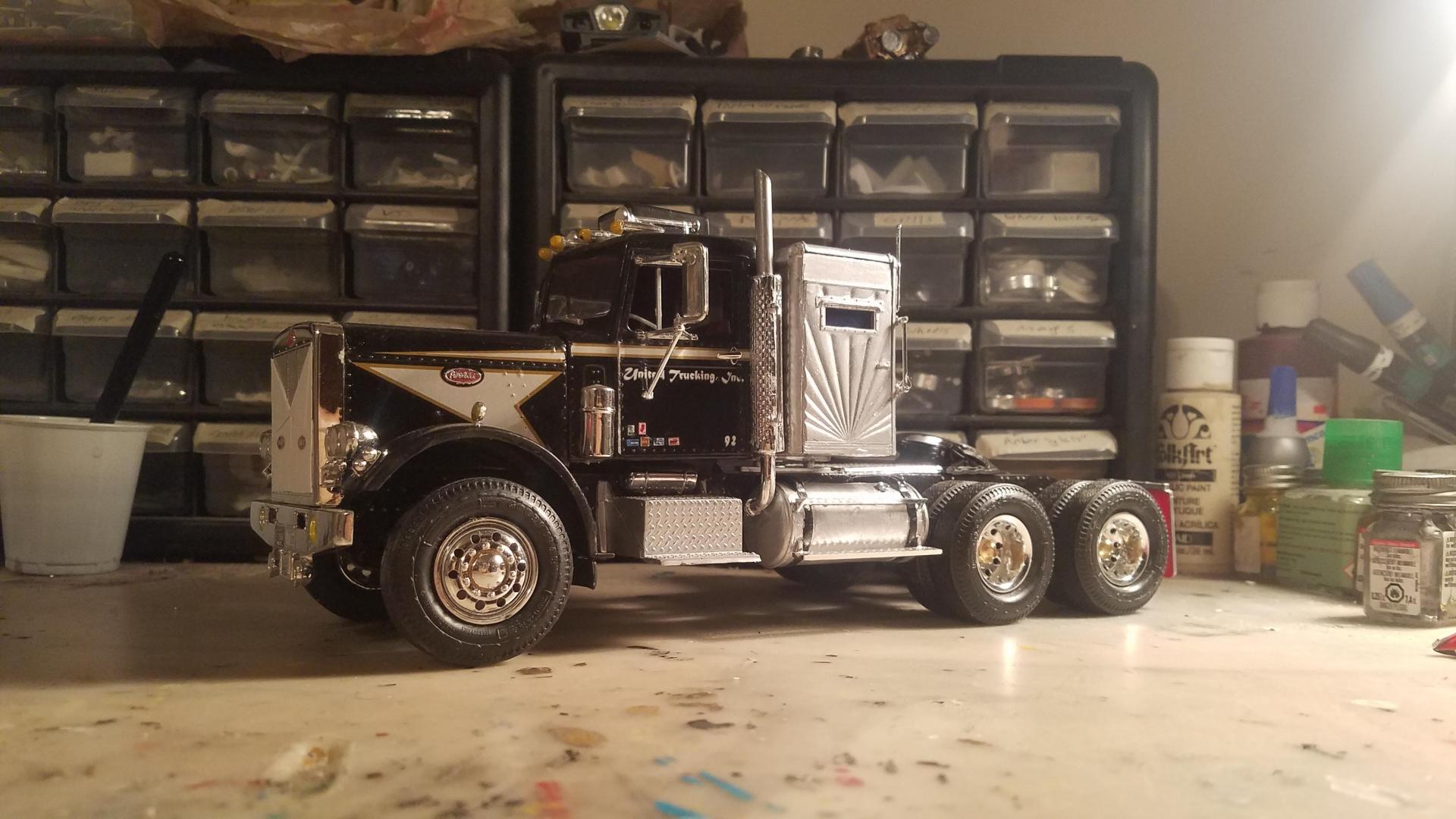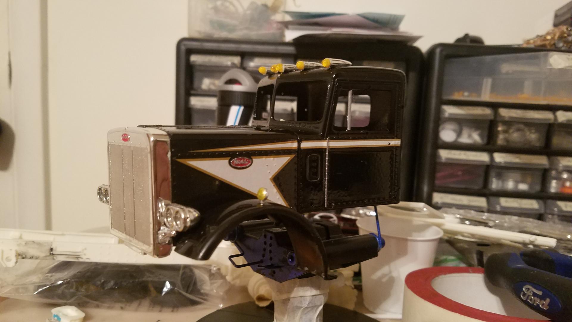 I have made some progress and now she is almost complete. I now have bothe stacks on, both mirrors done and the interior bucket glued to the frame. I added a larger tank on the drivers side and put steps on both tanks, decals done on both sides the passenger side seems to be lacking somthing, it just doesnt look as nice for some reason. I also got the ac painted and glued on. As of right now i have to put on the exhaust pipes, paint the underside of the hood and glue in one last window. I also have to fix the passenger side front hubcap thats crooked and the antenna that for some reason leaned. Sorry for the long winded post, any suggestions or comments welcome. -