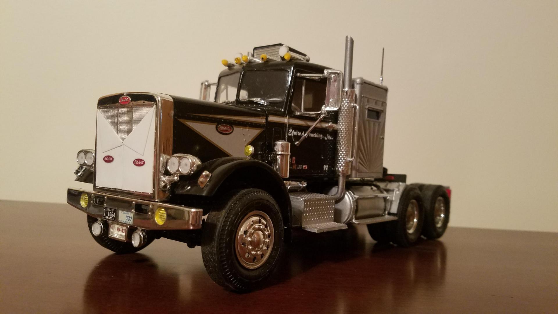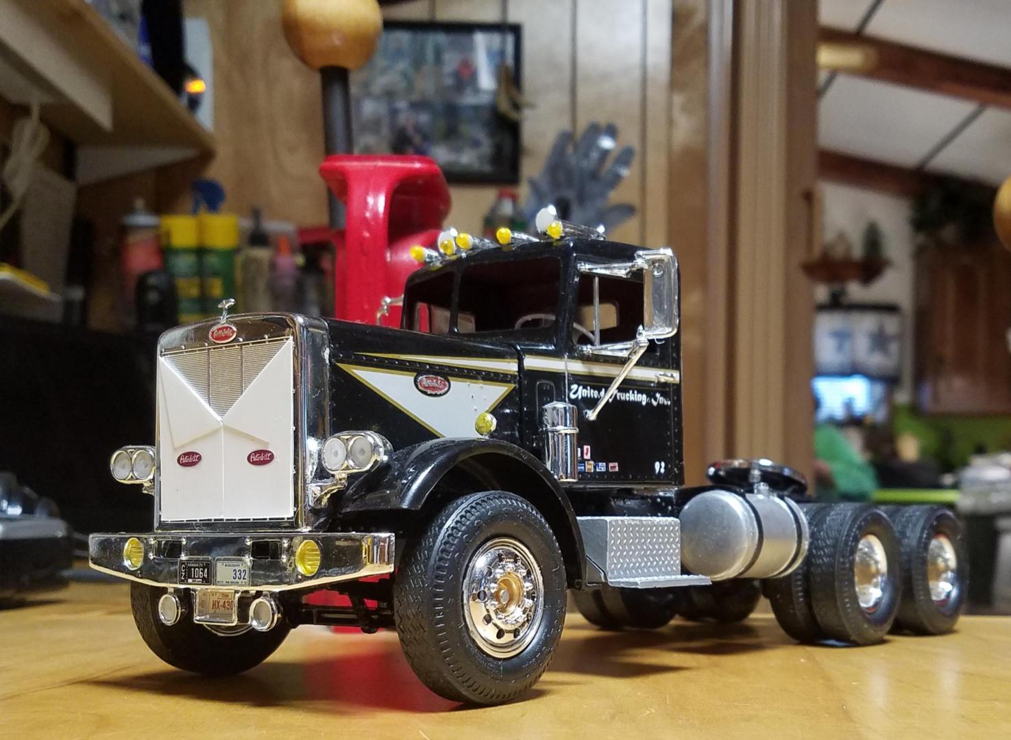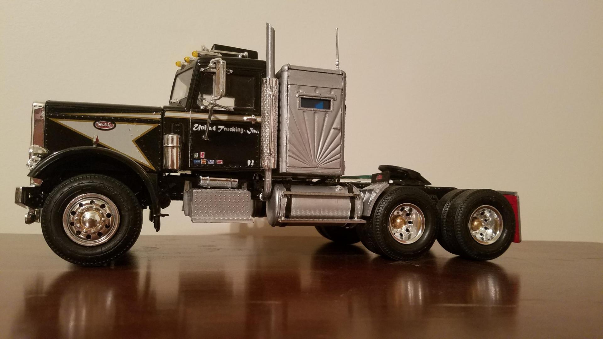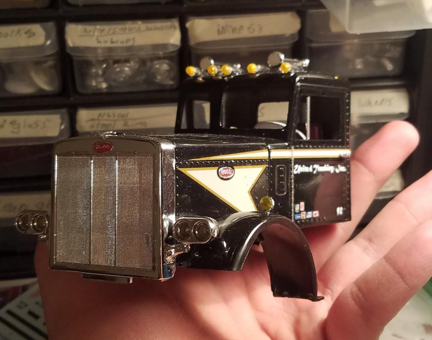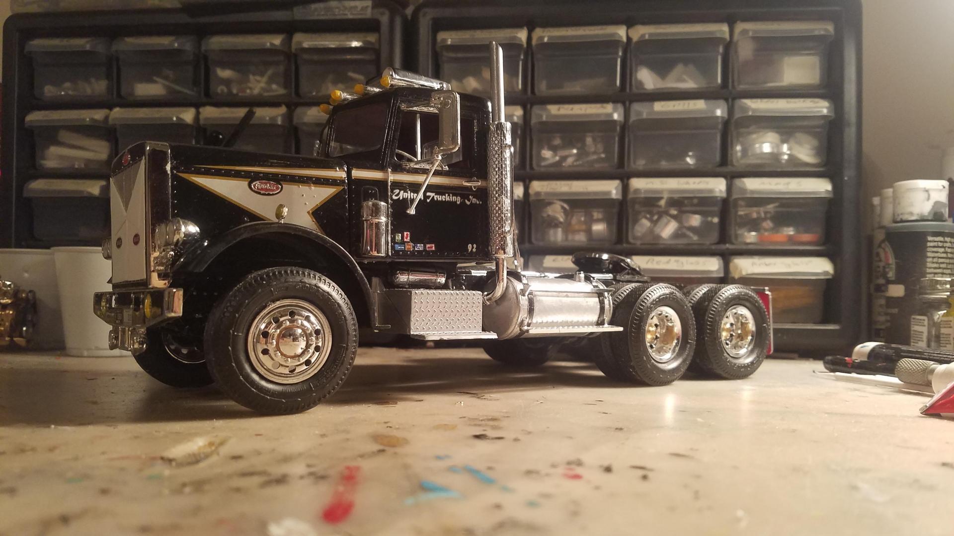 I have made some progress and now she is almost complete. I now have bothe stacks on, both mirrors done and the interior bucket glued to the frame. I added a larger tank on the drivers side and put steps on both tanks, decals done on both sides the passenger side seems to be lacking somthing, it just doesnt look as nice for some reason. I also got the ac painted and glued on. As of right now i have to put on the exhaust pipes, paint the underside of the hood and glue in one last window. I also have to fix the passenger side front hubcap thats crooked and the antenna that for some reason leaned. Sorry for the long winded post, any suggestions or comments welcome. -