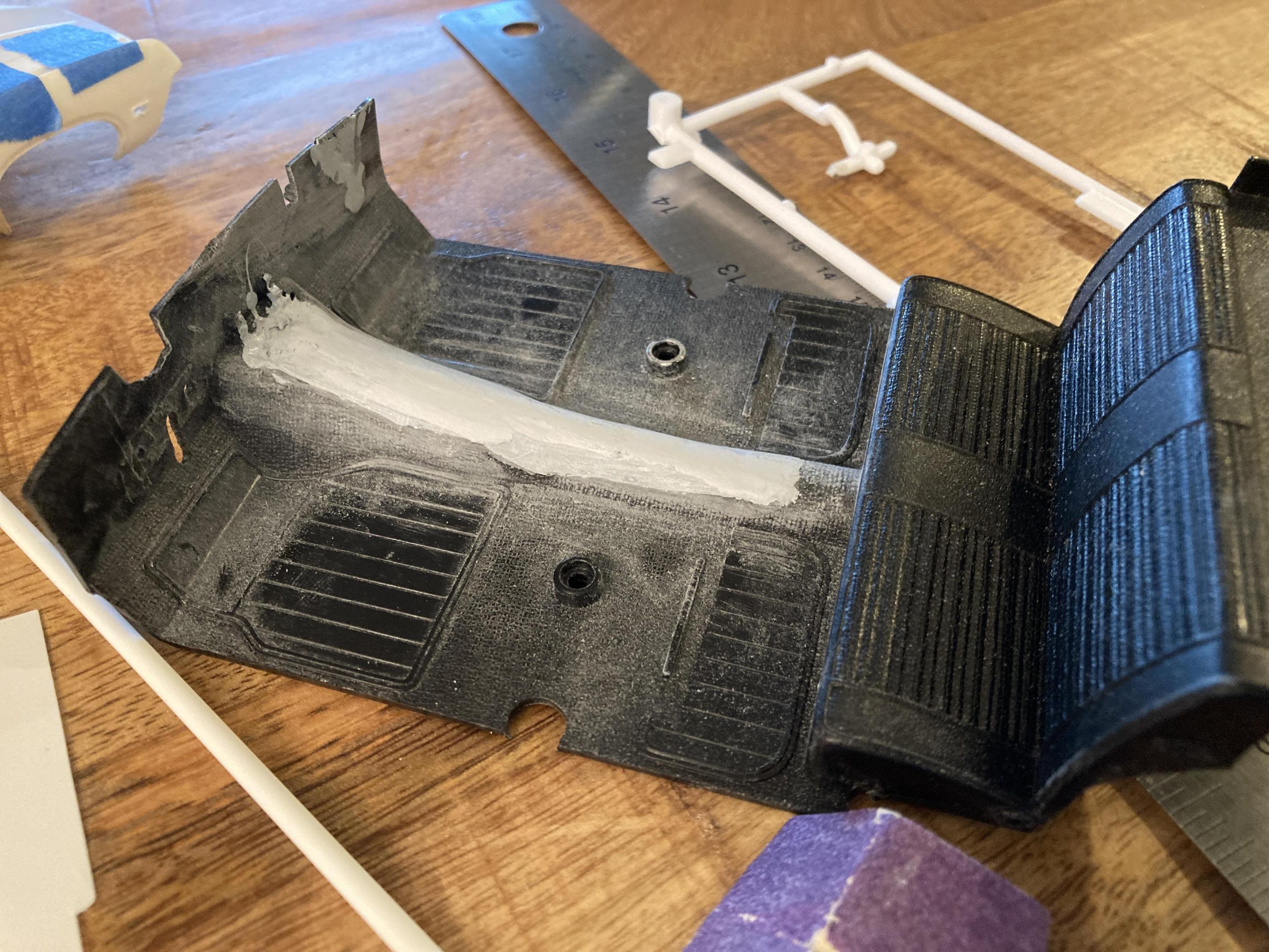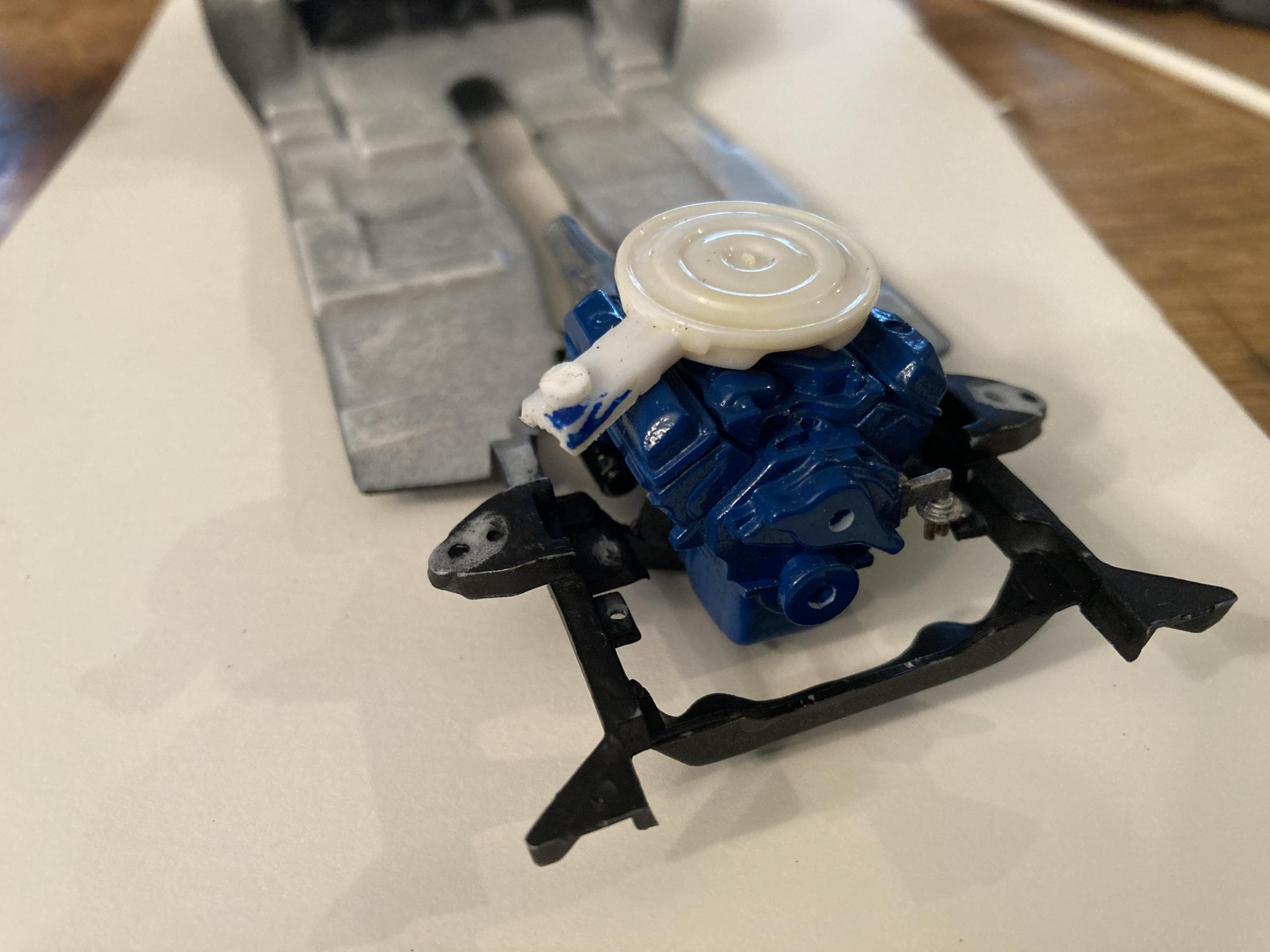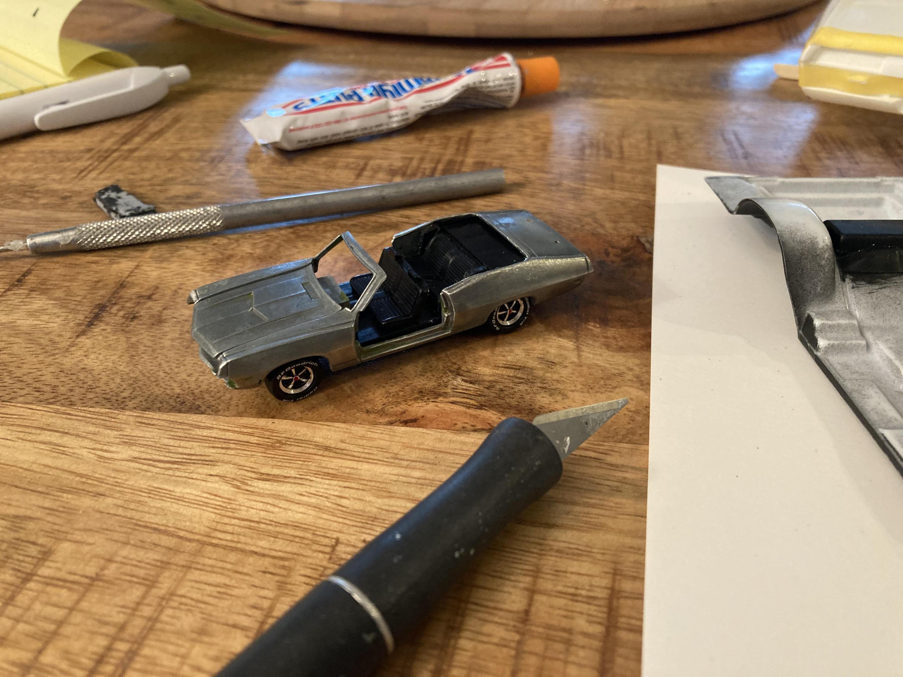 Working getting the Mach 1 mustang to sit in the Torino chassis. Little trim and shim. Also added an actuator to the Air cleaner. 1:64 scale interior is coming along. Top removed and shaving the fast back deck. Found a donor with perfect bench seat. 1:18 scale interior is shaping up (removed console).