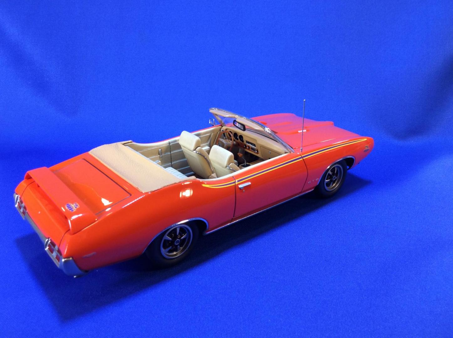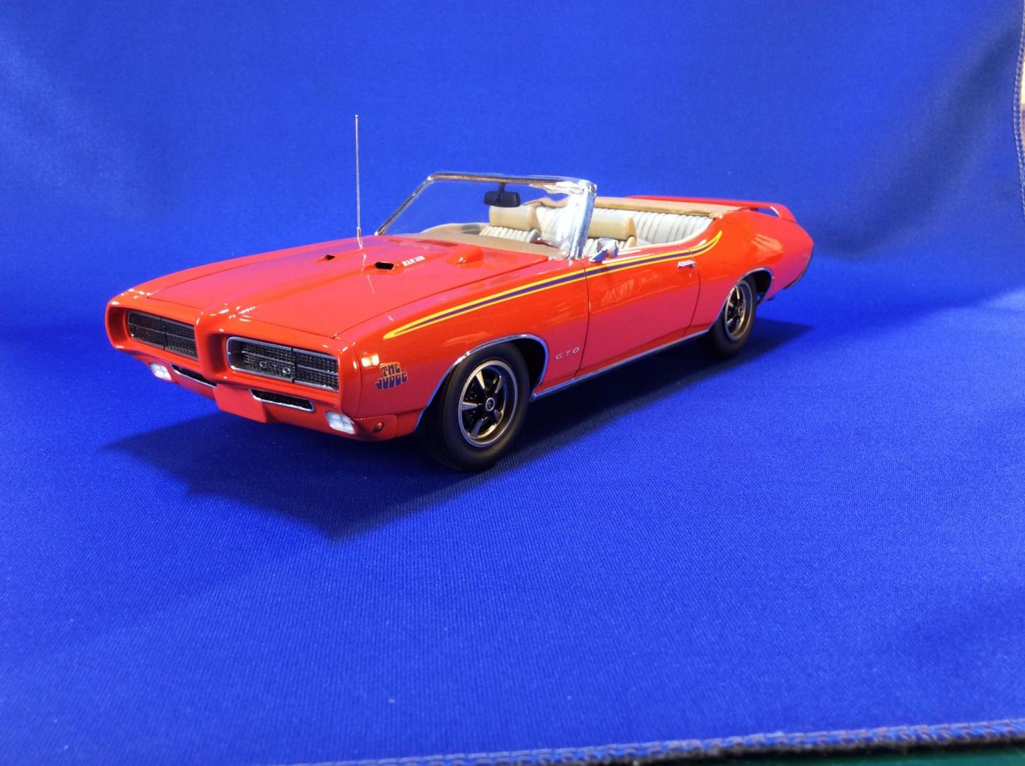 Hey fellas, here's an ole' Goat for you. l cut the roof off, and did my best at making a convertible boot out of some of the wifes "Press n Seal". It's painted in a close rendition to Pontiac's Carosel Red, with a bit of wiring under the hood. I only posted two pics because l was only allowed to post a maximum of 3.73mb of data, and each of my pictures on my i-pad is 1.4-1.7mb...If anyone has any suggestions, they are welcome.