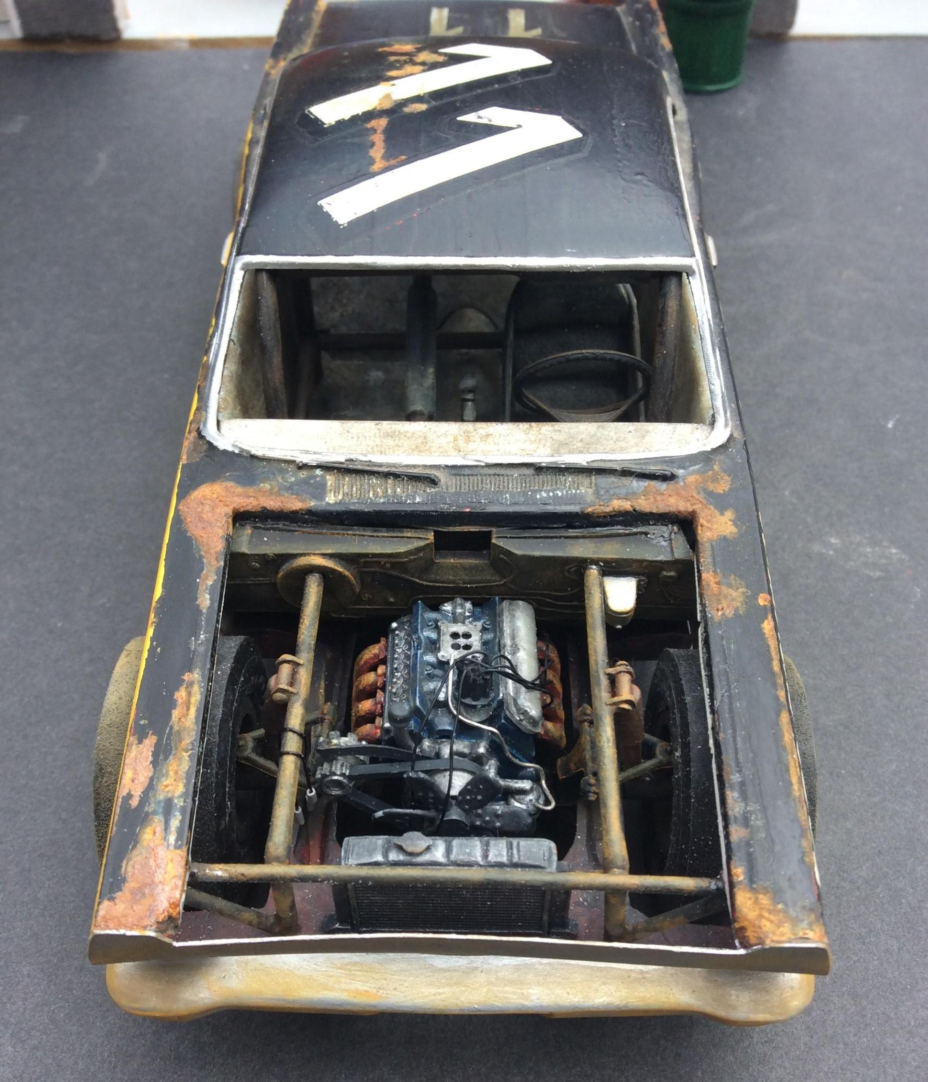 I had this old body & interior tub that I liked the old paint job on so I added a 65 Fairlane chassis, 289 engine and built some more stuff to spiff it up a little. I added rust where all the glue blobs & paint runs were too. Nothing great but I had to save it.