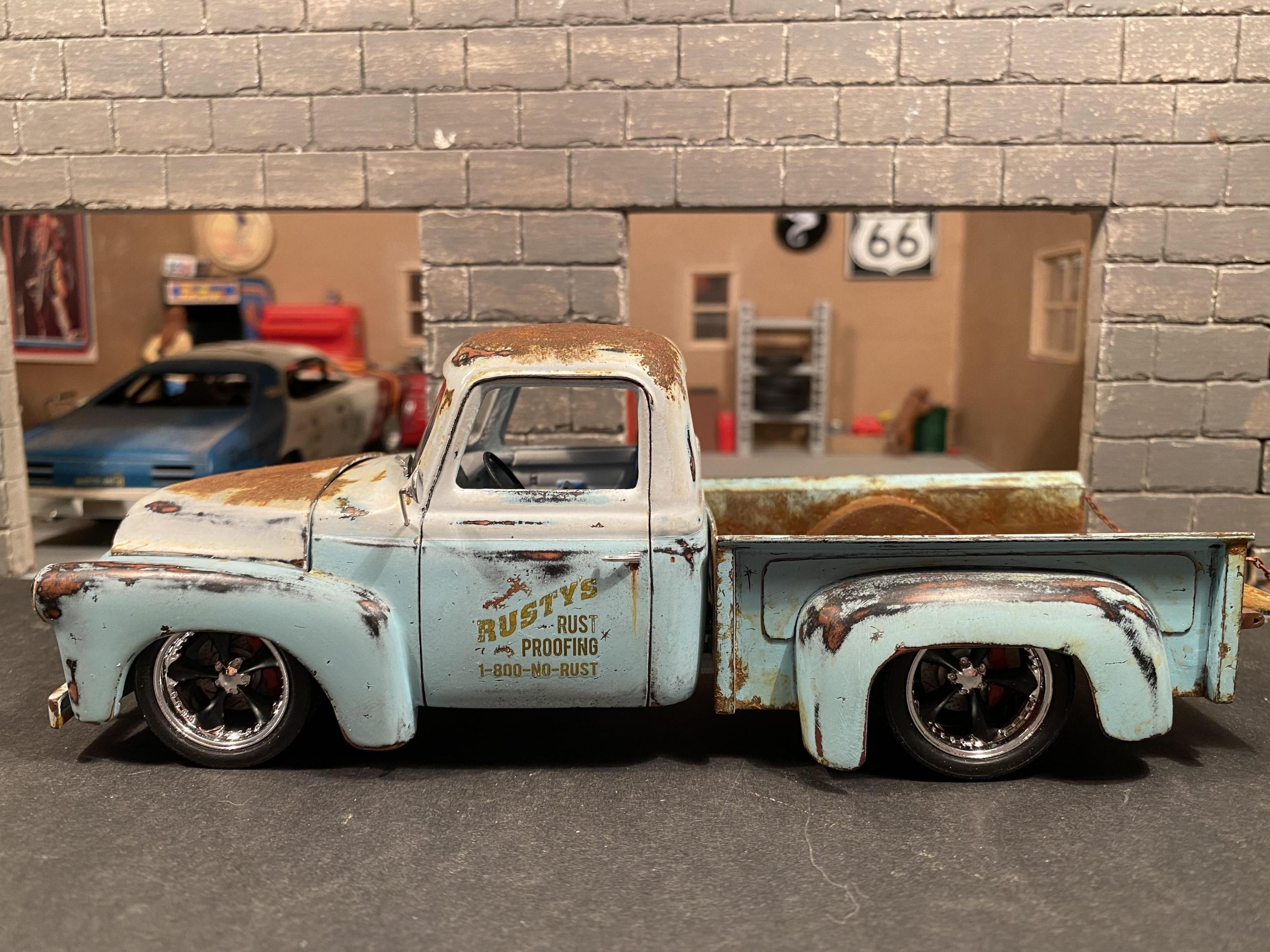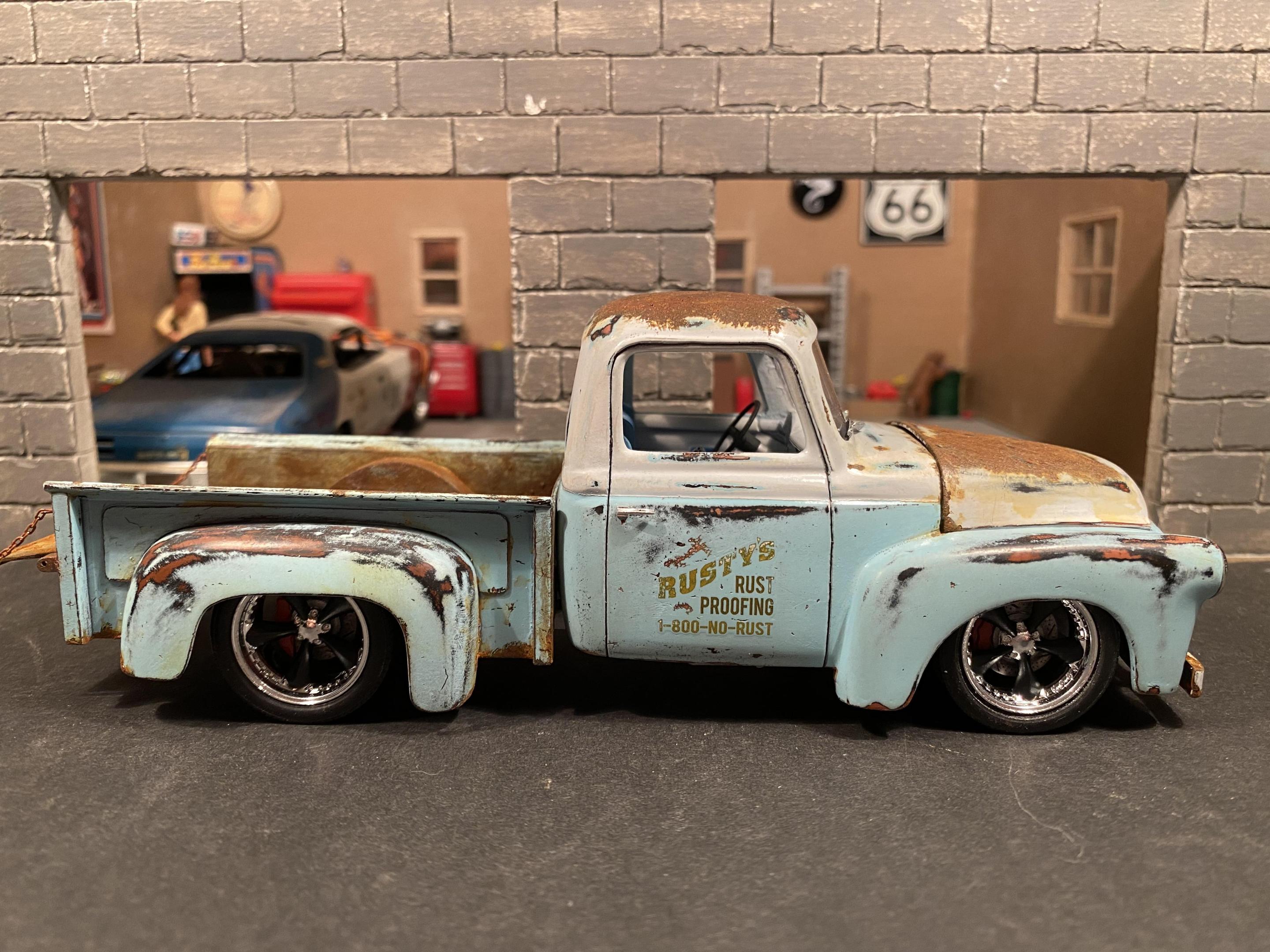 I started with a RMR resin cab, used a Foose FD-100 running gear, interior and built my own bed. Decals from a 50 Chevy just for fun with one of my rotten paint jobs. I'm glad to see it finished, hope you like it. -