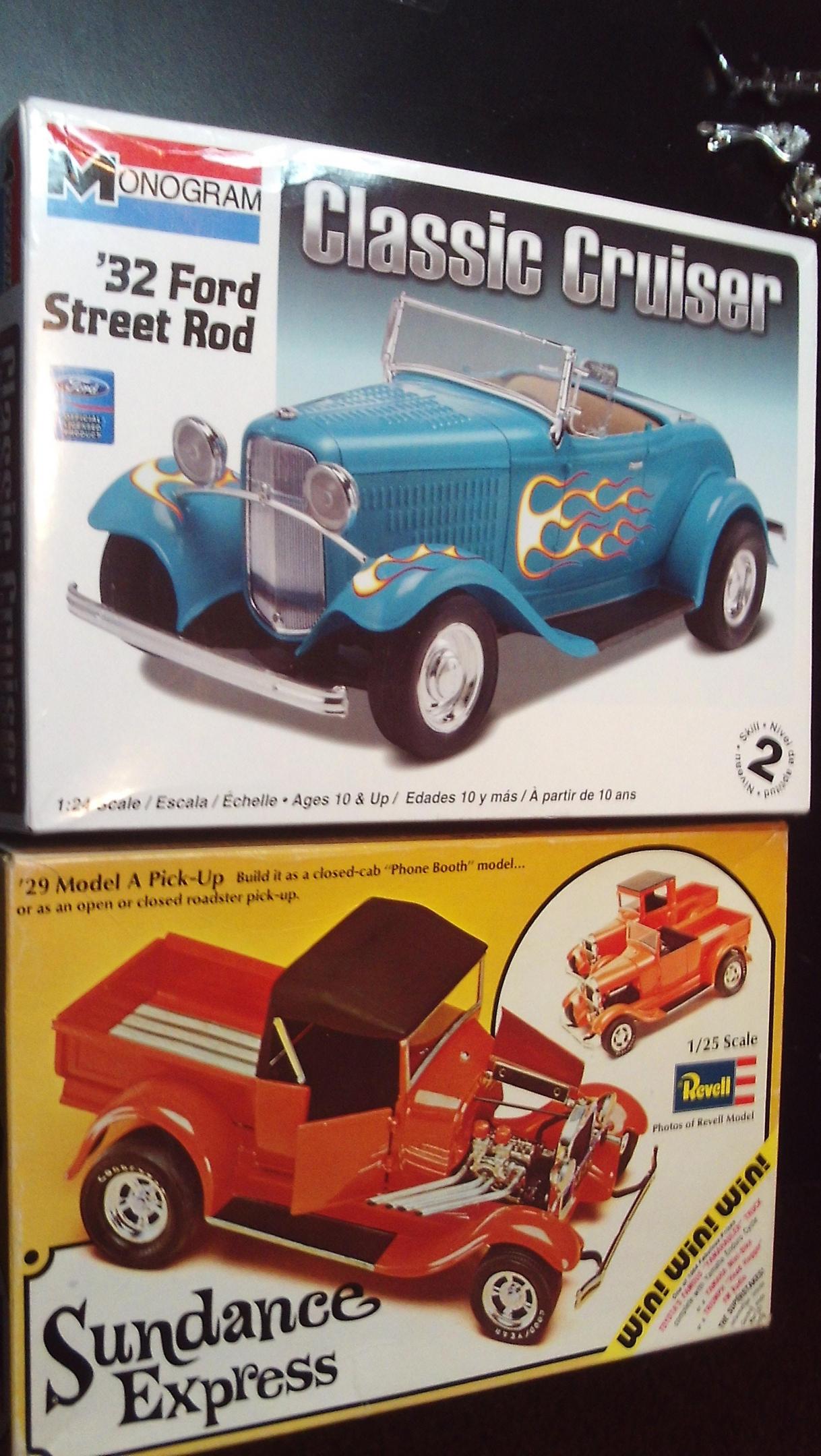 I had this horrible Monogram 32 Ford kit & a bunch of left over Model A parts so this is what I came up with. I tried to sell the 32 kit for $7.00 on ebay & couldn't, so when I opened it I saw why.? Not much detail at all & the fenders had the chassis molded in it so I wasn't going to use it. But after looking at the parts I had I figured, why not. I shortened the chassis to make the cab & bed fit better & the bed is from an old early iron roadster pickup. It came out pretty good, Ill get some better pictures outside tomorrow, it's raining like a cow wizzing on a flat rock today.