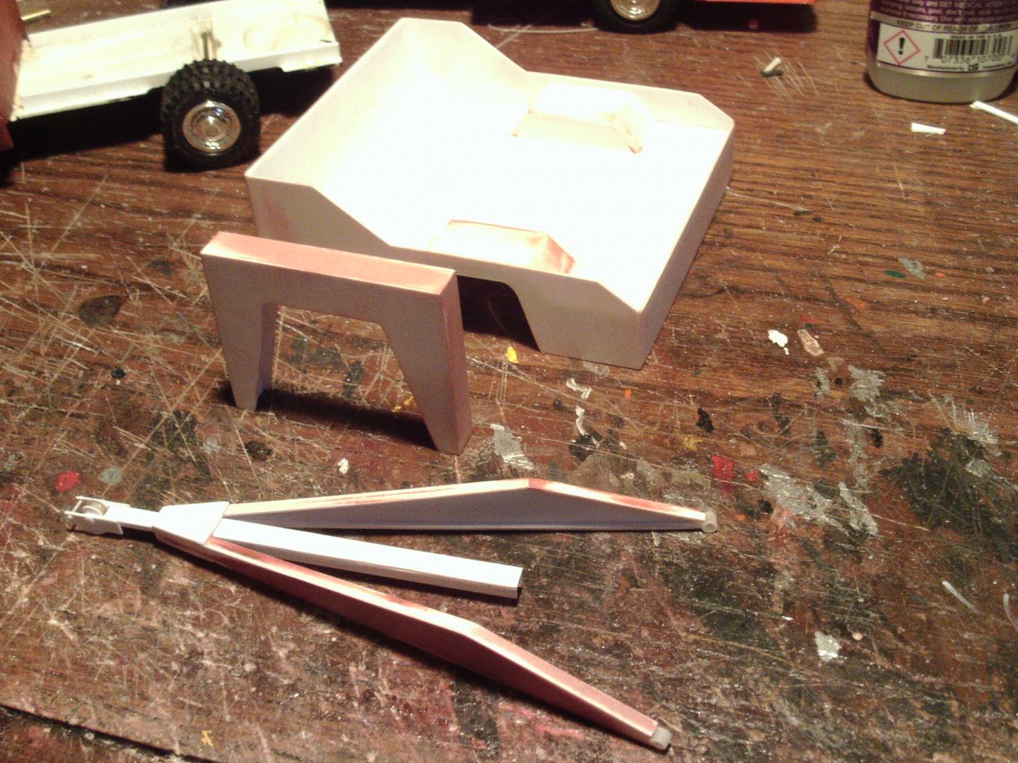 Digging through some stuff, I found a box full of Cooter's tow truck parts. 3 built trucks with tons of missing parts. So I figured I'd build one box stock & one "my way". This one is the "my way" version. I started by stripping the paint off the cab & chassis & giving it some primer. I didn't have a complete wrecker body for it so I built my own. I don't like the way the kit one is anyway.