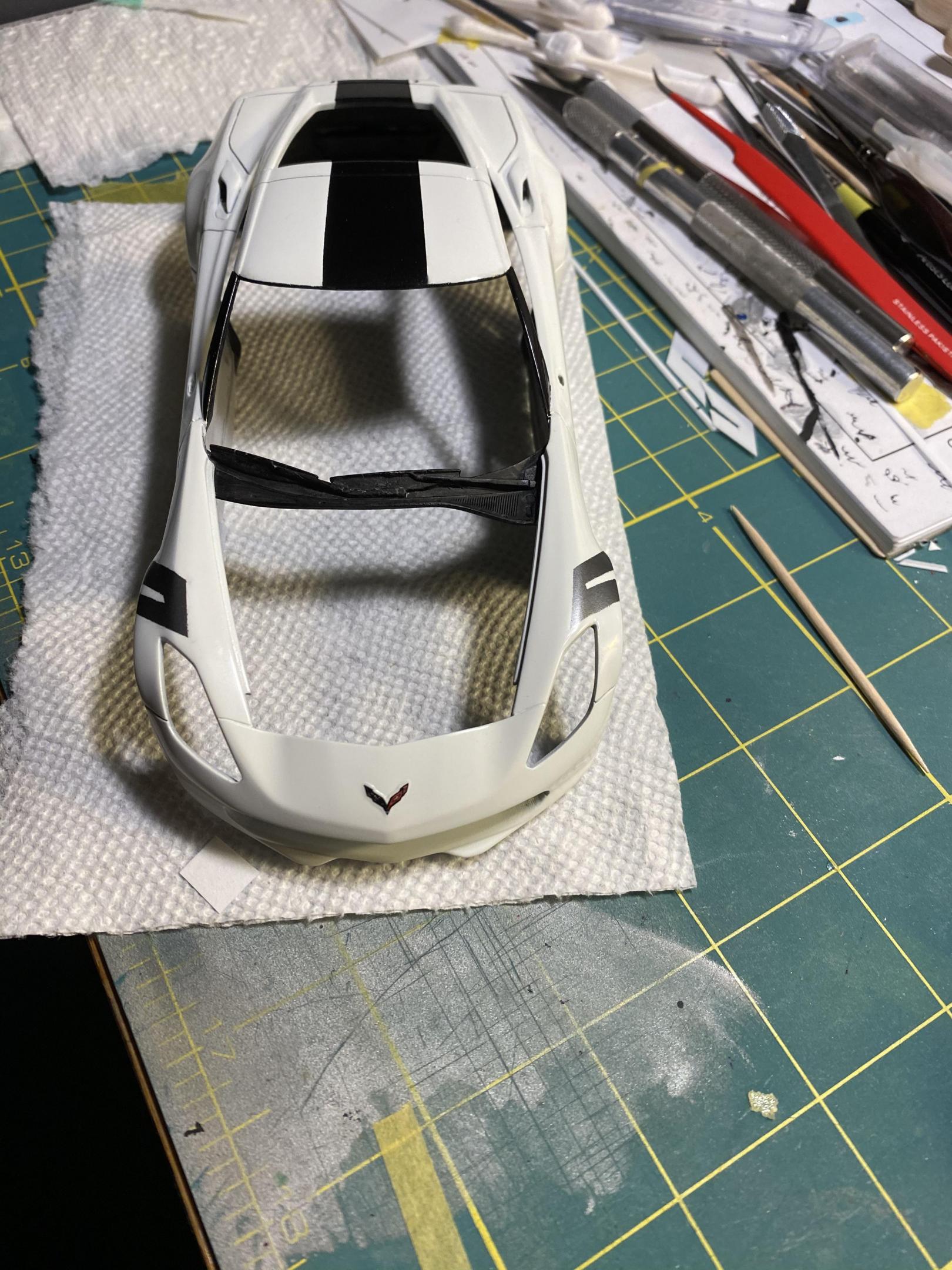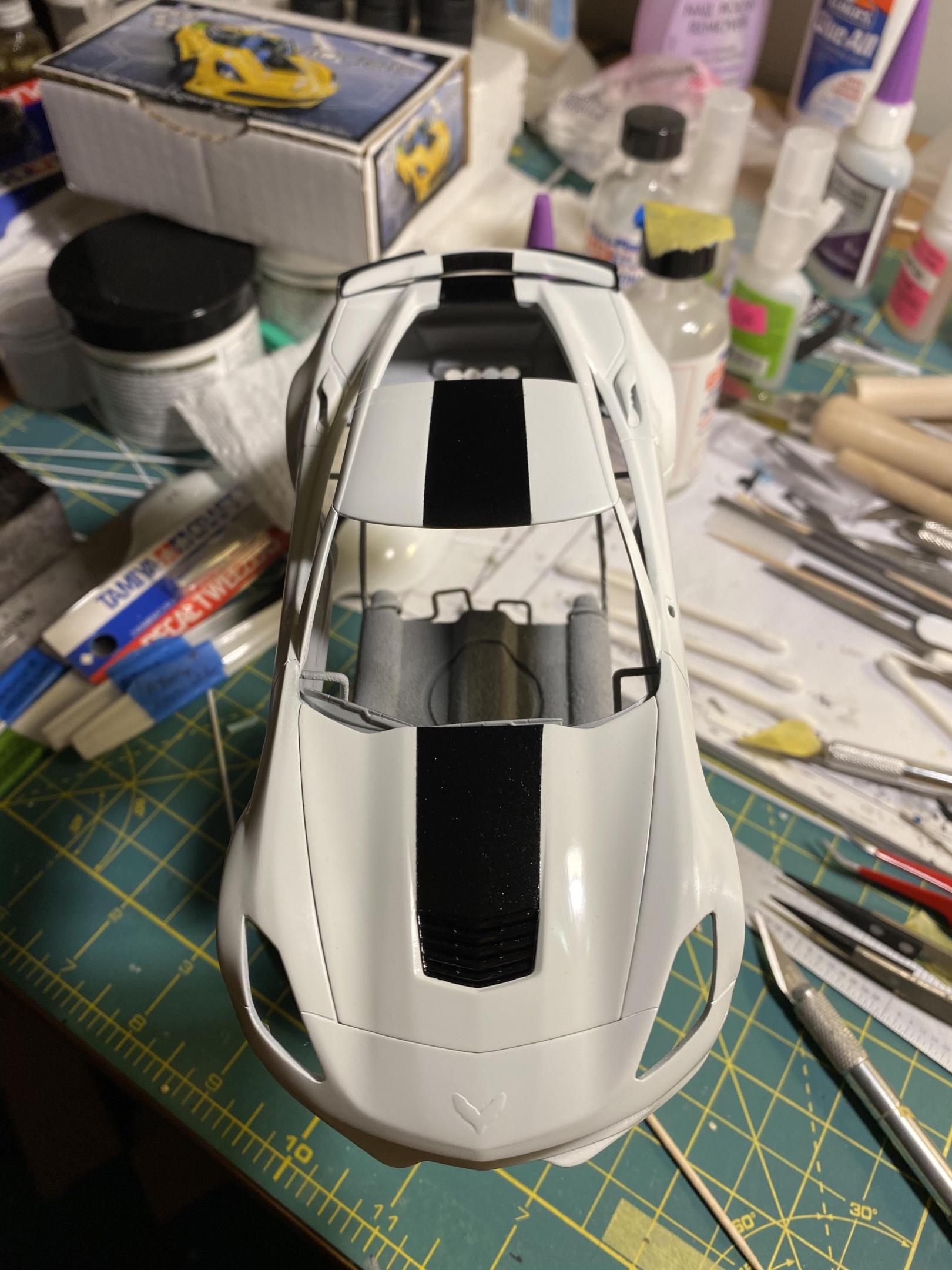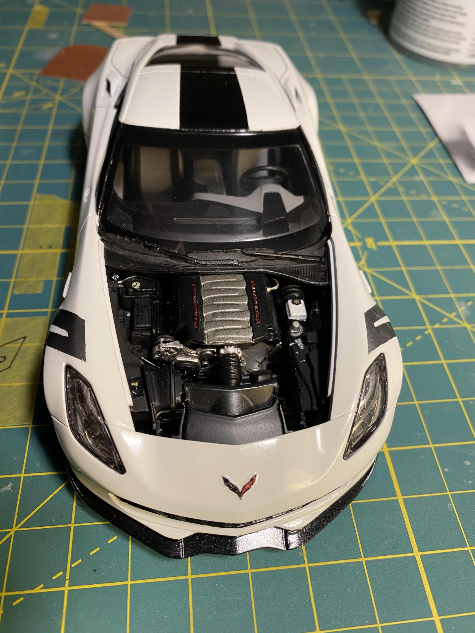 A little more progress on the C7 Grand Sport, measured and centered the hood and rear deck carbon Flash stripe -- added the hood and rear spoiler which i had painted separately to ensure that the stripes aligned, looks pretty close,