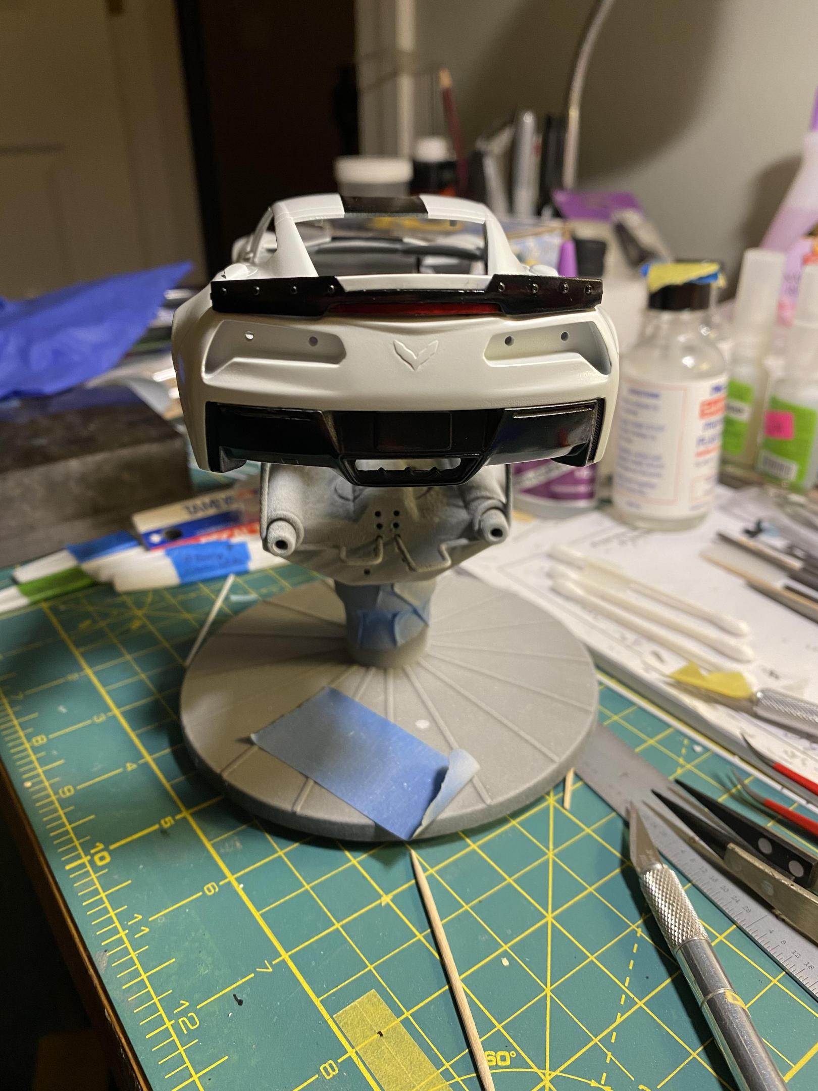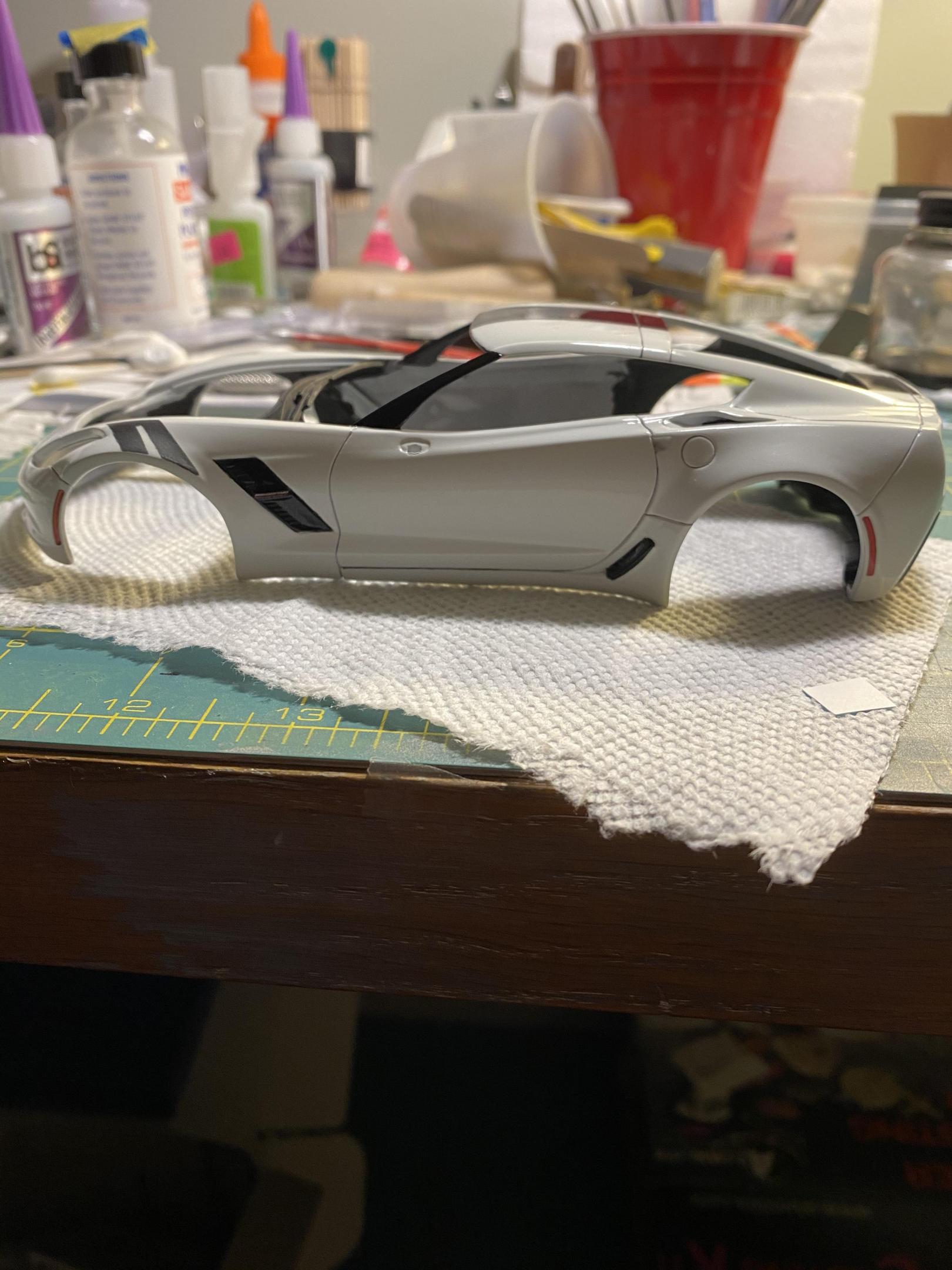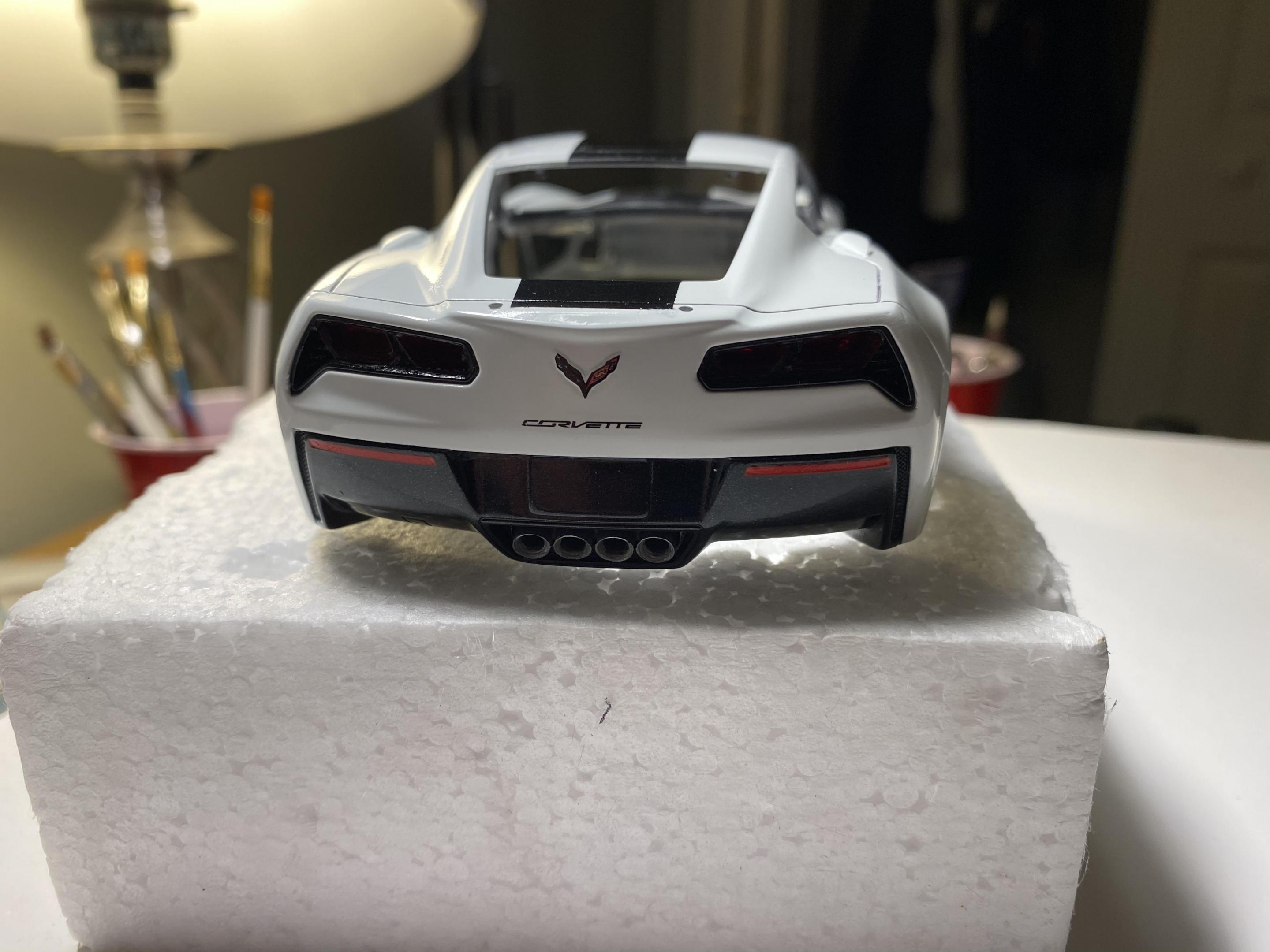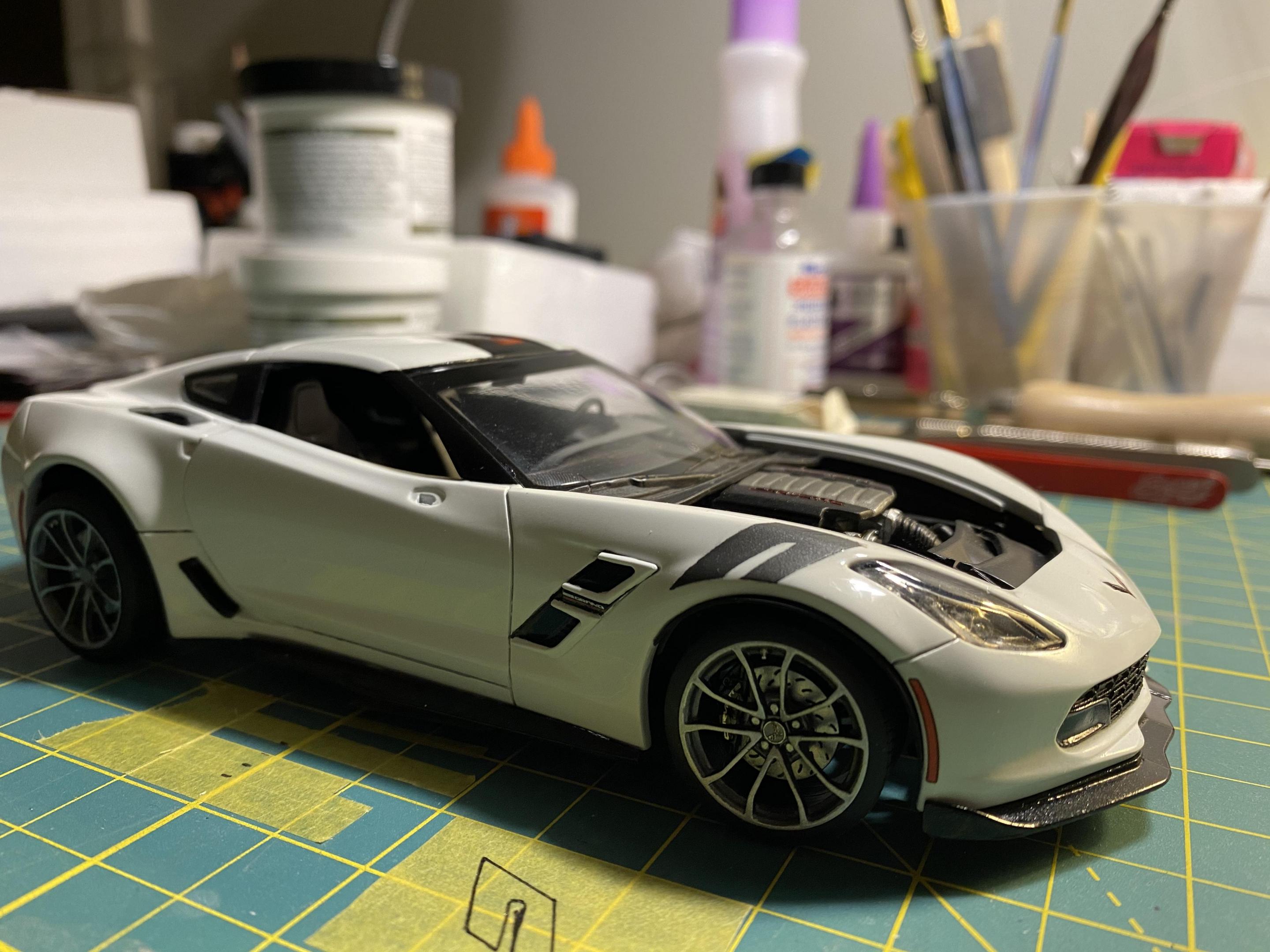 A little more progress on the C7 Grand Sport, measured and centered the hood and rear deck carbon Flash stripe -- added the hood and rear spoiler which i had painted separately to ensure that the stripes aligned, looks pretty close,