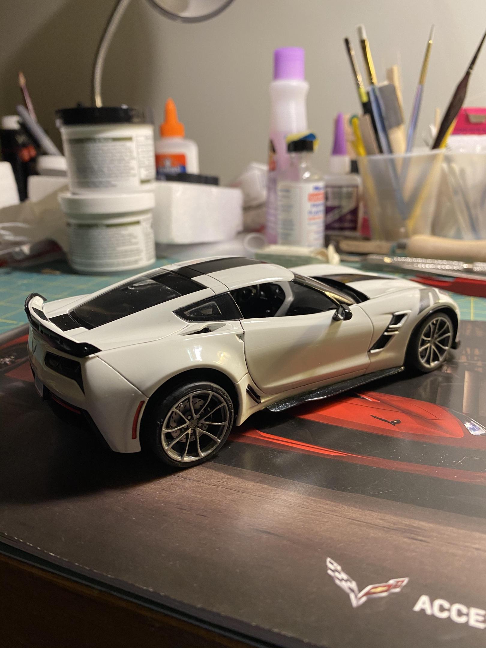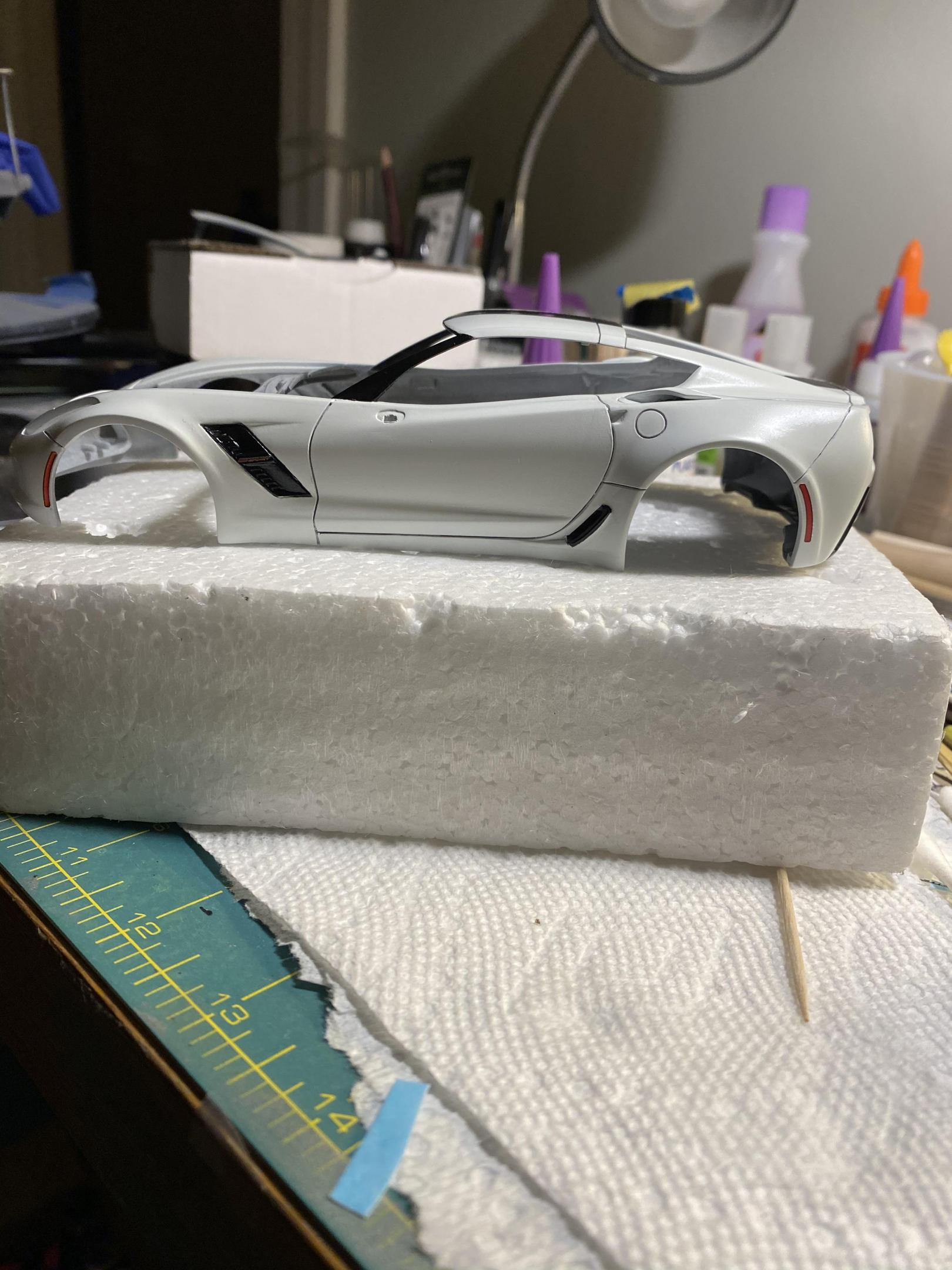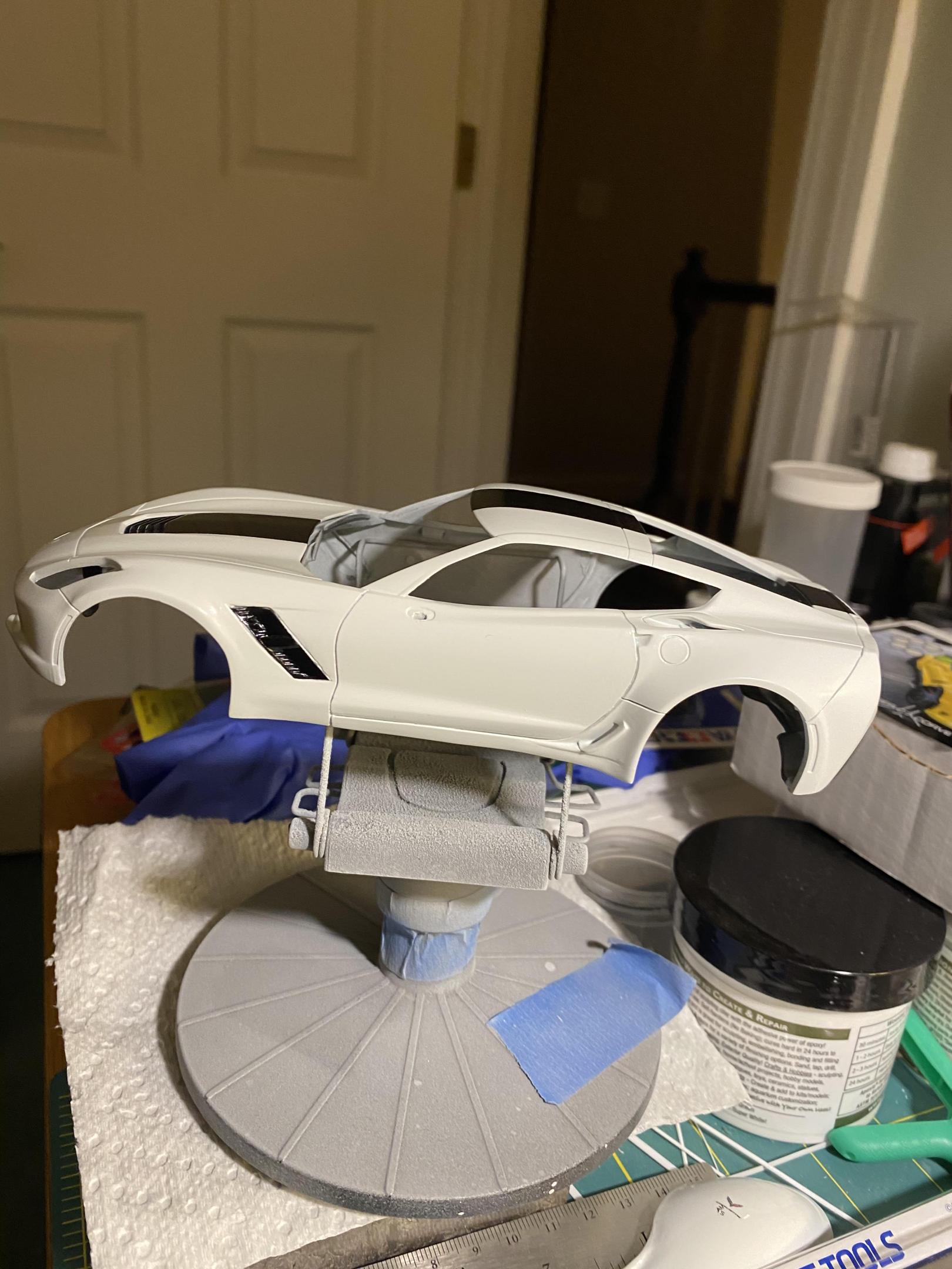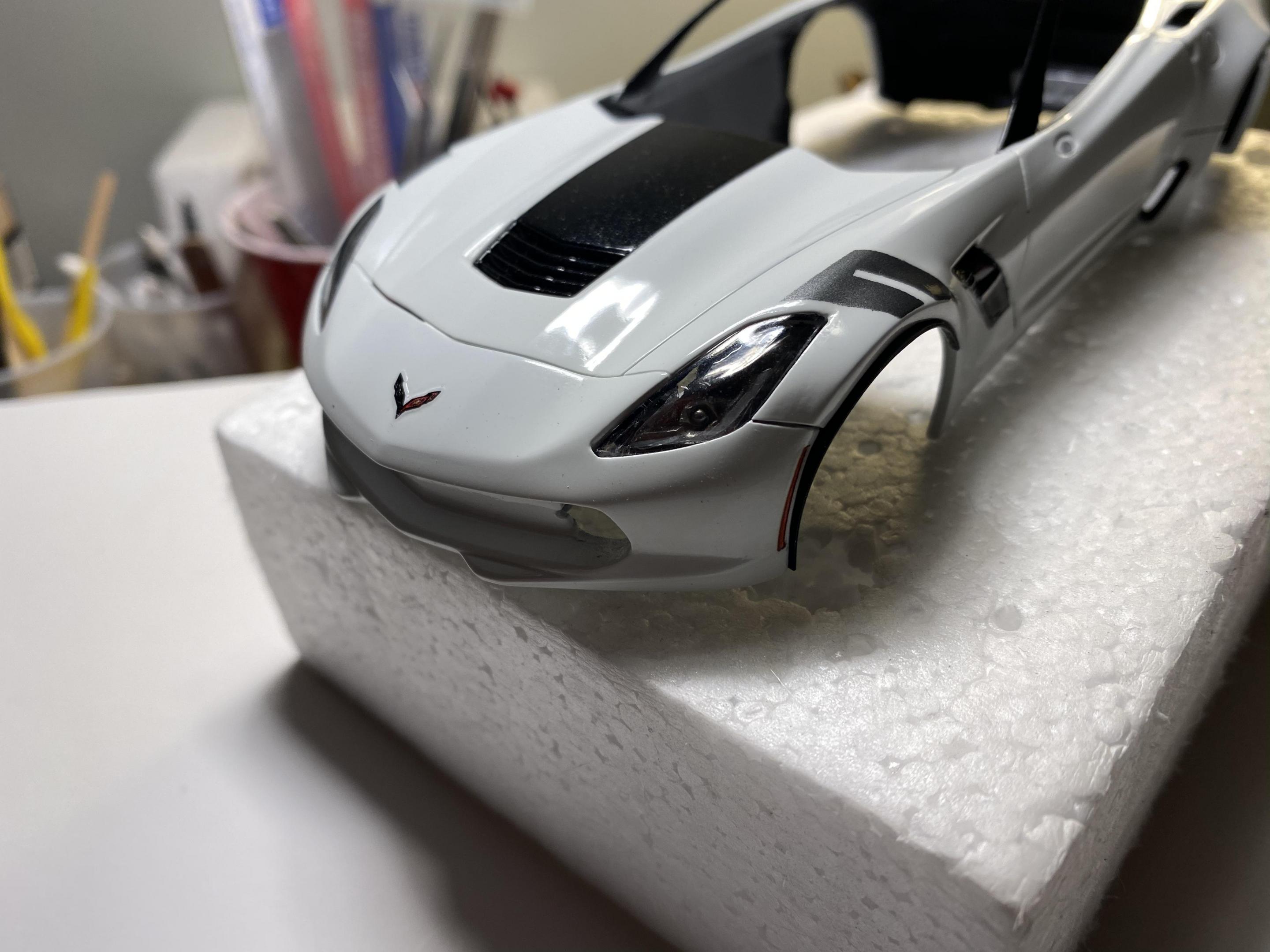 A little more progress on the C7 GS, detail painting completed, added panel line detail with the 'The Detailer' grey and completed the decals. Next is clear coat, and I'm thinking of painting the fender hash stripes after clear coat with Valejo Acrylic Gunmetal --the decals I have don't look quit correct --coming down the home stretch.... Thx for looking
