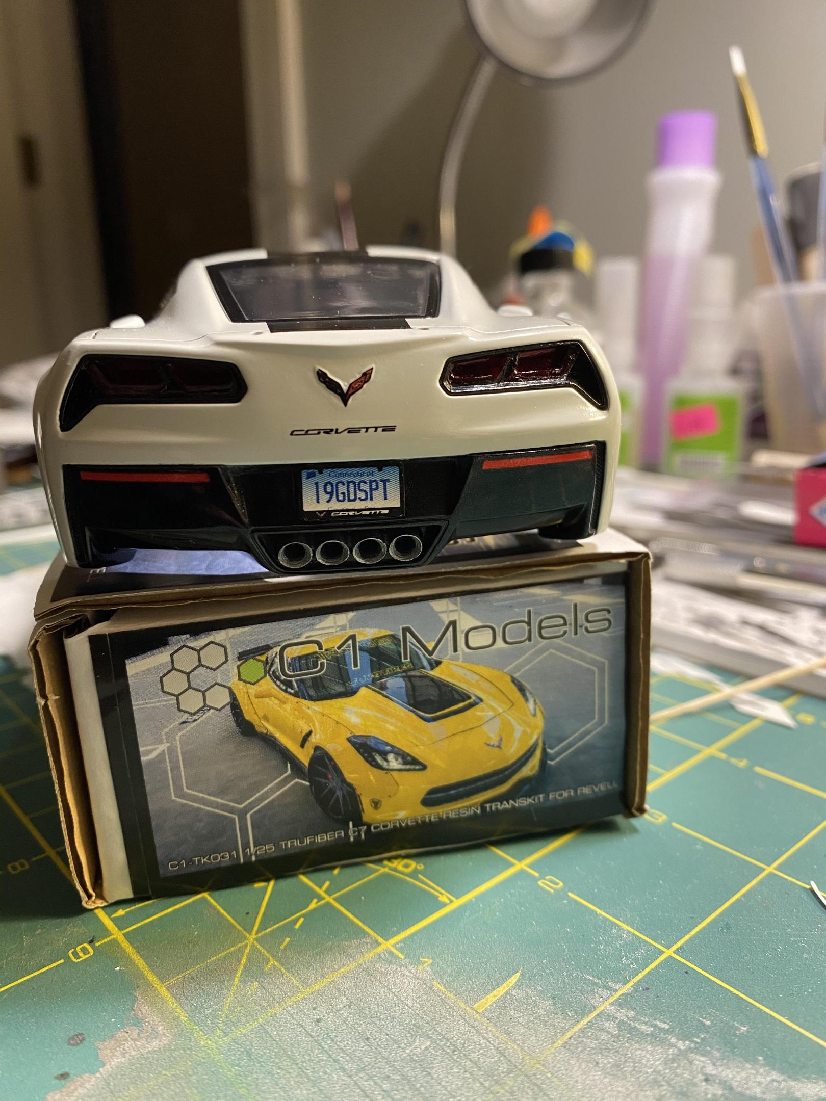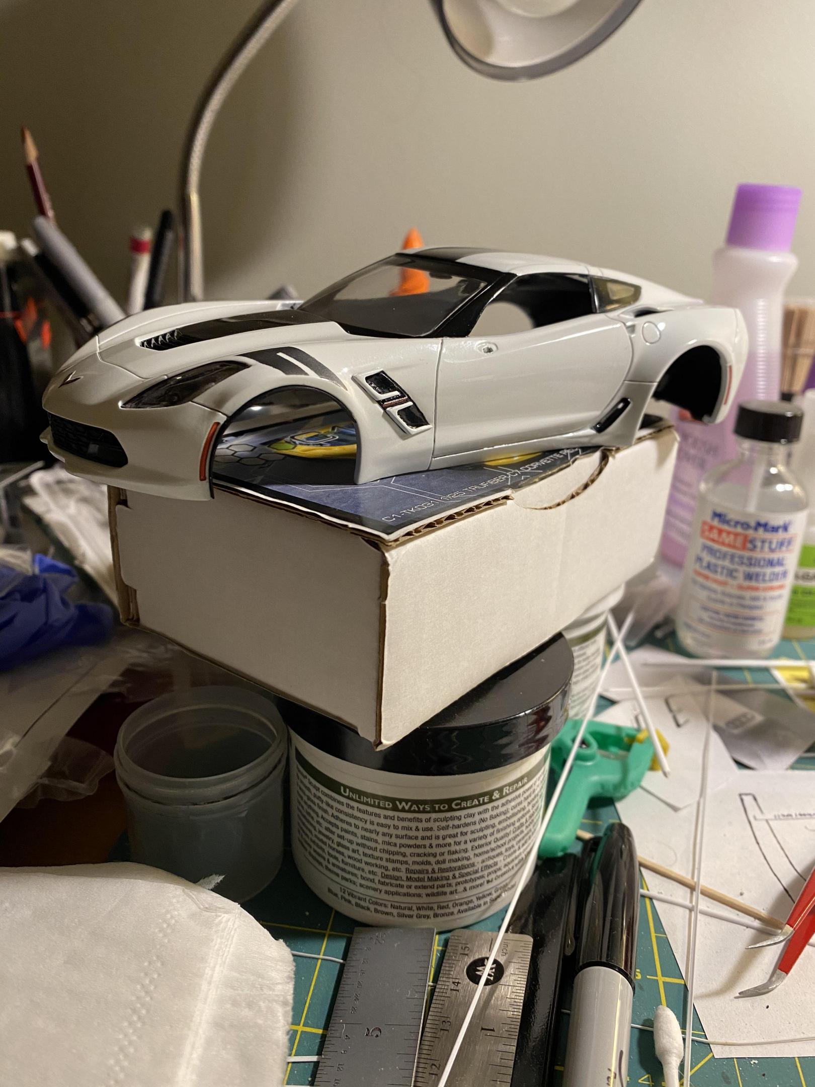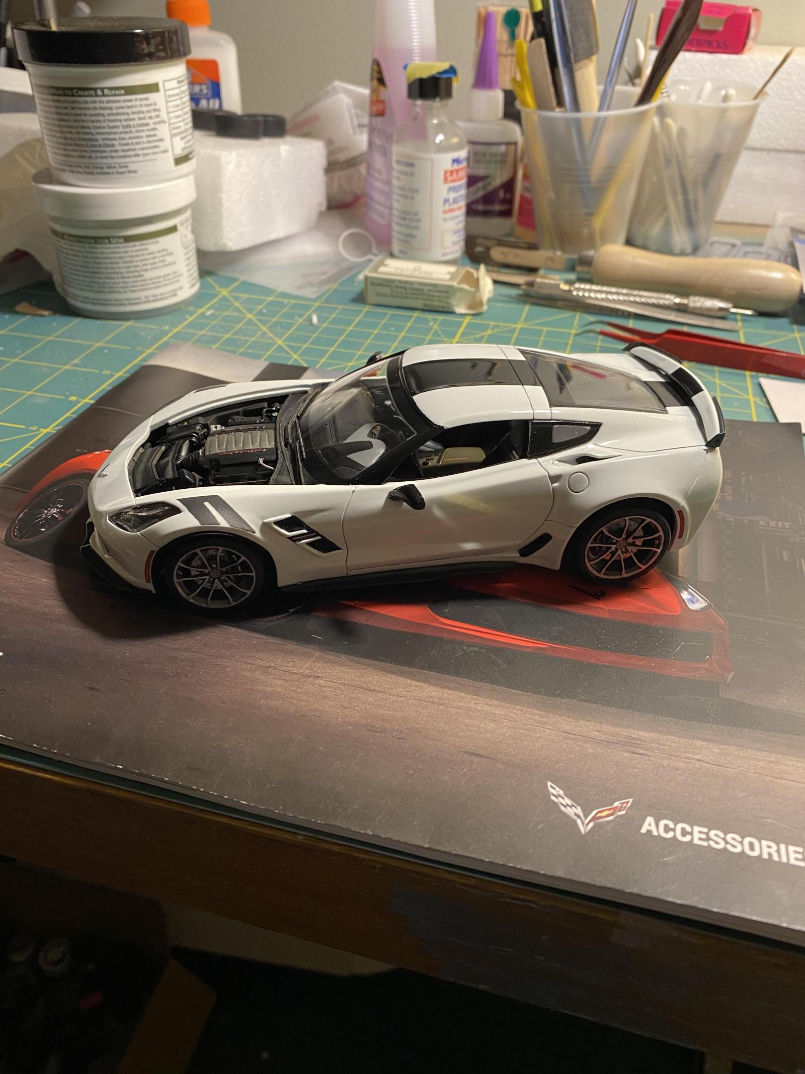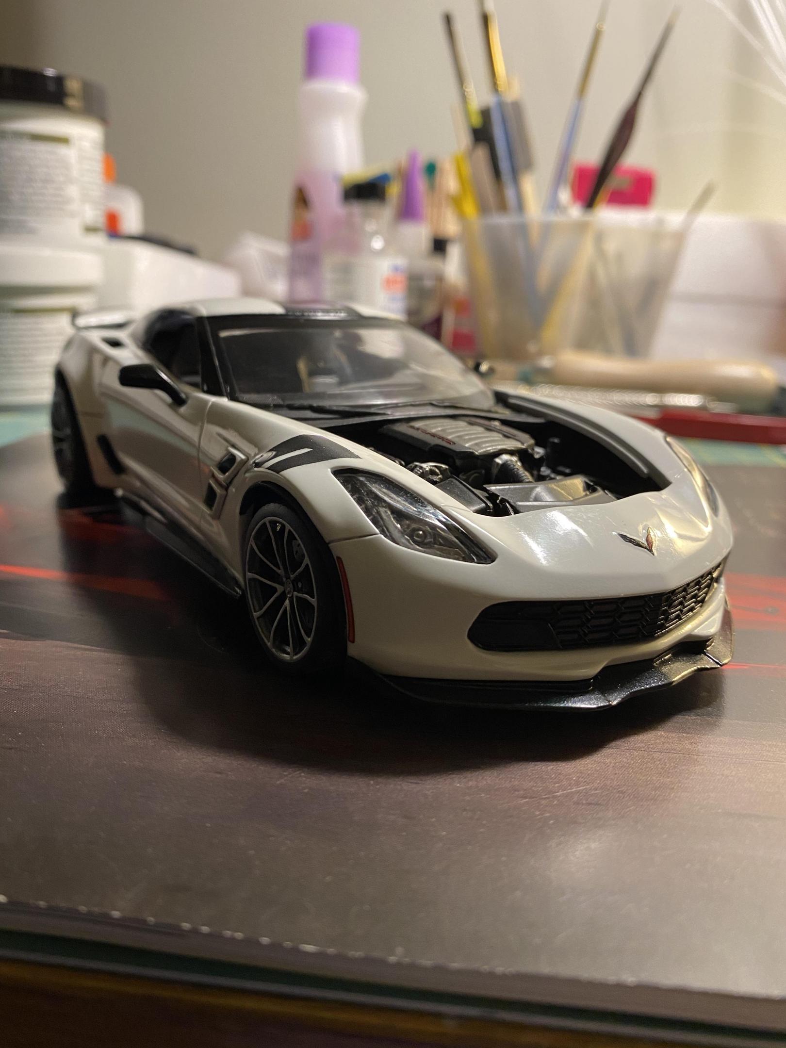 A little more progress on the C7 GS, detail painting completed, added panel line detail with the 'The Detailer' grey and completed the decals. Next is clear coat, and I'm thinking of painting the fender hash stripes after clear coat with Valejo Acrylic Gunmetal --the decals I have don't look quit correct --coming down the home stretch.... Thx for looking