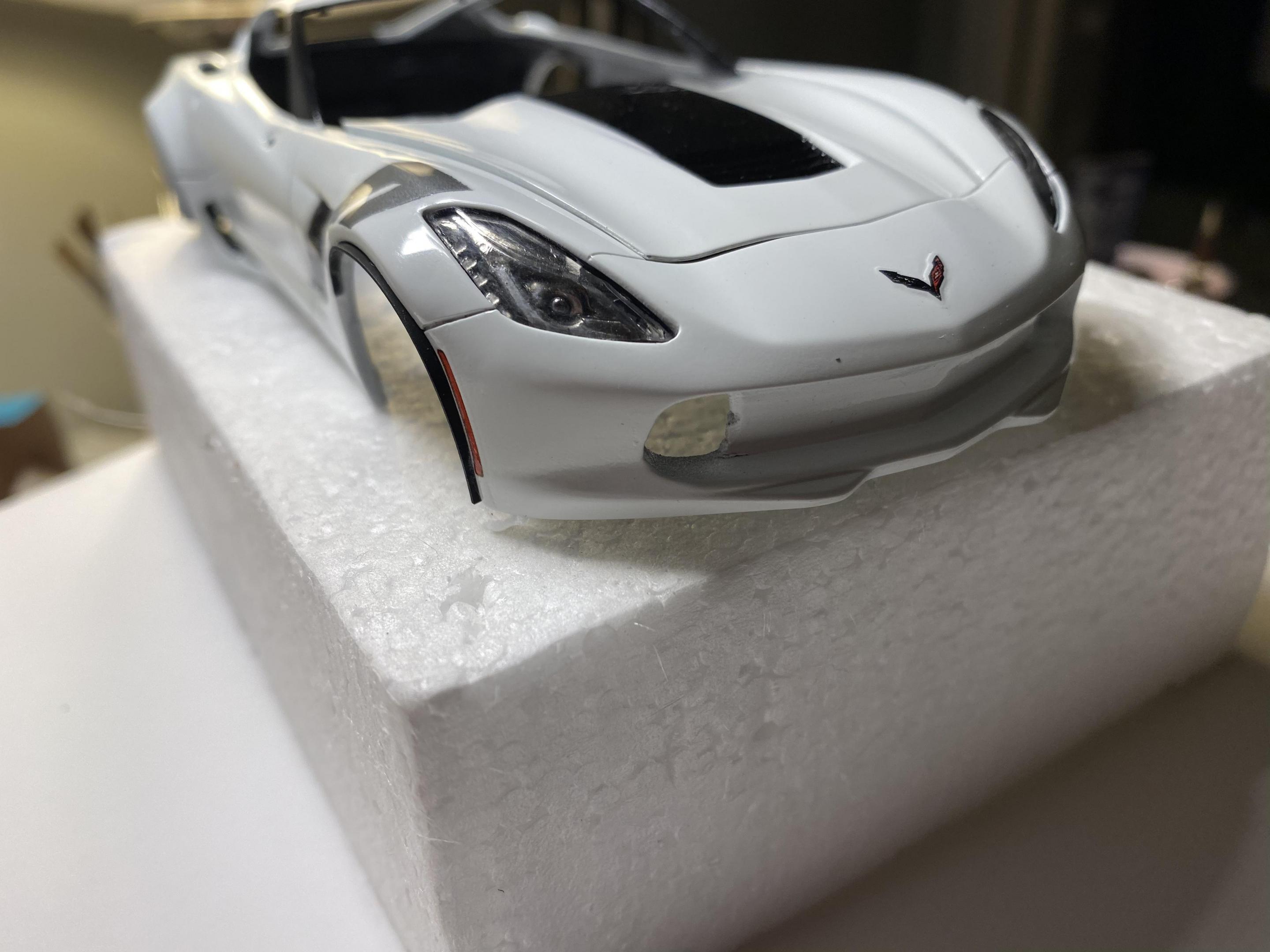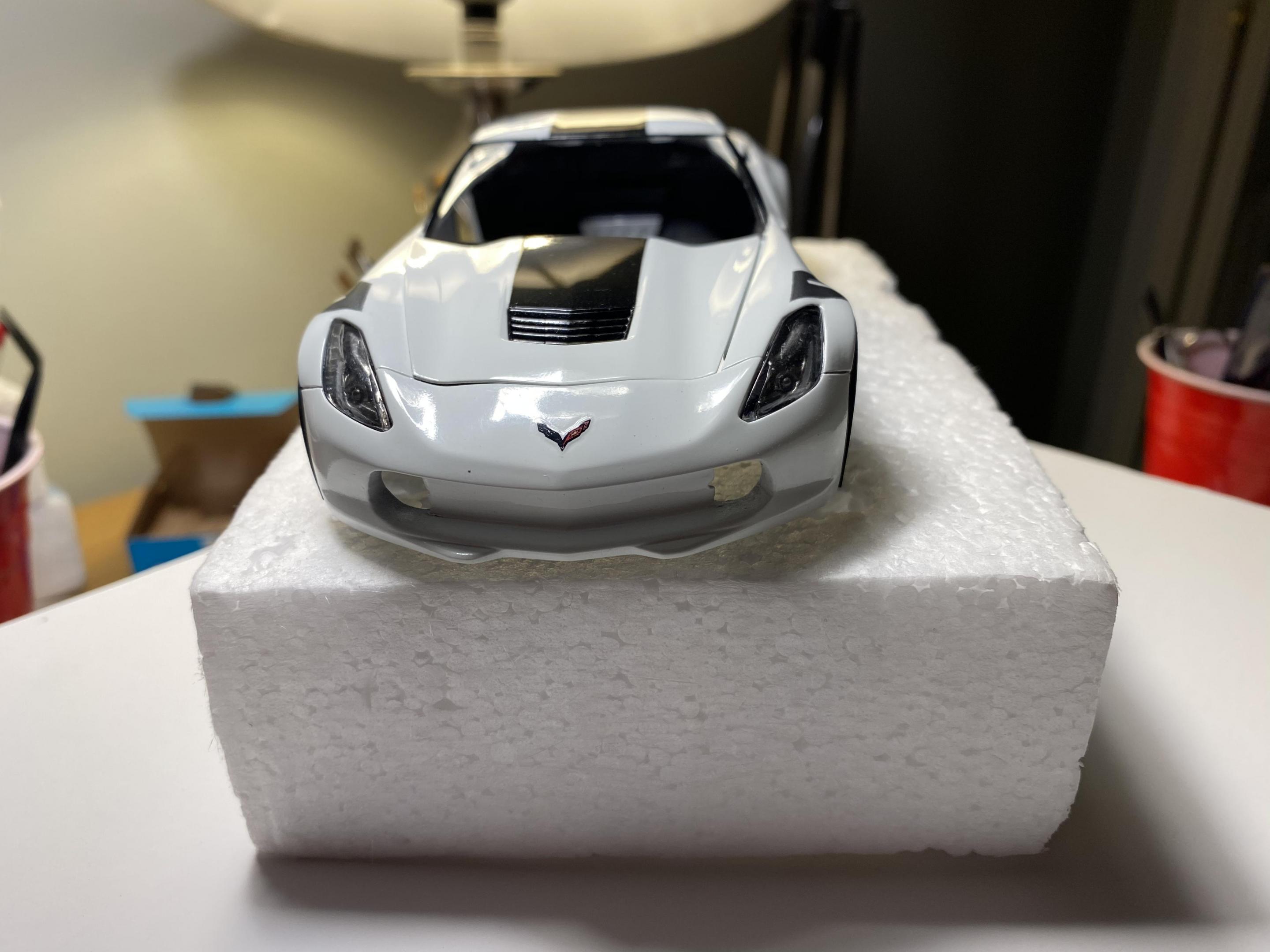 Front view of the C7 -- still need to put the side cove trim pieces on, install the front and rear windows and the front grill. Getting closer --