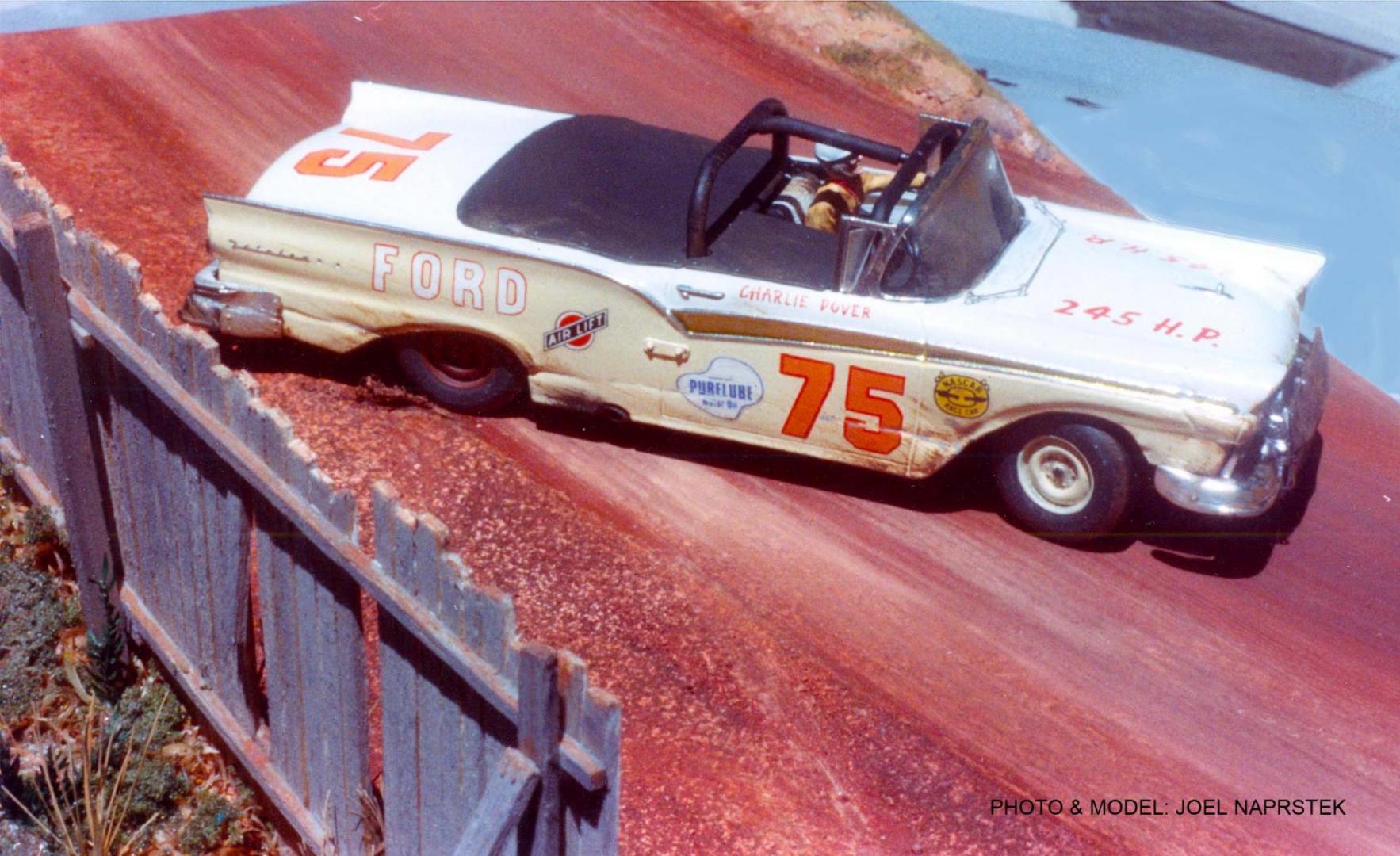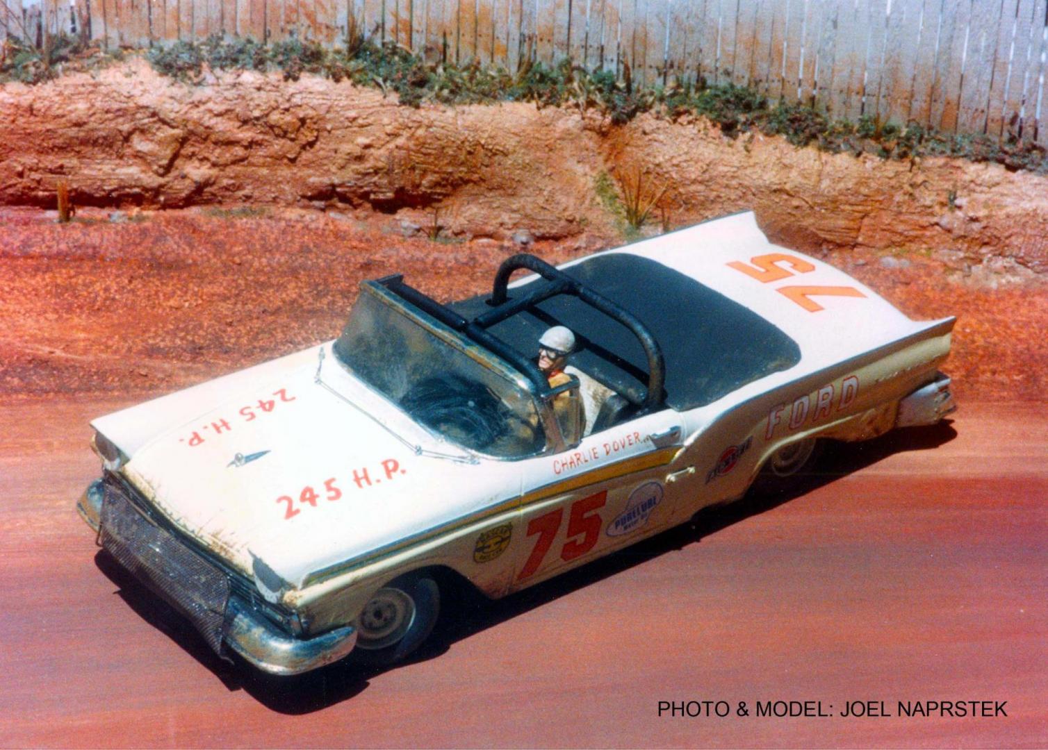 9. Here's another 1/32 scale model that I built back in the late 1980's. At the time I didn't have enough reference to build a replica so I did a fictional car based on what information and pictures I did have. The model started out as a Revell 1/32 scale snapkit. There's no engine in it ... I actually just wanted to build it for a diorama that I built and to photgraph it. A few years later I also used the model photos after I'd come across some better reference material to paint a picture of Curtis Turner and Joe Weatherly in their 1957 Ford NASCAR Convertible Division cars. The model was hand lettered (the logo decals are Fred Cady); model railroad boltheads, screen, Evergreen tubing and sheet plastic used, wheels and tires are from a Palmer 1940 Ford kid. Paint is airpbrush. It was photographed using a homemade pinhole lens on a 35mm camera. Joel