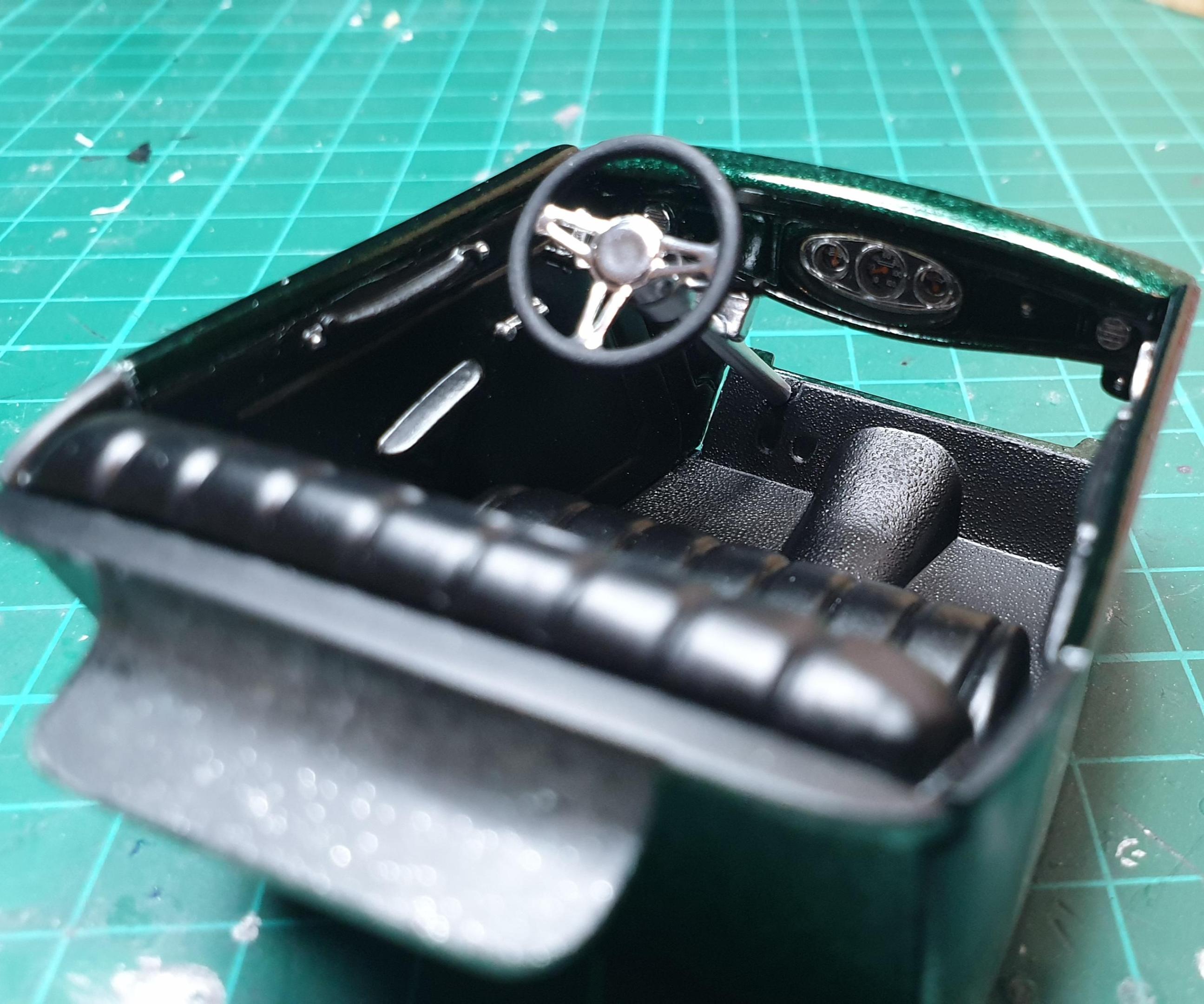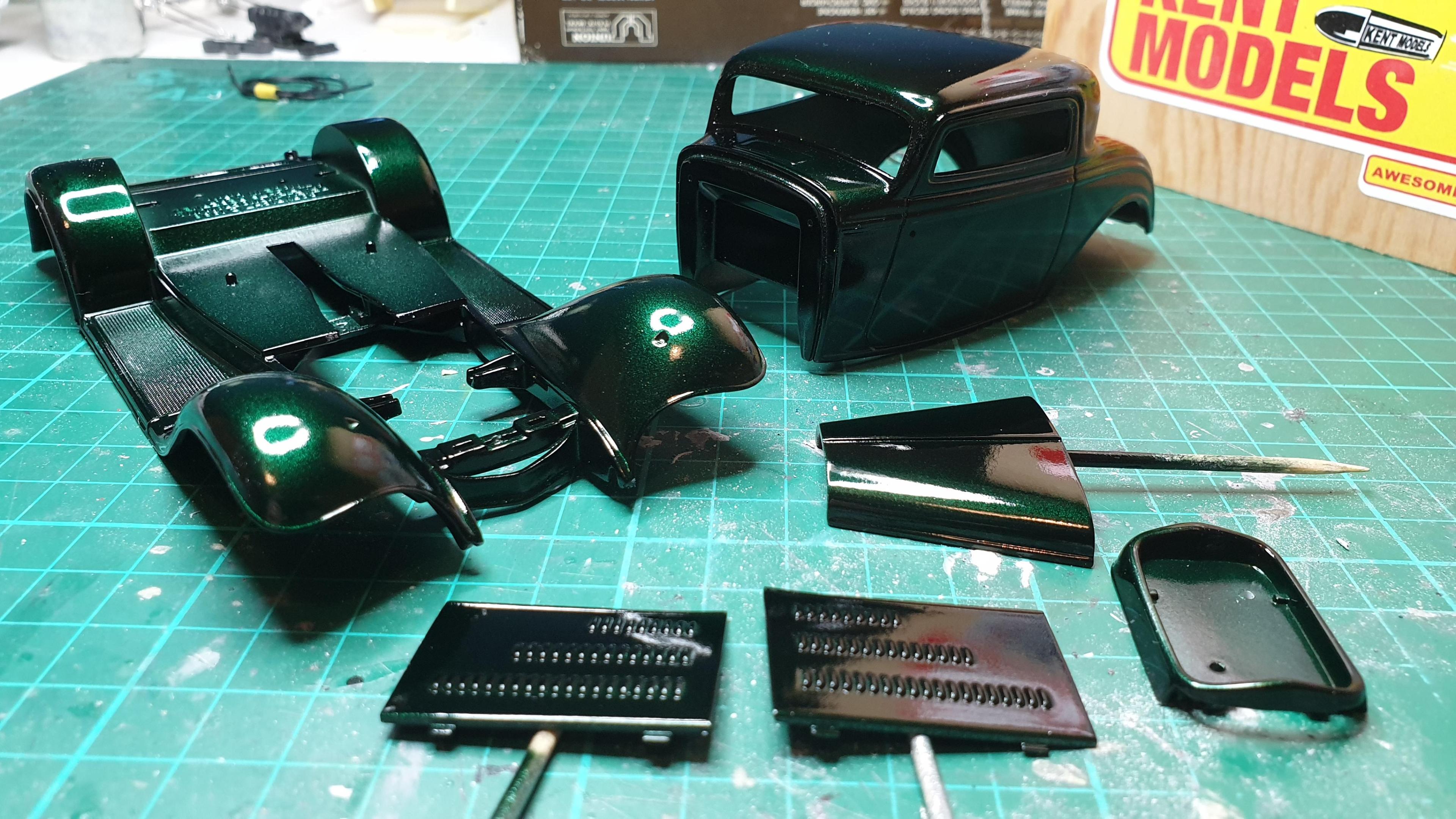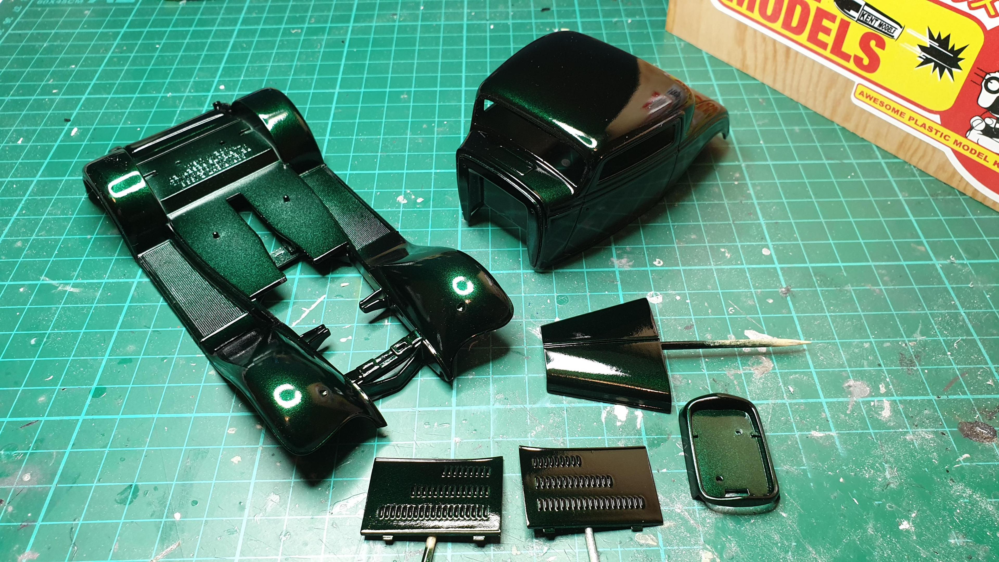 Update Got the body in paint and clear. The paint is dark Emerald green candy over a silver flake base. I have also got all the running gear in paint and the interior together. Just letting the clear harden and the I can polish it and then final assembly. Thanks for looking Lee